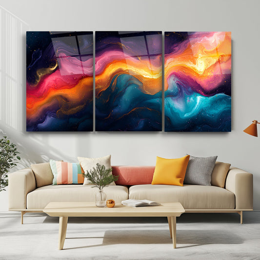 Renkli Mermer Desenler Üçlü Set Cam Tablo