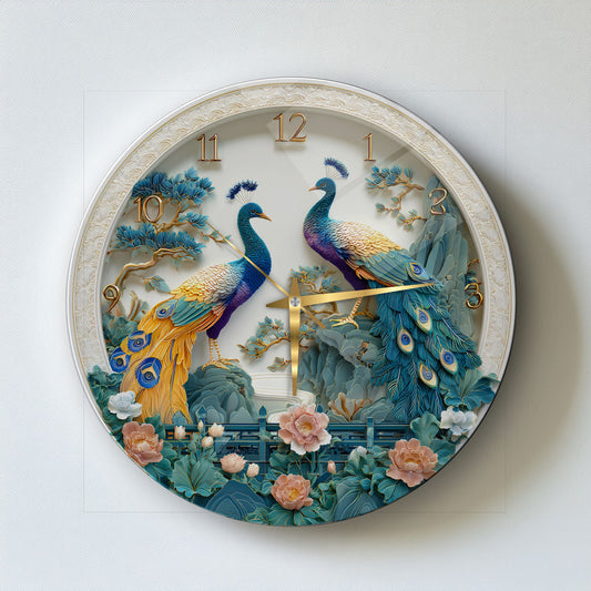 Çiçekli Tavus Kuşu Cam Duvar Saati