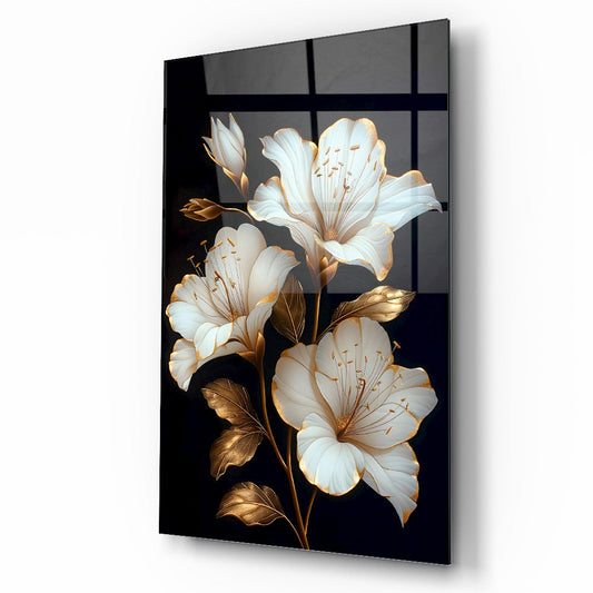 Gold Detaylı Beyaz Çiçekler Cam Tablo