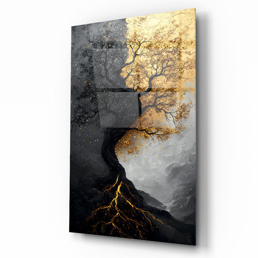 Siyah Beyaz Gold Ağaç Cam Tablo