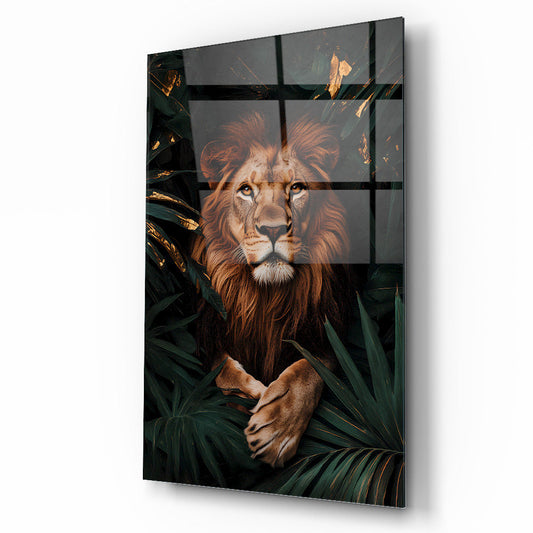 Yapraklar Arasında Aslan Cam Tablo