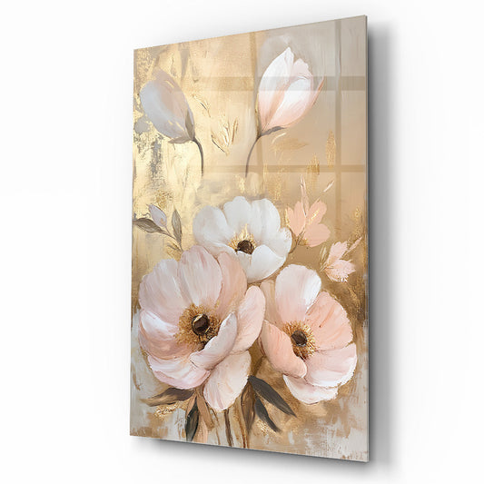 Beyaz Gold Pembe Çiçekler Cam Tablo