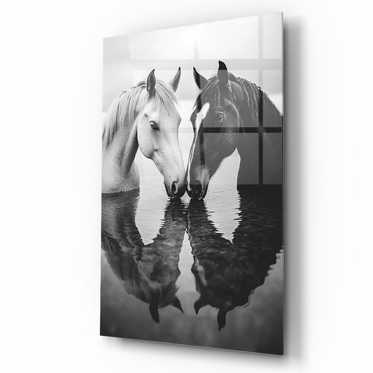 Yansımalı Siyah Beyaz Atlar Cam Tablo