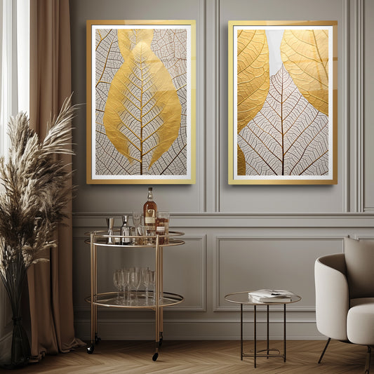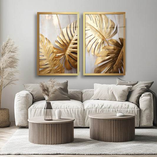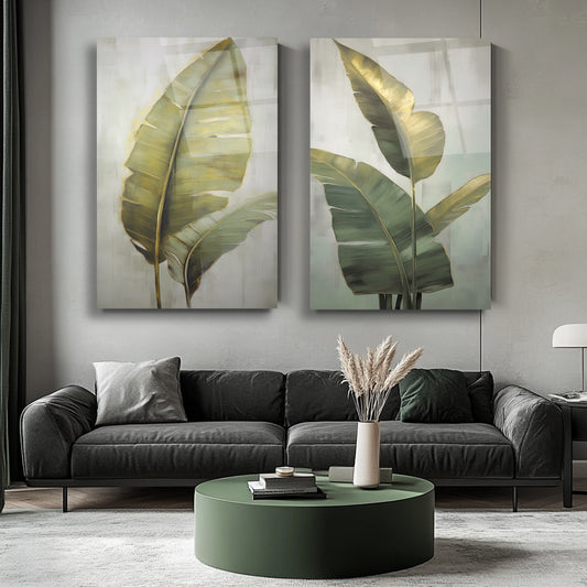 Yeşil Gold Yapraklar İkili Set Cam Tablo