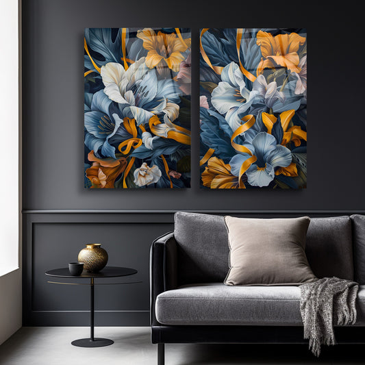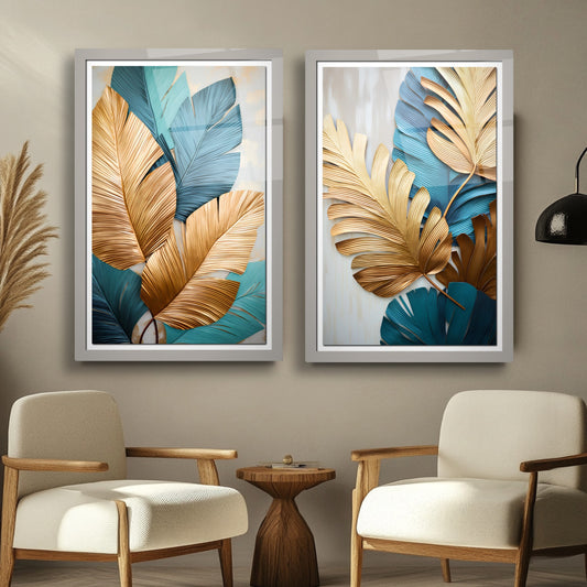 Mavi Gold Yapraklar İkili Set Cam Tablo