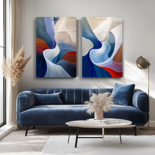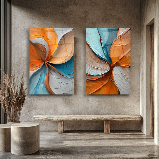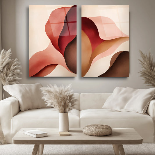 Kırmızı Soyut Yapraklar İkili Set Cam Tablo