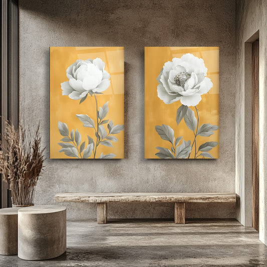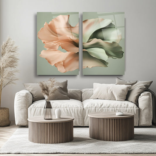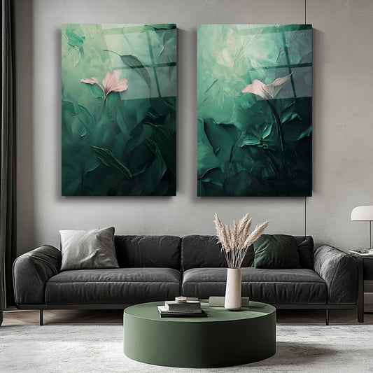 Pembe Yeşil Çiçek İkili Set Cam Tablo