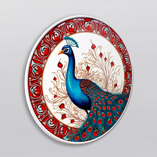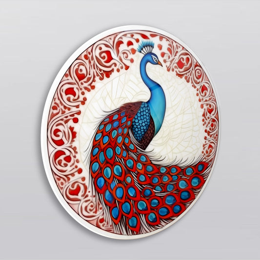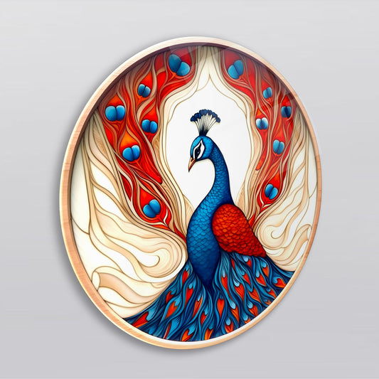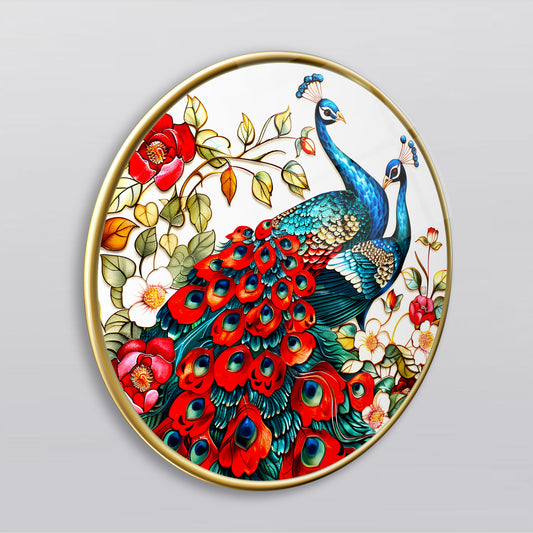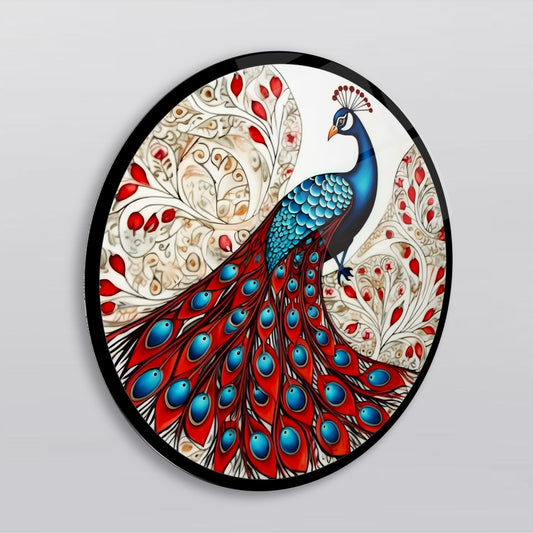 Kırmızı Detaylı Tavus Kuşu Yuvarlak Cam Tablo