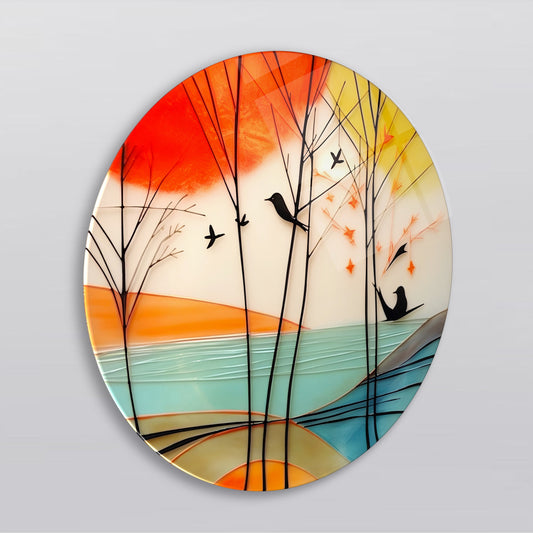 Soyut Gün Batımı ve Kuşlar Yuvarlak Cam Tablo