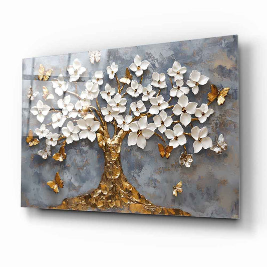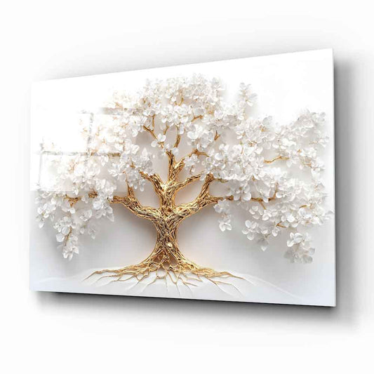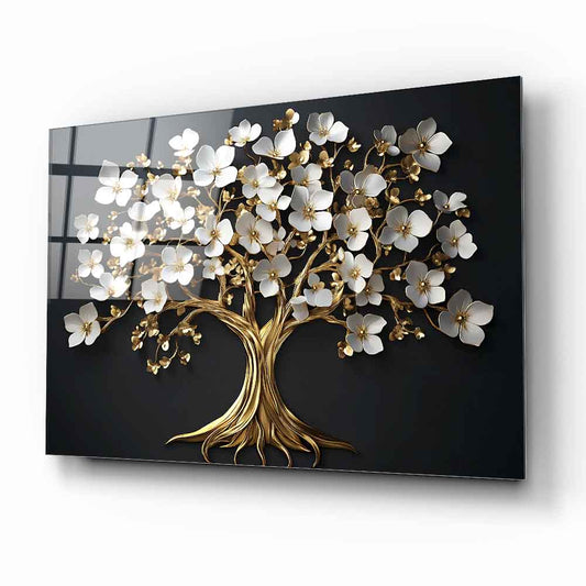 Beyaz Çiçekli Gold Ağaç Cam Tablo