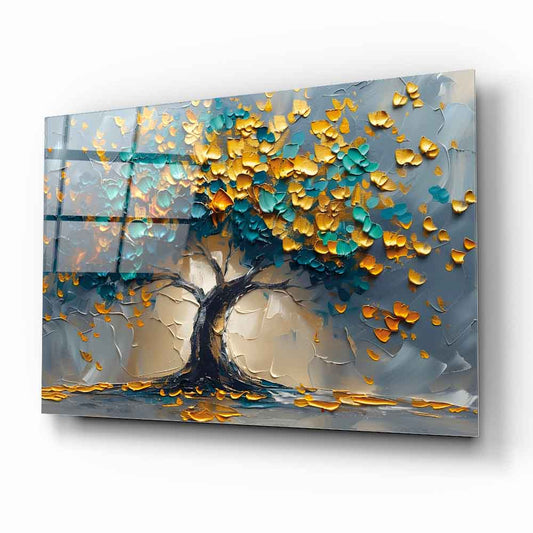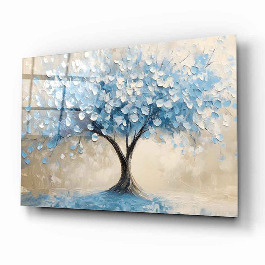 Mavi Yapraklı Hayat Ağacı Cam Tablo