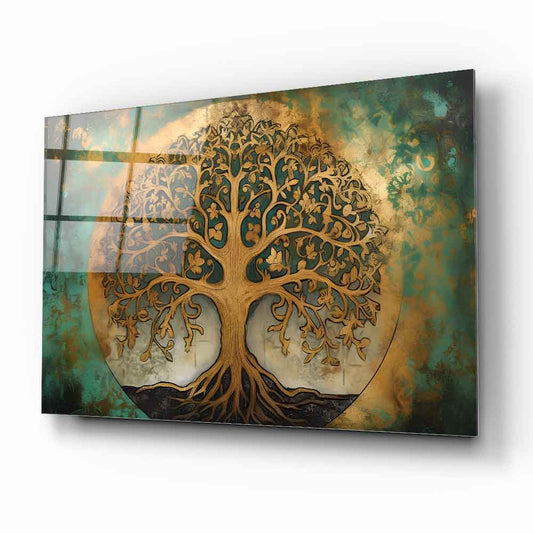Gold Yeşil Detaylı Hayat Ağacı Cam Tablo