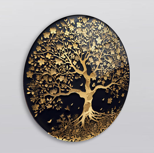 Gold Hayat Ağacı Yuvarlak Cam Tablo