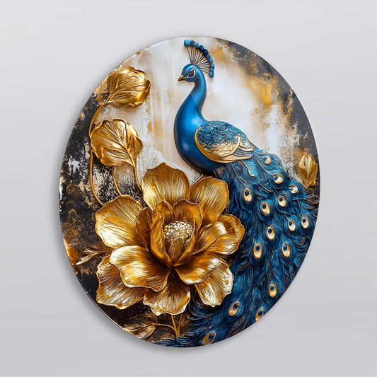 Çiçekli Mavi Tavus Kuşu Yuvarlak Cam Tablo