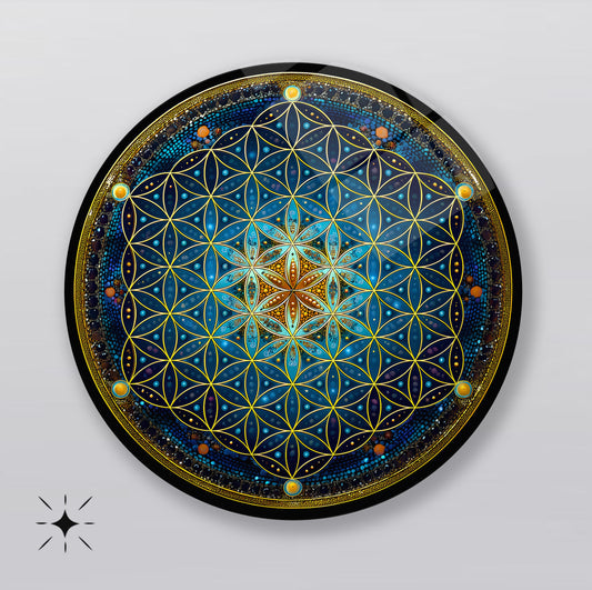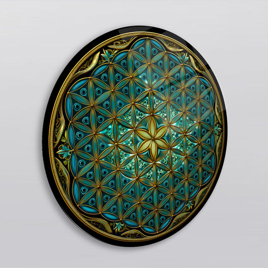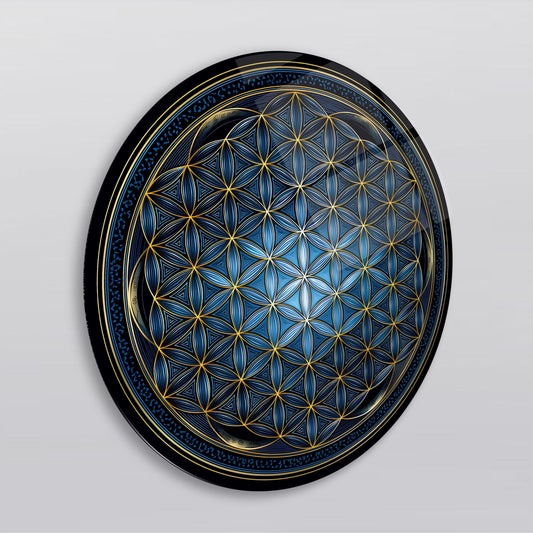 Mavi Gold Yaşam Çiçeği Yuvarlak Cam Tablo