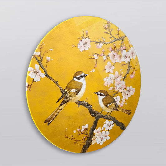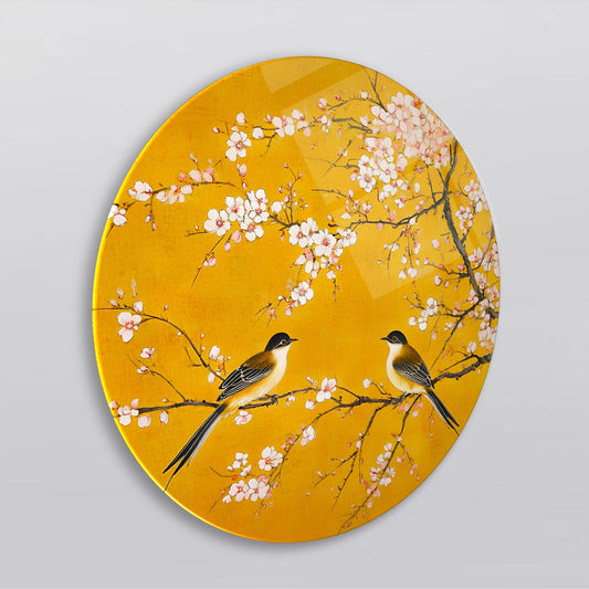 Çiçekler ve Serçe Kuşları Yuvarlak Cam Tablo
