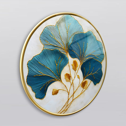 Gold Detay Mavi Çiçekler Yuvarlak Cam Tablo