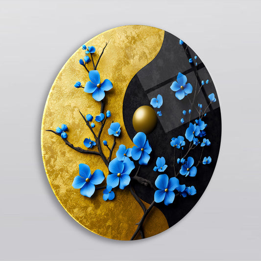 Mavi Gold Çiçekler Yuvarlak Cam Tablo