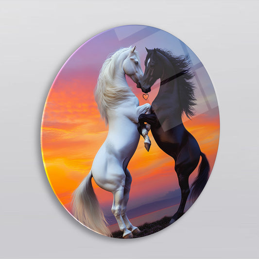 Siyah Beyaz Atlar Yuvarlak Cam Tablo