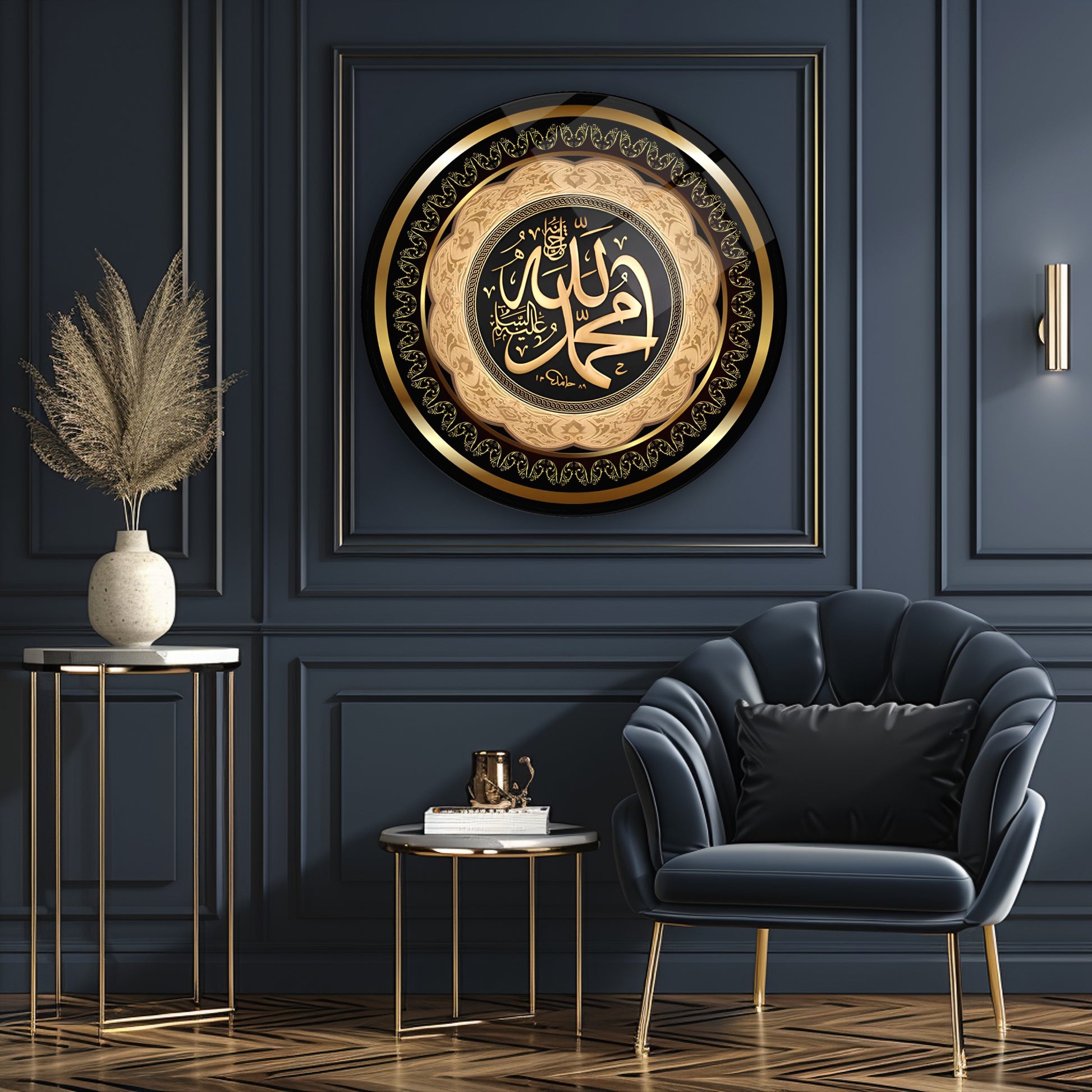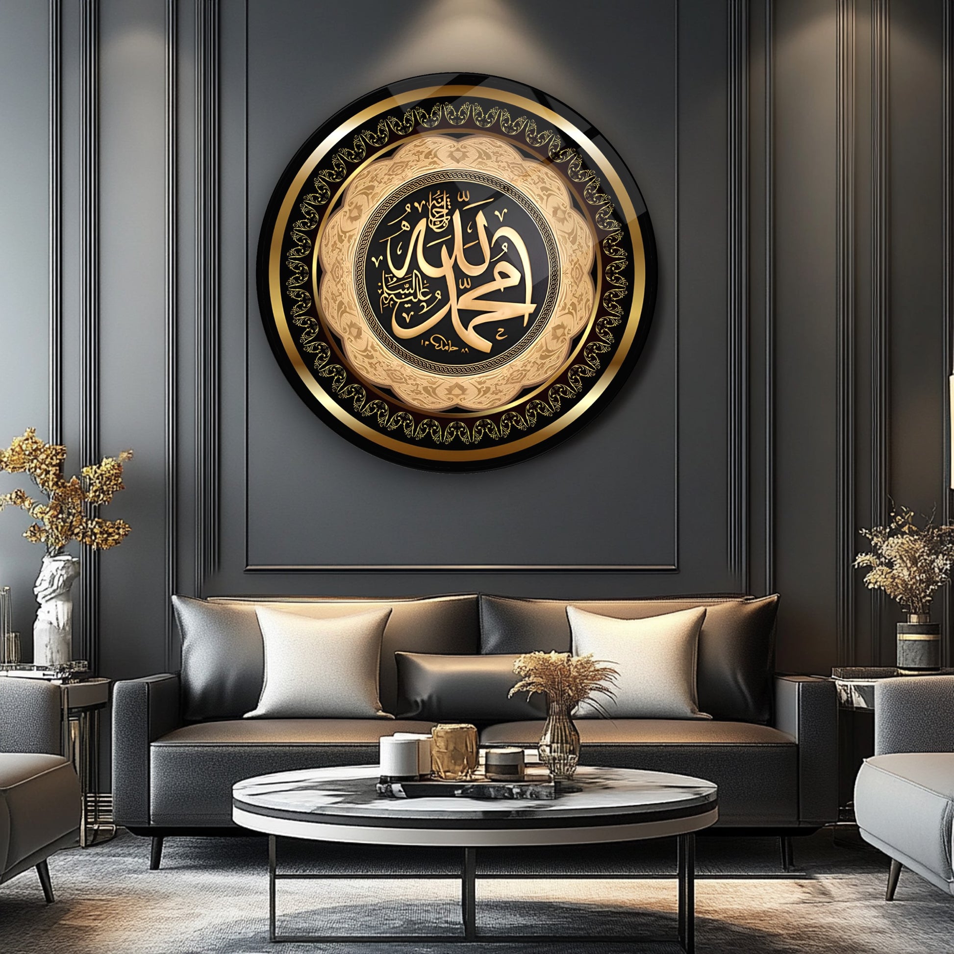 Allah Muhammed Lafzı Dini Yuvarlak Cam Tablo