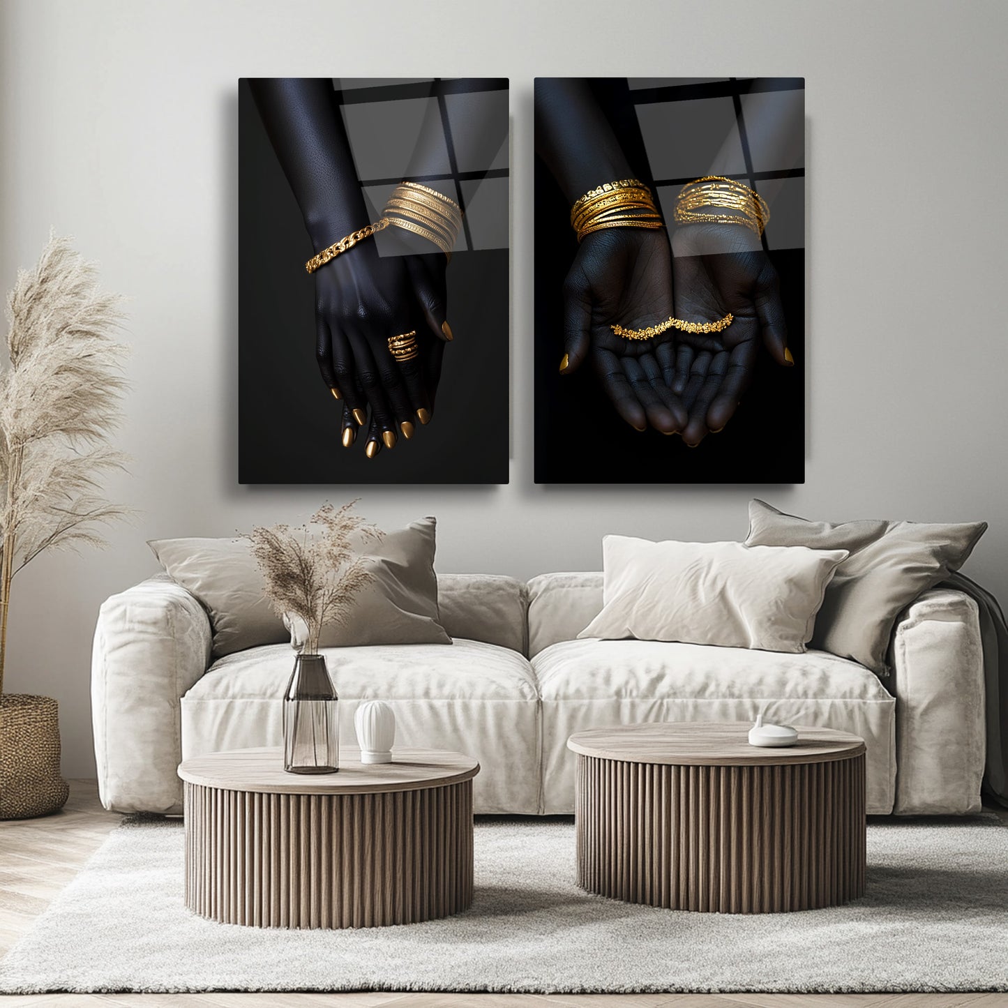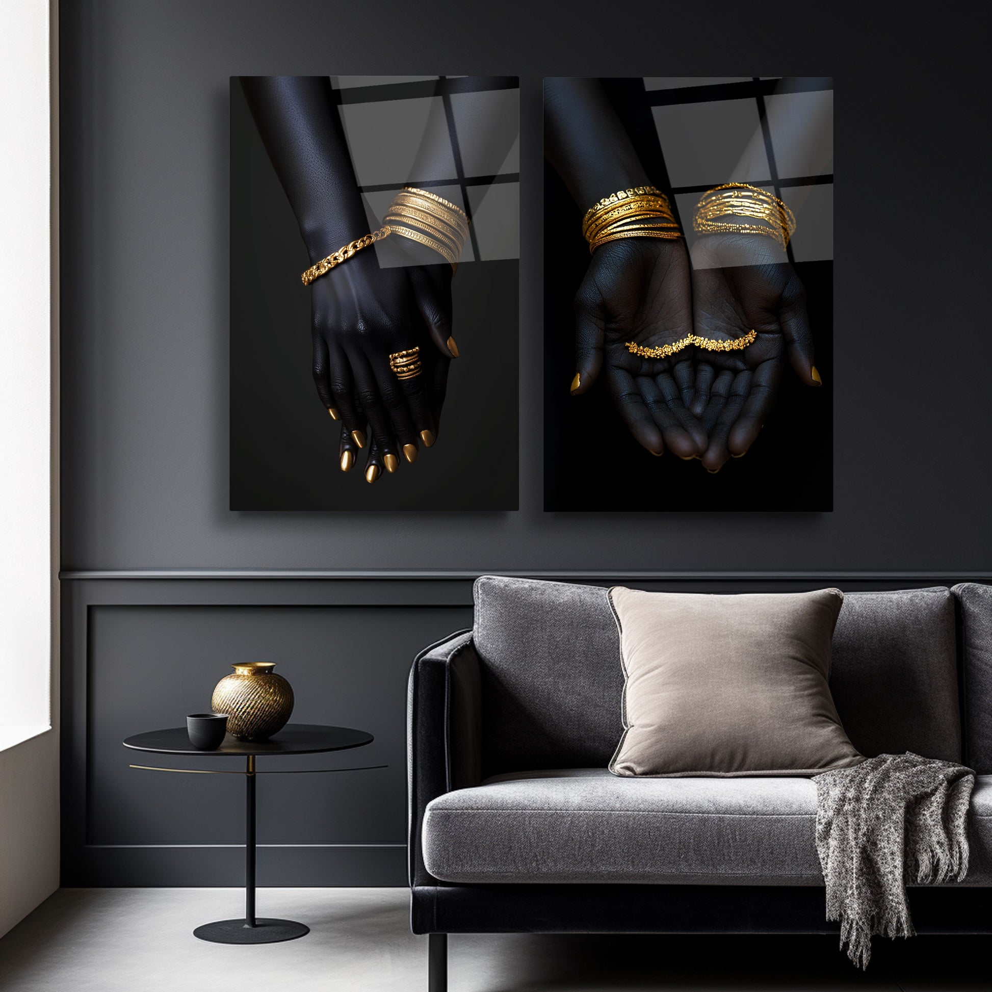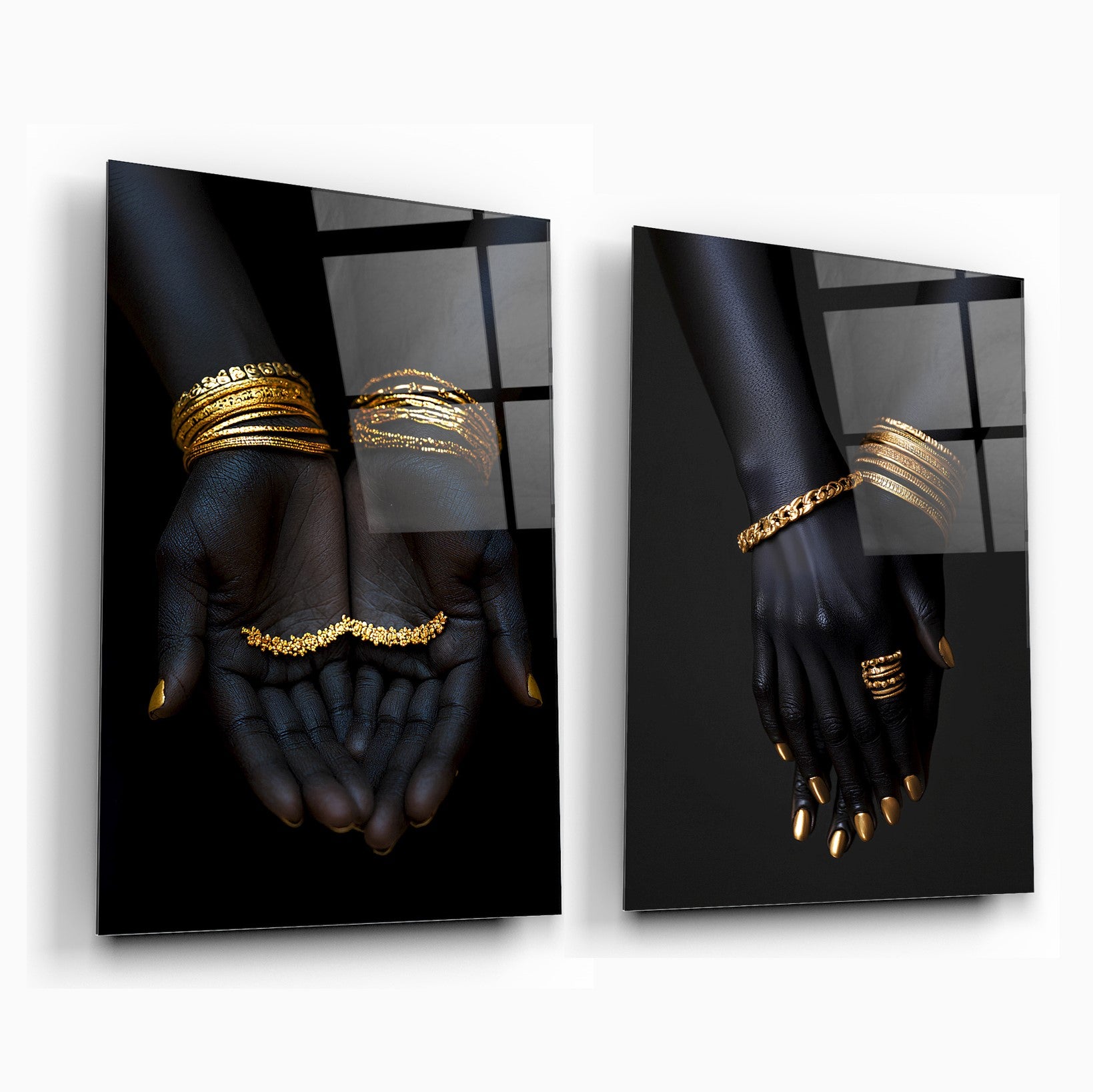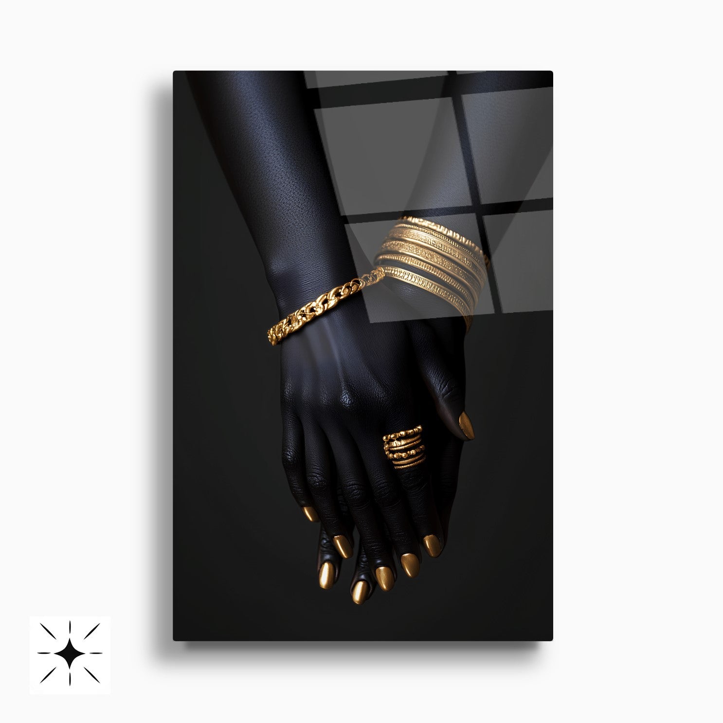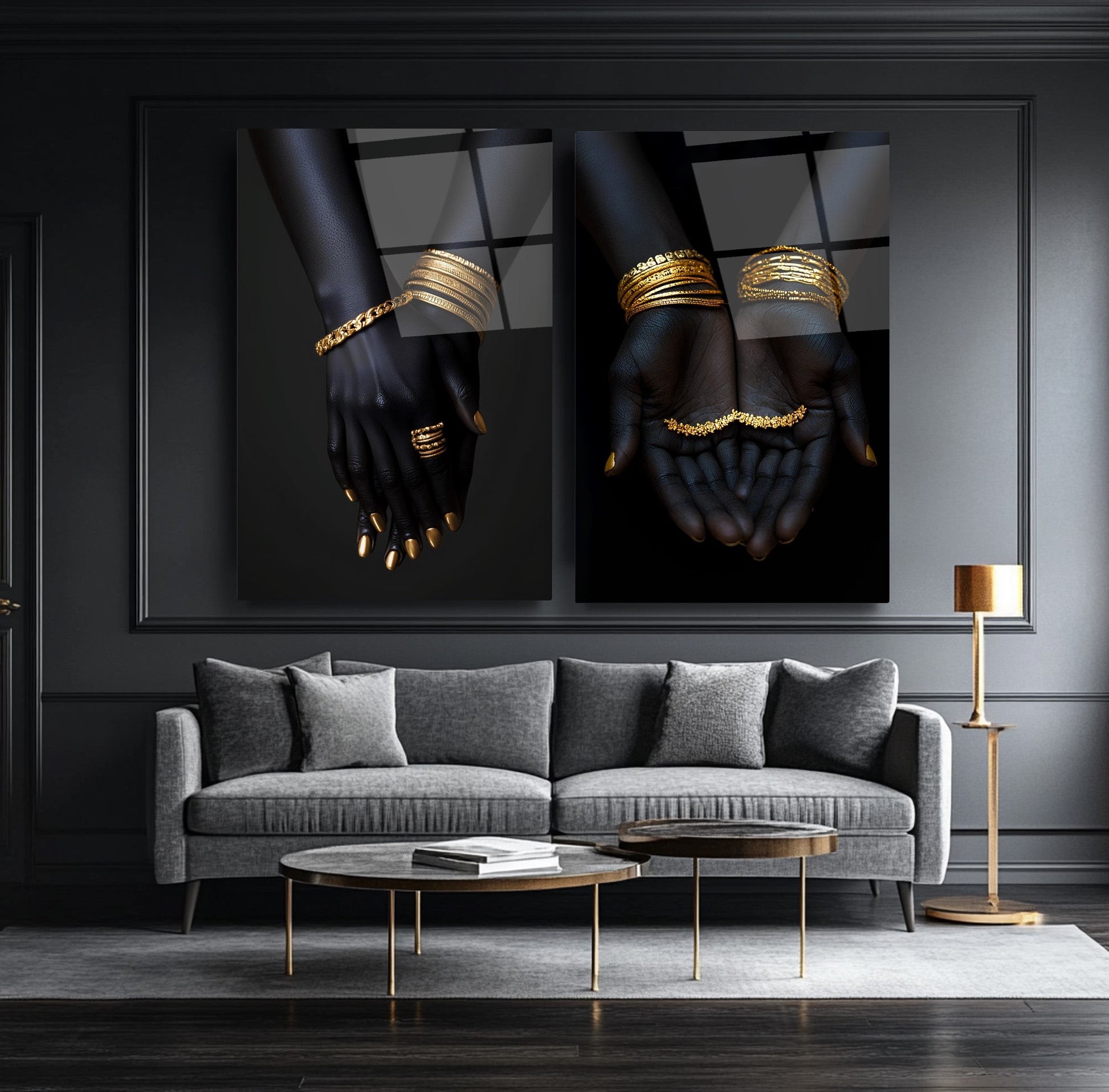 Afrika’nın zarif ruhunu ve altın ışıltısını buluşturan bu mega boy ikili cam tablo seti, siyahi Afrikalı kadının asaletini ve zarafetini güçlü bir şekilde yansıtır. Altın mücevherli bilezik detaylarıyla zenginleştirilmiş bu tasarım, etnik sanatın modern yorumu olarak yaşam alanlarına karakter kazandırır. UV baskı tekniğiyle canlılığını uzun yıllar koruyan bu kırılmaz cam tablolar, özellikle salon, ofis ya da sanatsal konseptli mekanlar için etkileyici bir odak noktası sunar. Derin anlamlar taşıyan duruşu ve şıklığıyla CamDeko imzası taşıyan bu tablo seti, stil sahibi dekorasyonların vazgeçilmezi olmaya aday.