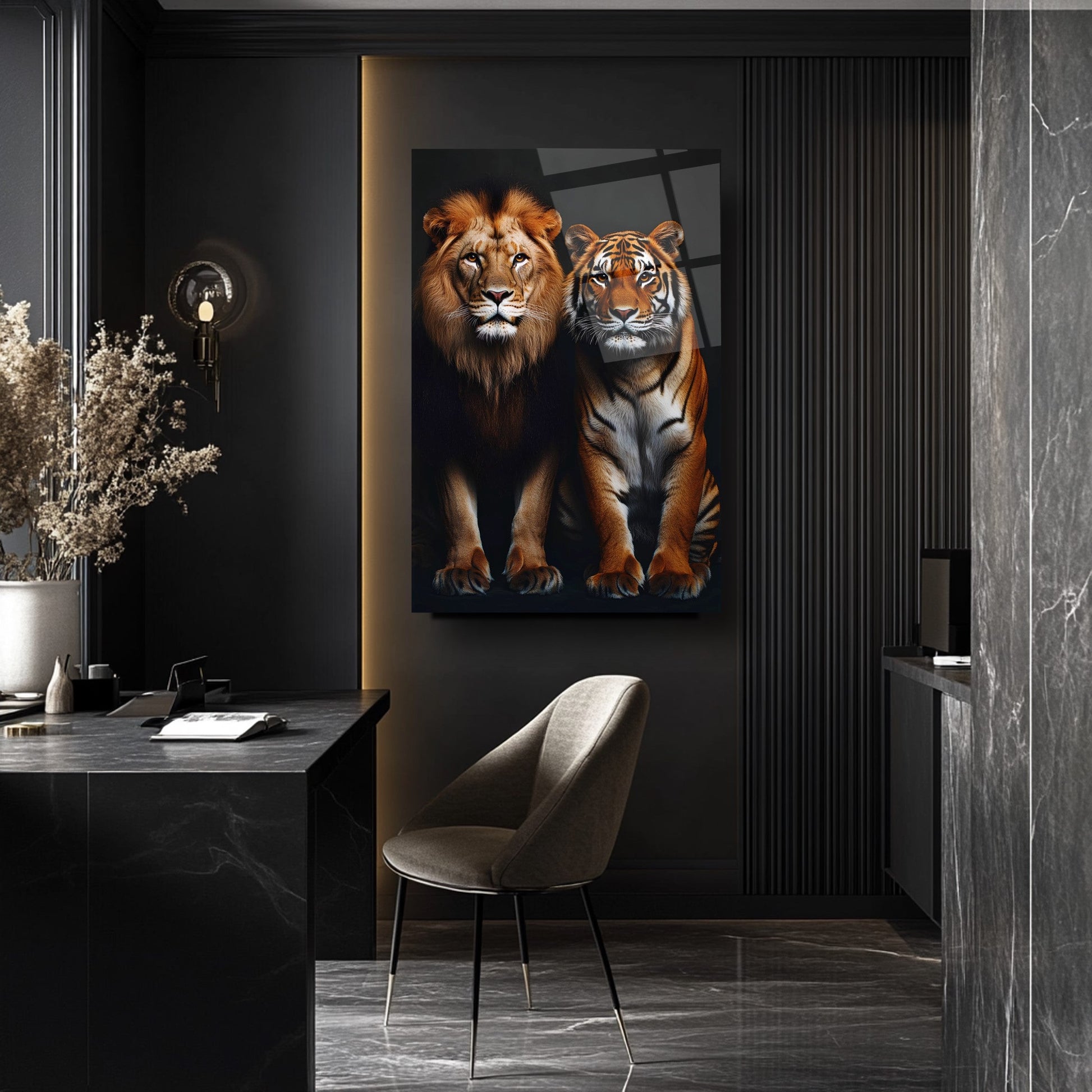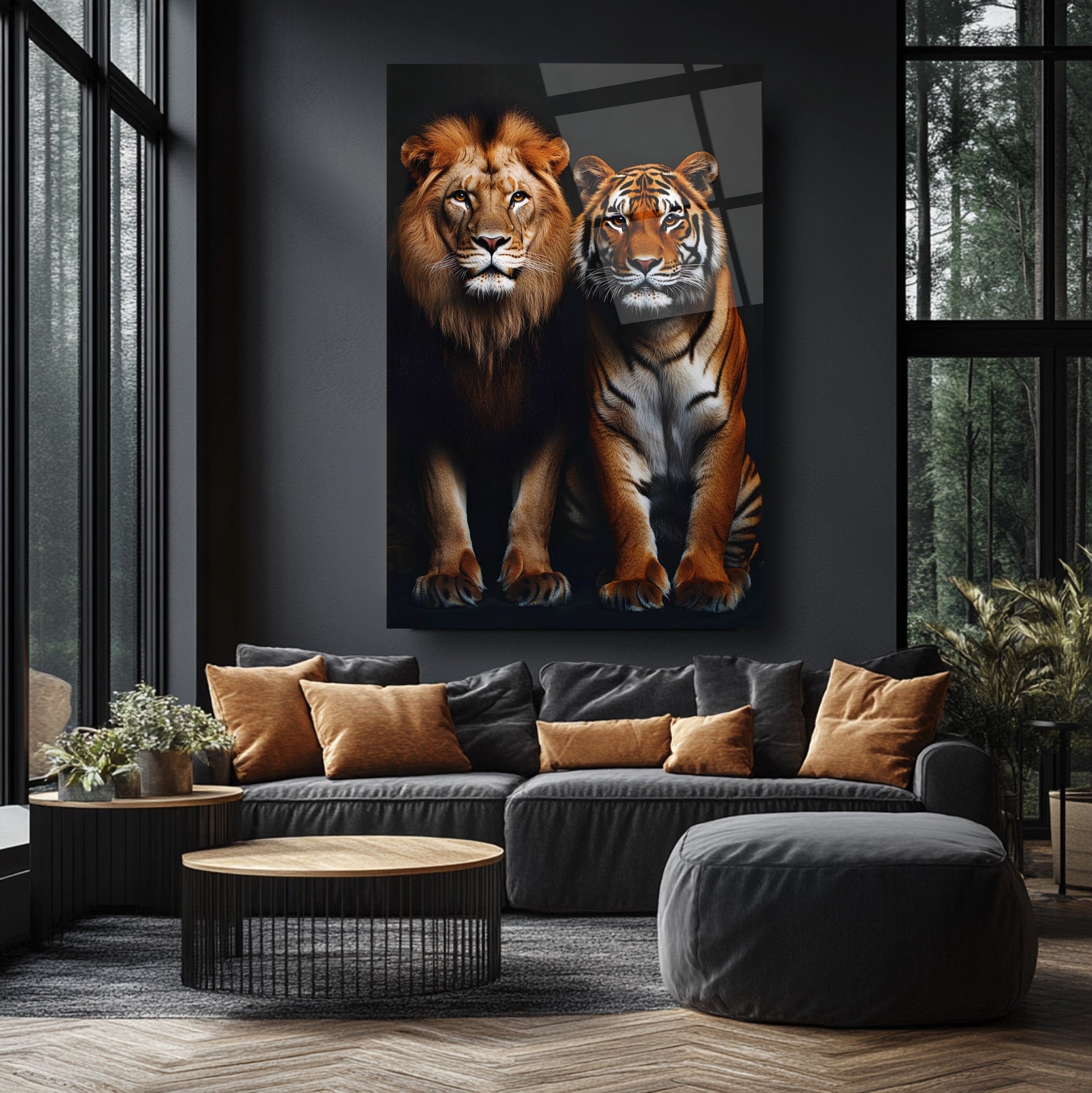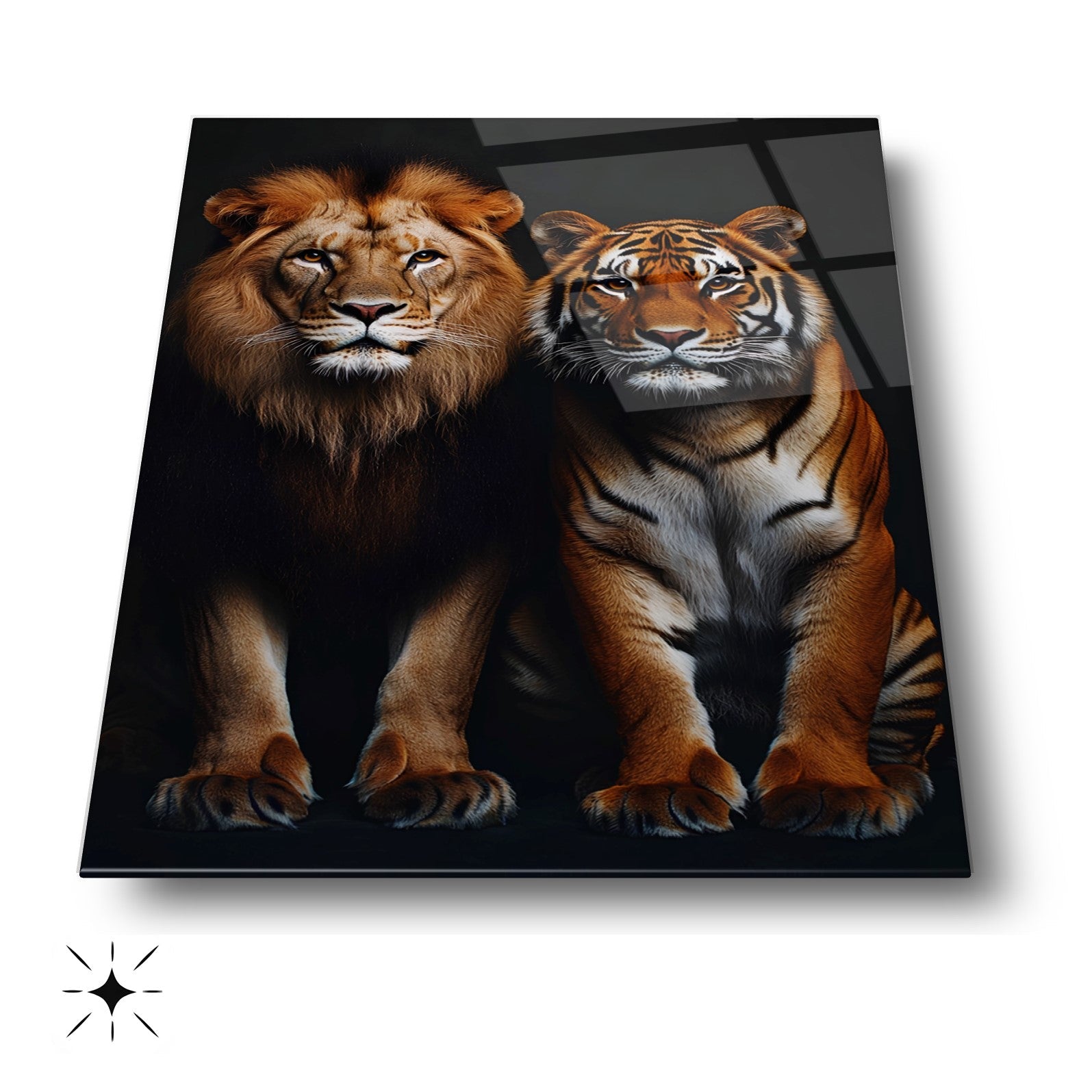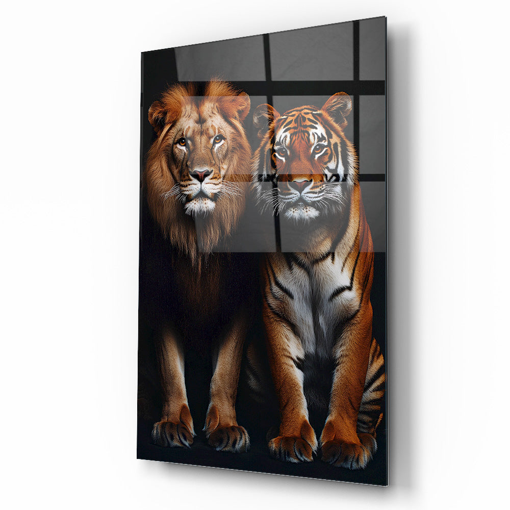Vahşi Doğanın İki Büyük Hükümdarı: Aslan Kaplan Yan Yana Modern Kırılmaz Cam Tablo
