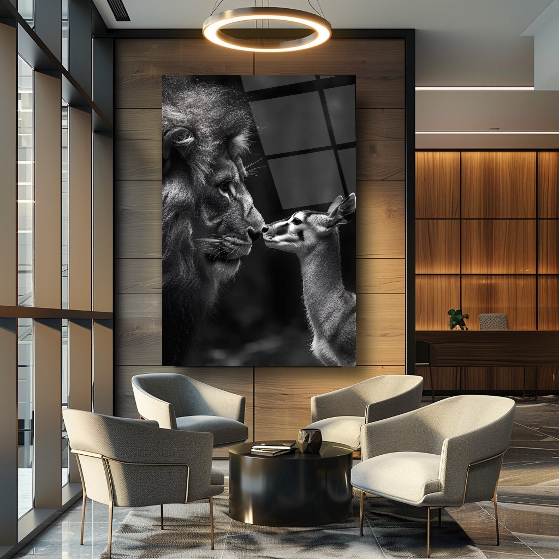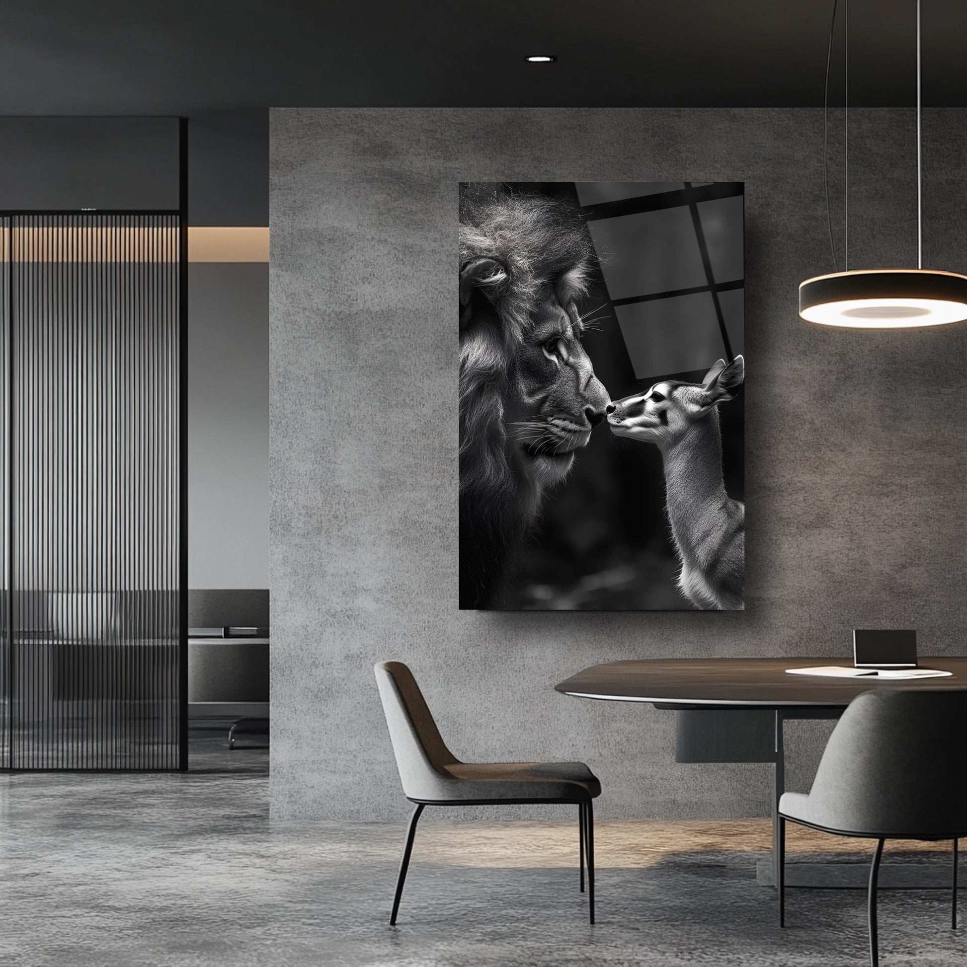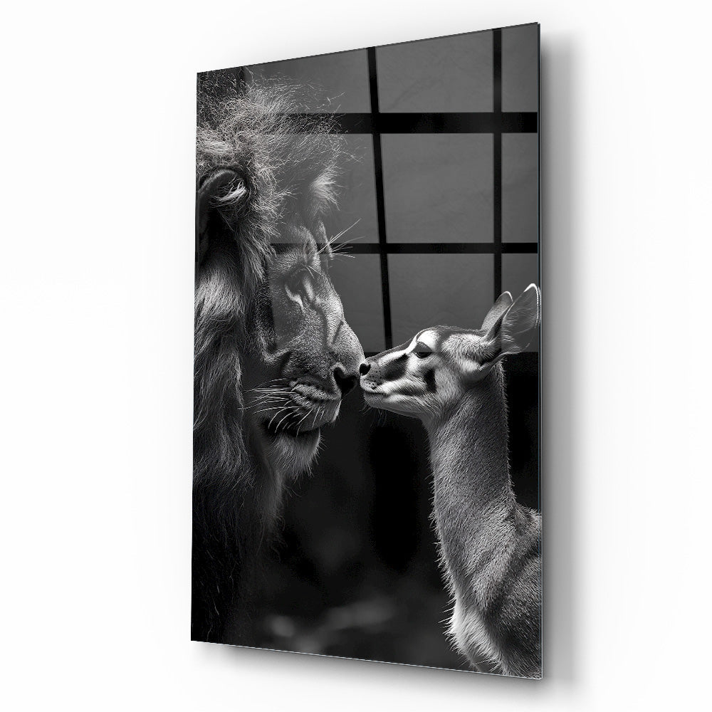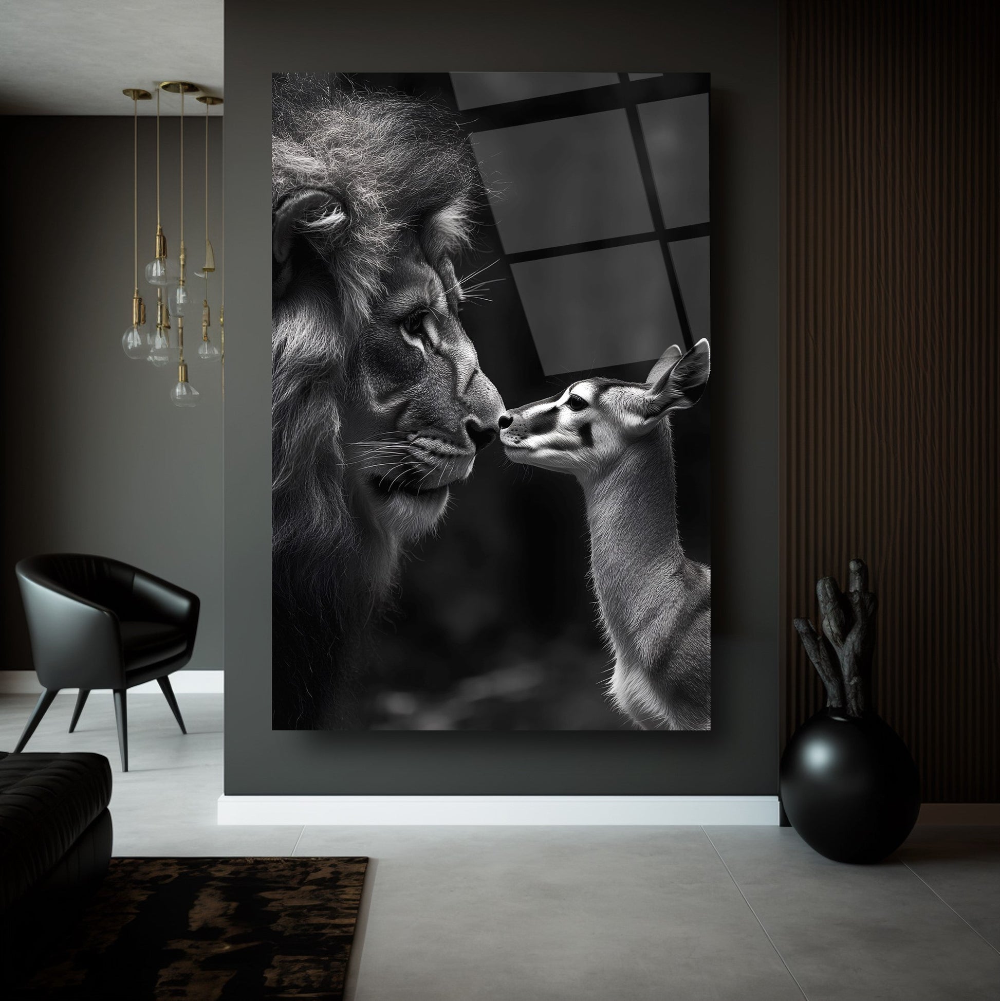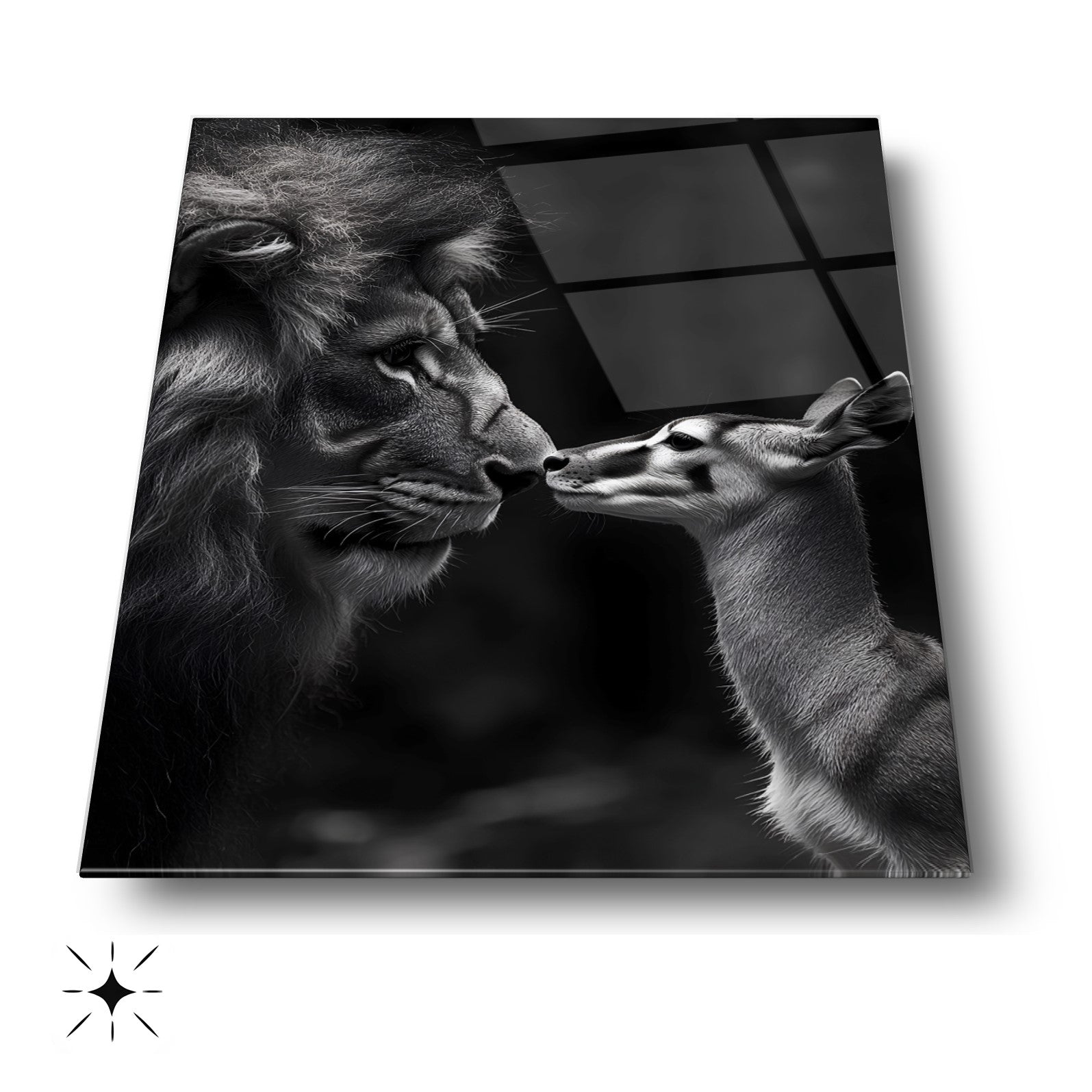 CamDeko'dan ev ve iş yerlerinize doğanın eşsiz güzelliğini taşıyan özel bir eser: Aslan Yavru Ceylan Kırılmaz Temperli Modern UV Baskı Vahşi Doğa Cam Tablo! Vahşi yaşamın dramatik ve büyüleyici bir anını yakalayan bu tablo, aslan ve yavru ceylan figürleriyle mekanlarınıza derinlik ve doğal bir estetik katıyor.