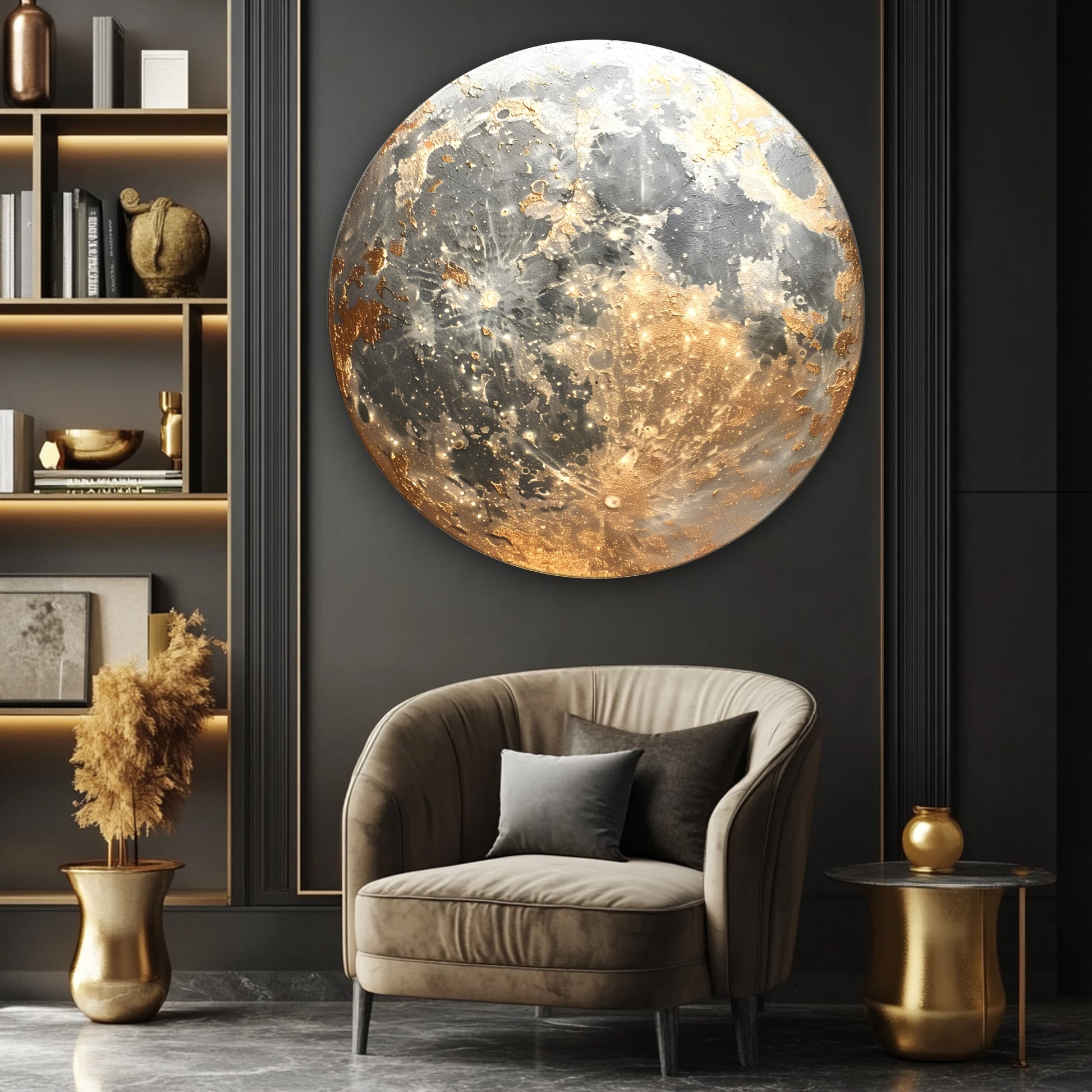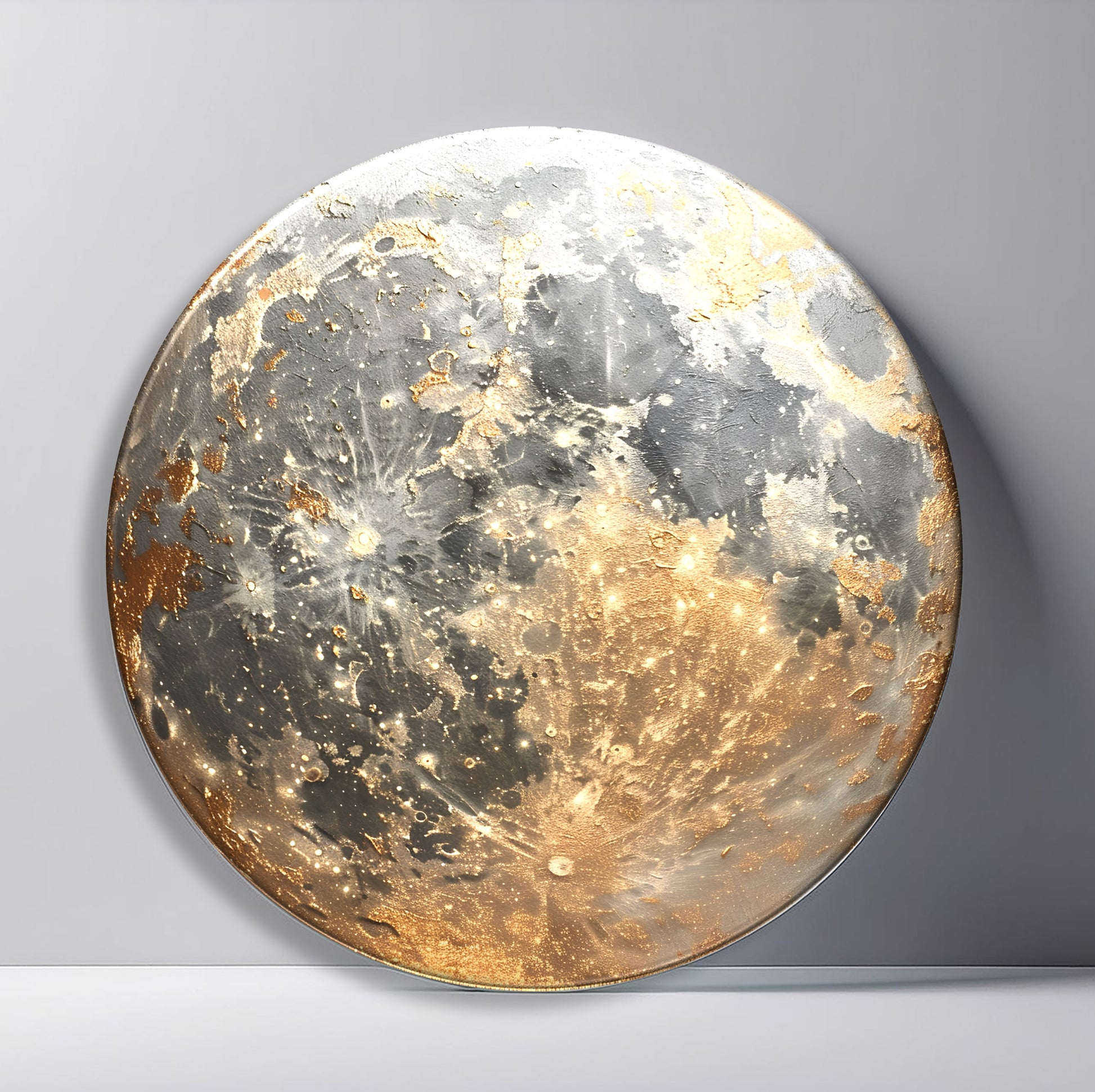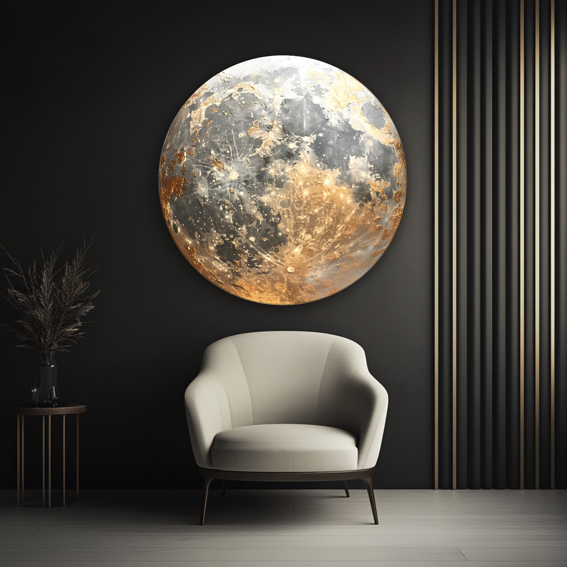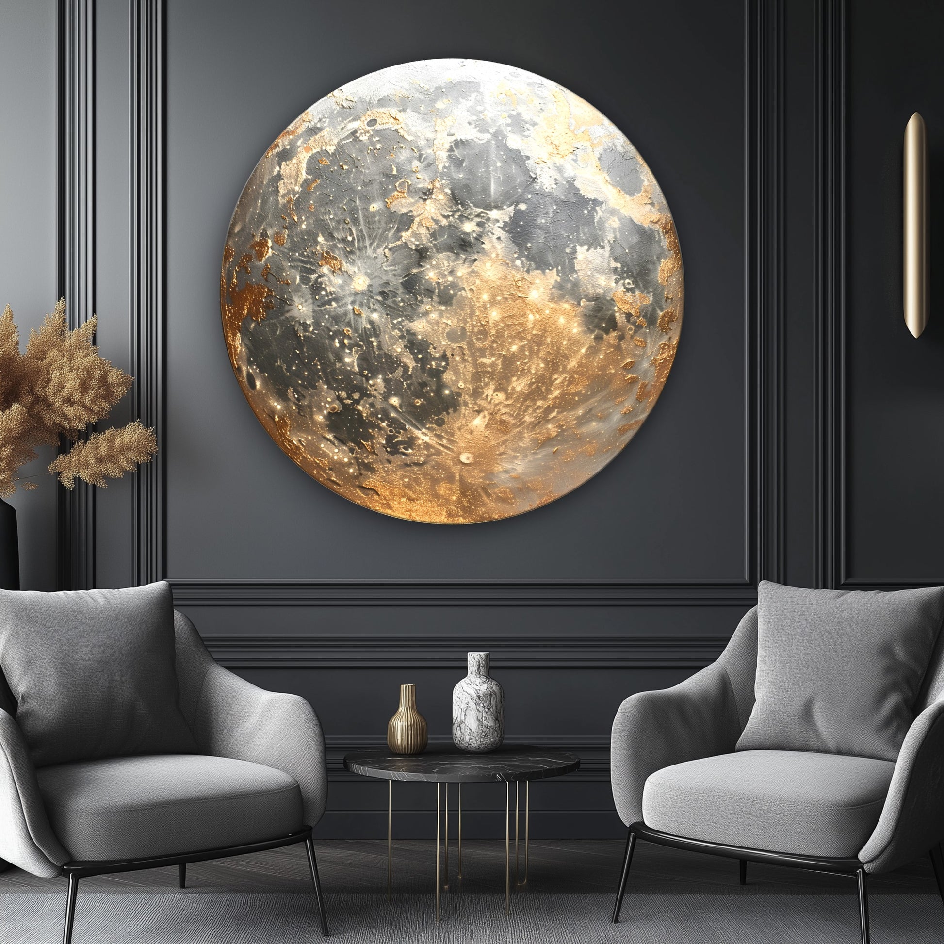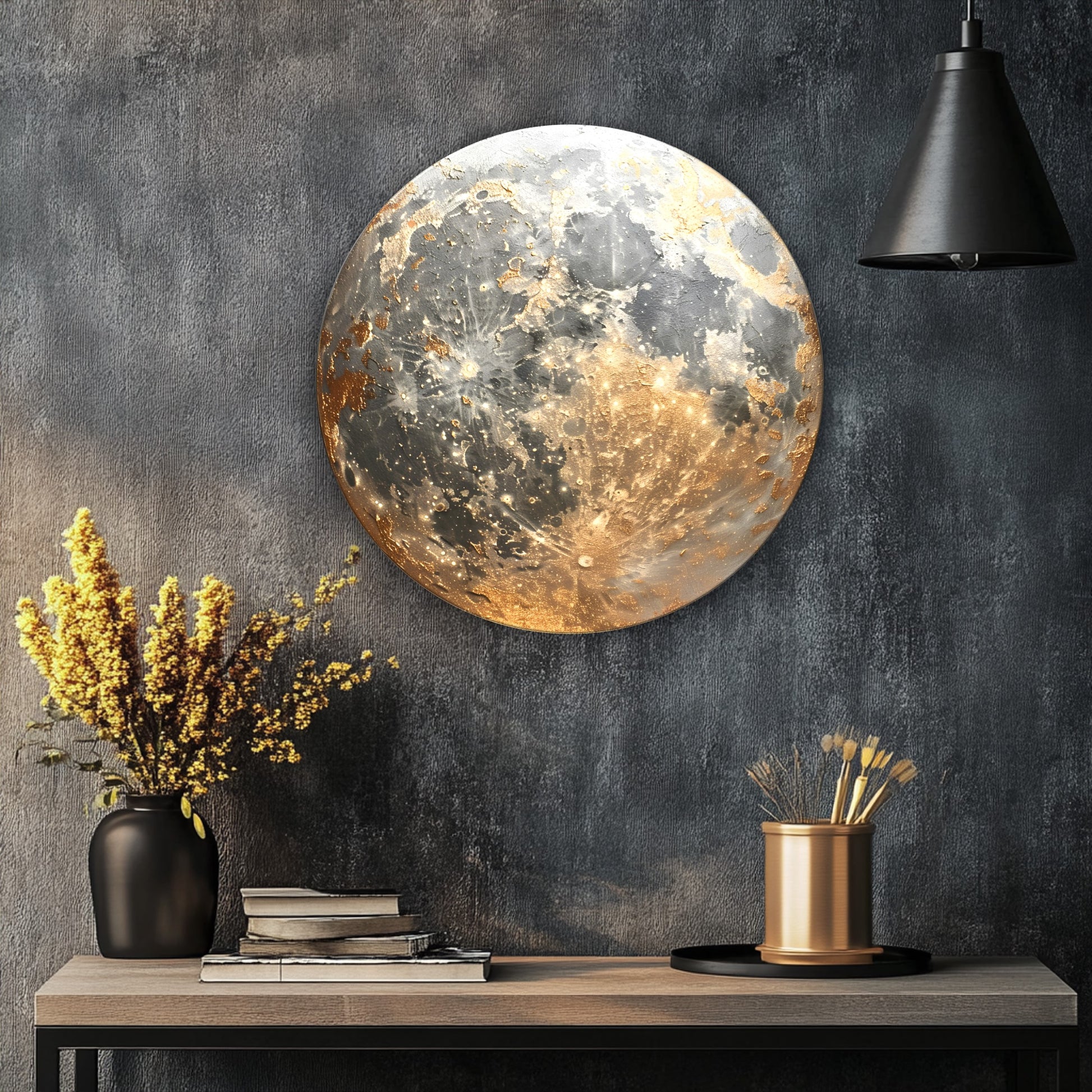 Gold detaylarla zenginleştirilmiş ay manzarası tasarımı, bu yuvarlak cam tabloya mistik ve modern bir hava katıyor. CamDeko kalitesiyle kırılmaz temperli cam üzerine UV baskı teknolojisiyle hazırlanan ürün, bulunduğu mekâna zarafet ve derinlik kazandırır. Ev salonlarından çalışma odalarına, otel lobilerinden şık restoranlara kadar farklı dekorasyon alanlarında dikkat çekici bir tercih olabilir. Ayın sakin ve etkileyici görüntüsü, ortamda huzur ve dinginlik hissi yaratır. Modern estetik arayanlar için anlam dolu ve şık bir dekorasyon seçeneğidir.