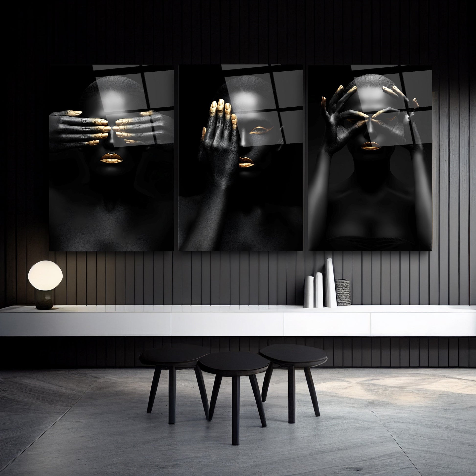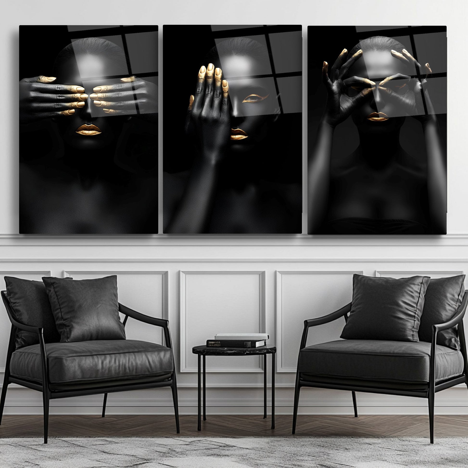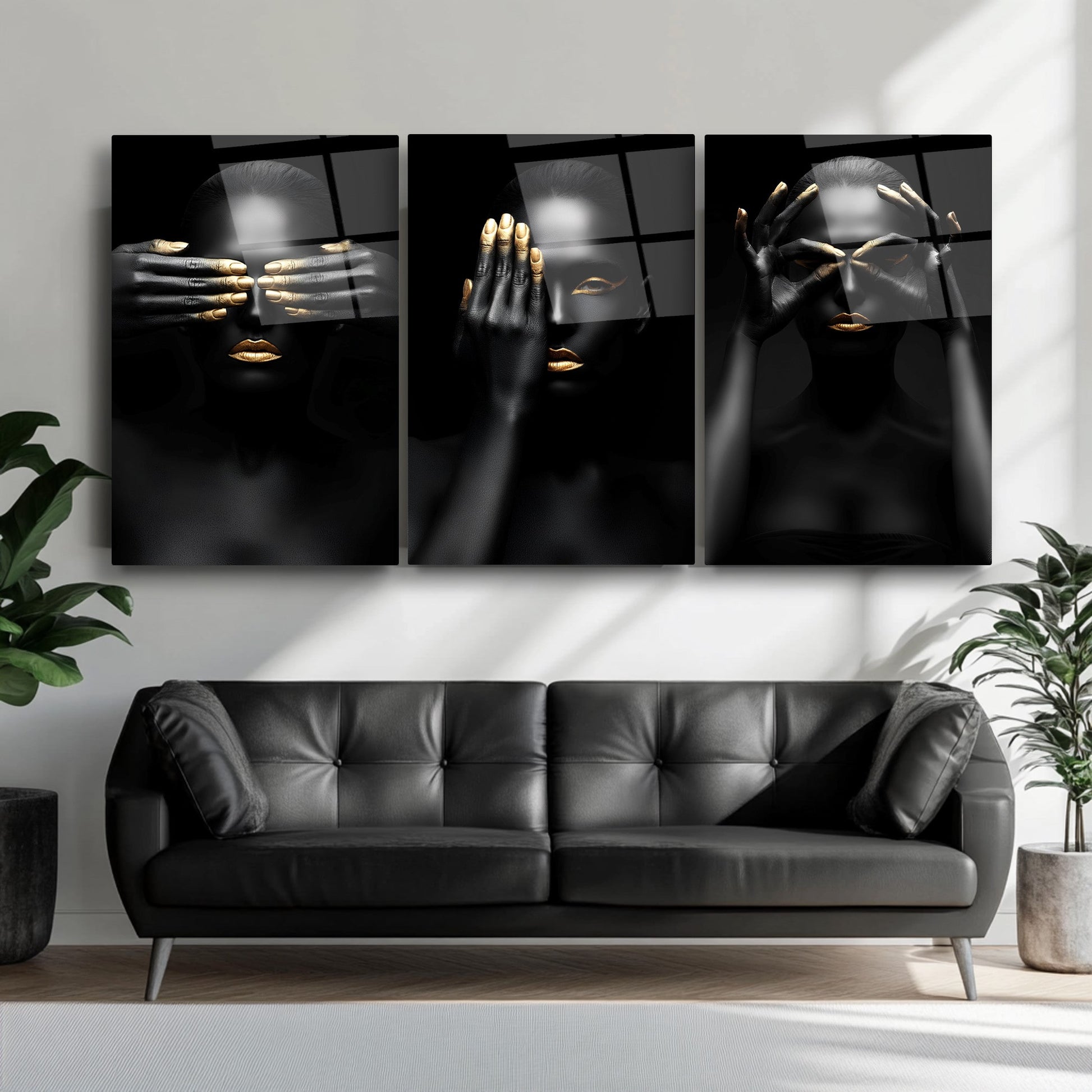 Siyah Gold Kadın Model Üçlü Set Cam Tablo