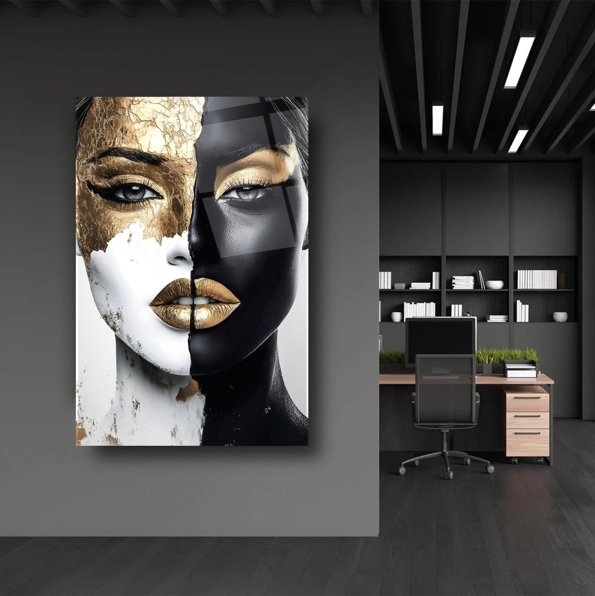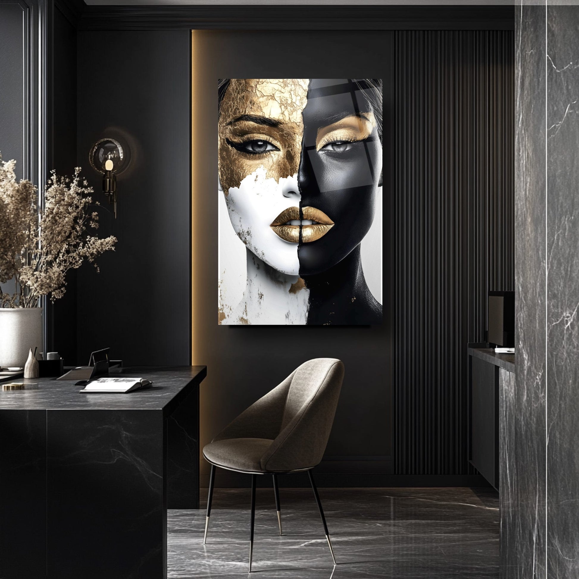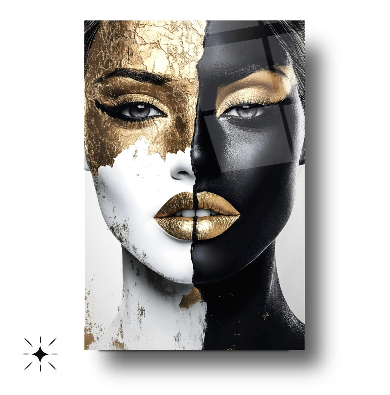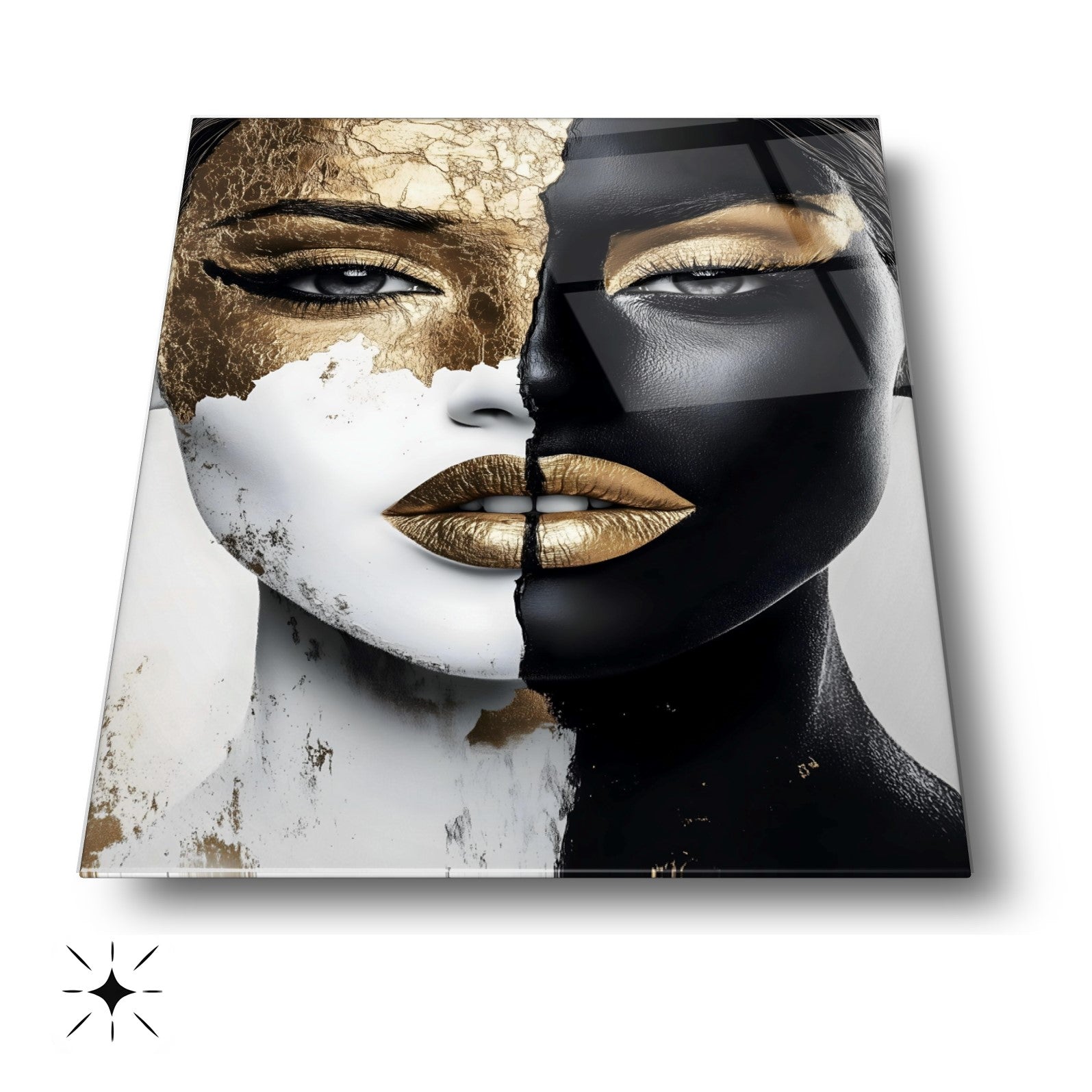 Güzellik Mekanlarınıza Altın Işıltılı Siyah Beyaz Zarafet: Kadın Model Cam Tablo