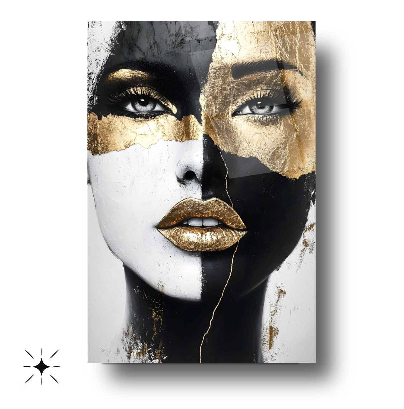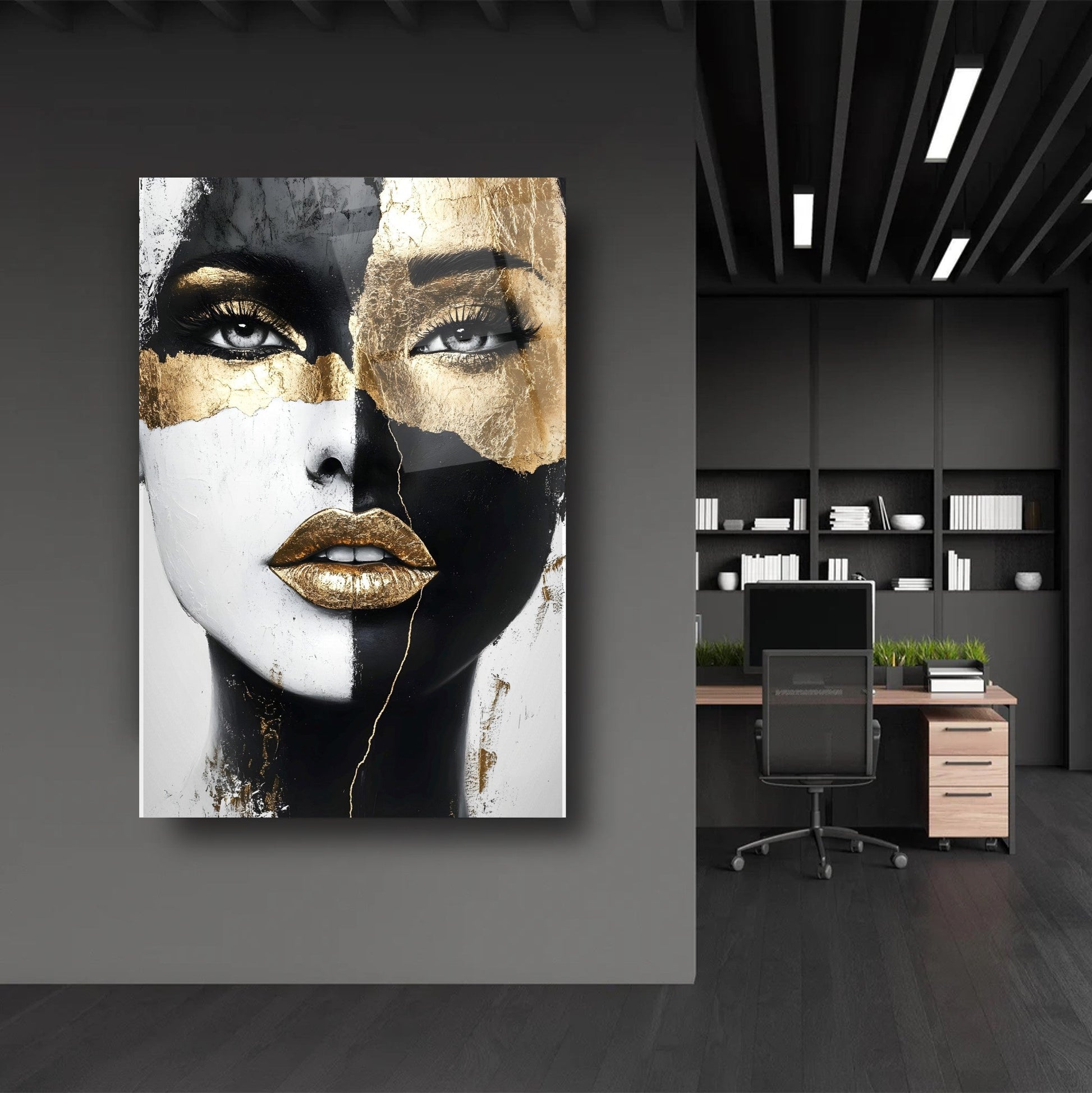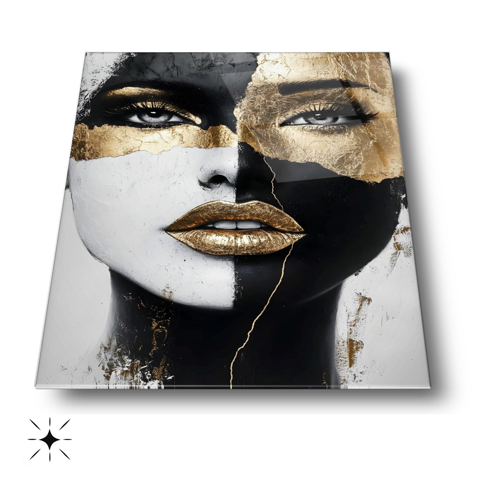 Güzellik Mekanlarınıza Altın Işıltılı Siyah Beyaz Şıklık: Kadın Model Cam Tablo