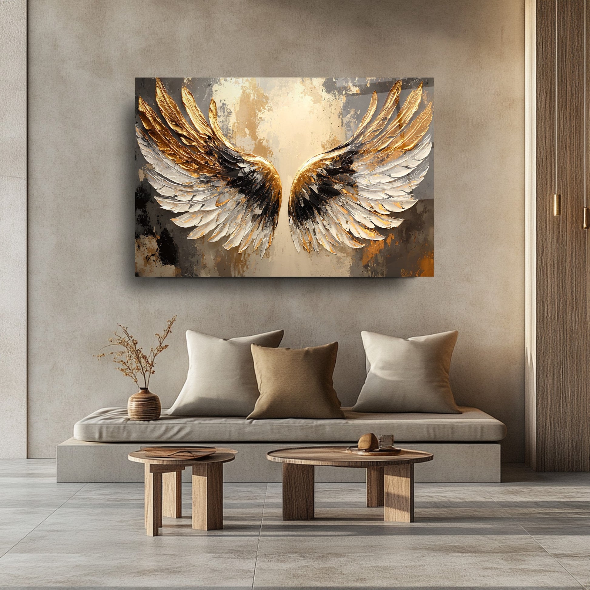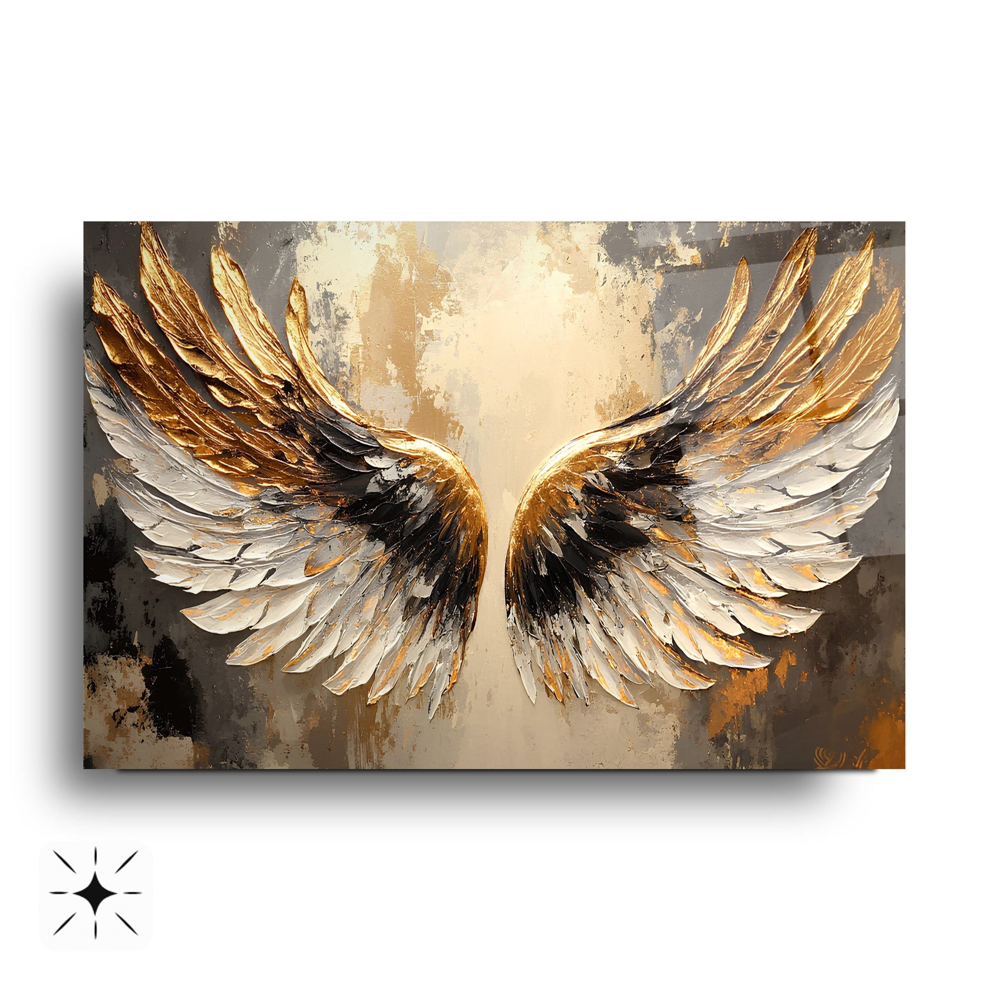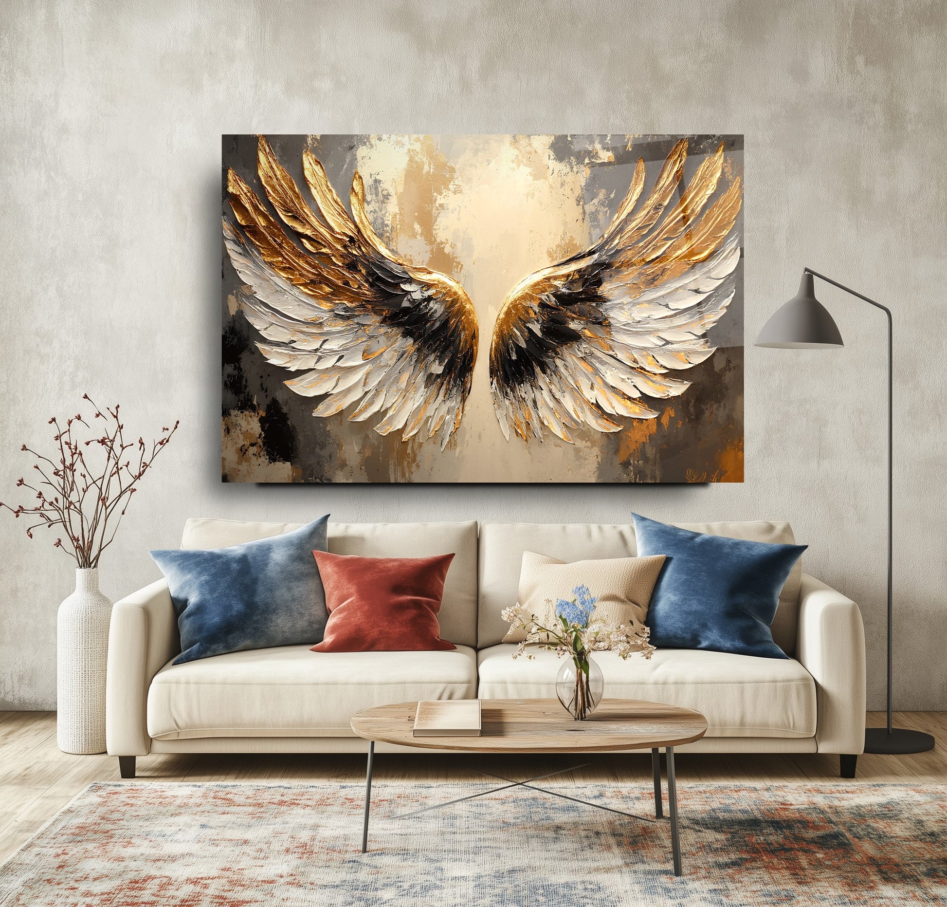 Altın yaldızlı melek kanatları, bej arka plan üzerinde kabartmalı 3D dokularla adeta kanatlanmış gibi yükseliyor. Zarif altın detaylar, sıcak tonlarla birleşerek mekâna sofistike ve huzurlu bir atmosfer kazandırıyor. Çerçevesiz tasarım, modern minimalist dekorlarla kusursuz uyum sağlarken, temperli cam ve UV baskı sayesinde canlı ve solmayan renkler uzun süre korunur. Kabartmalı yüzeyiyle derinlik sunan bu tablo, salon, yatak odası veya makâm odaları için lüks ve etkileyici bir duvar dekoru arayanlar için ideal bir seçimdir.