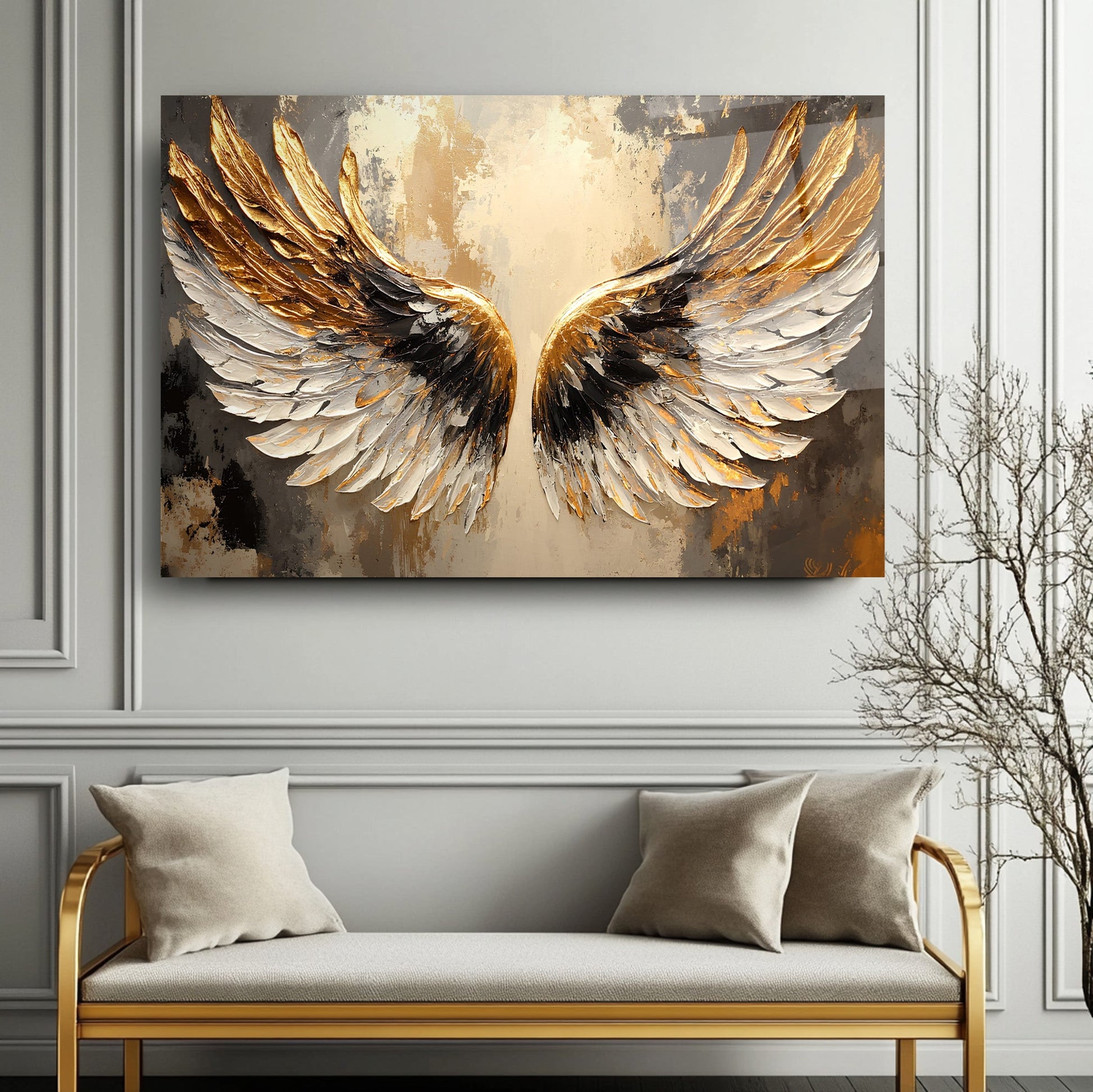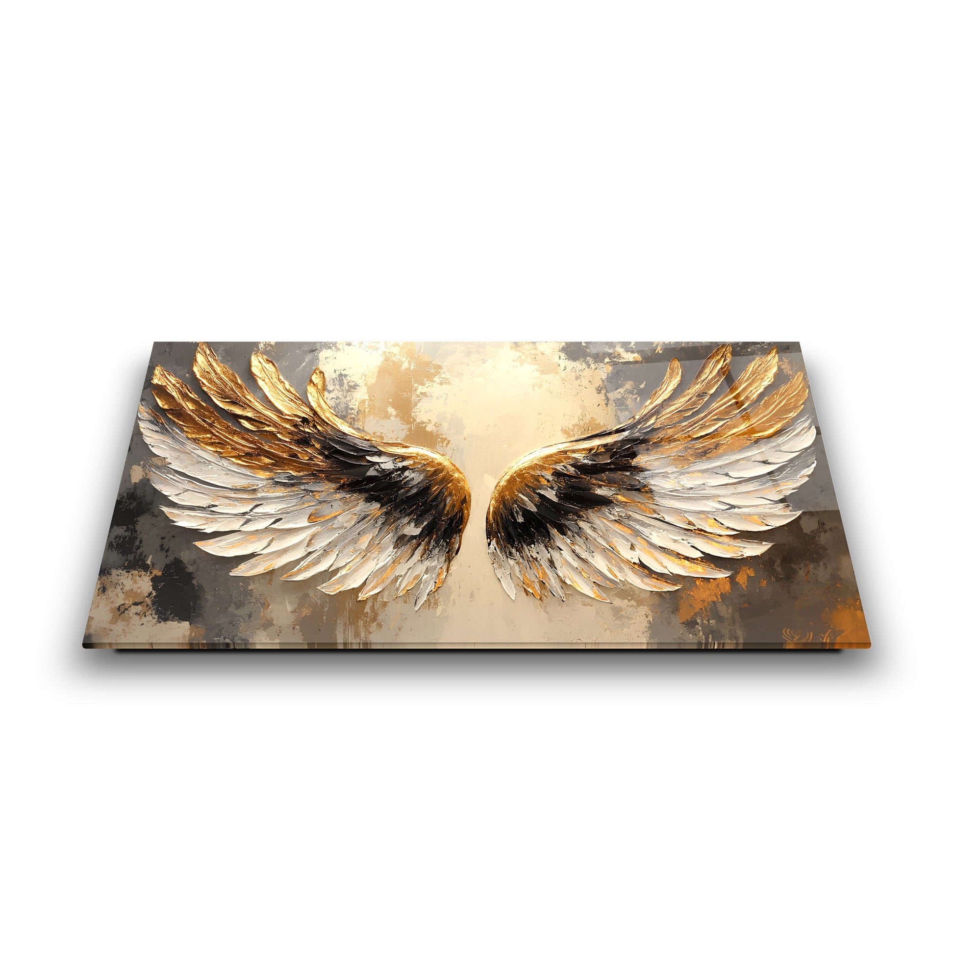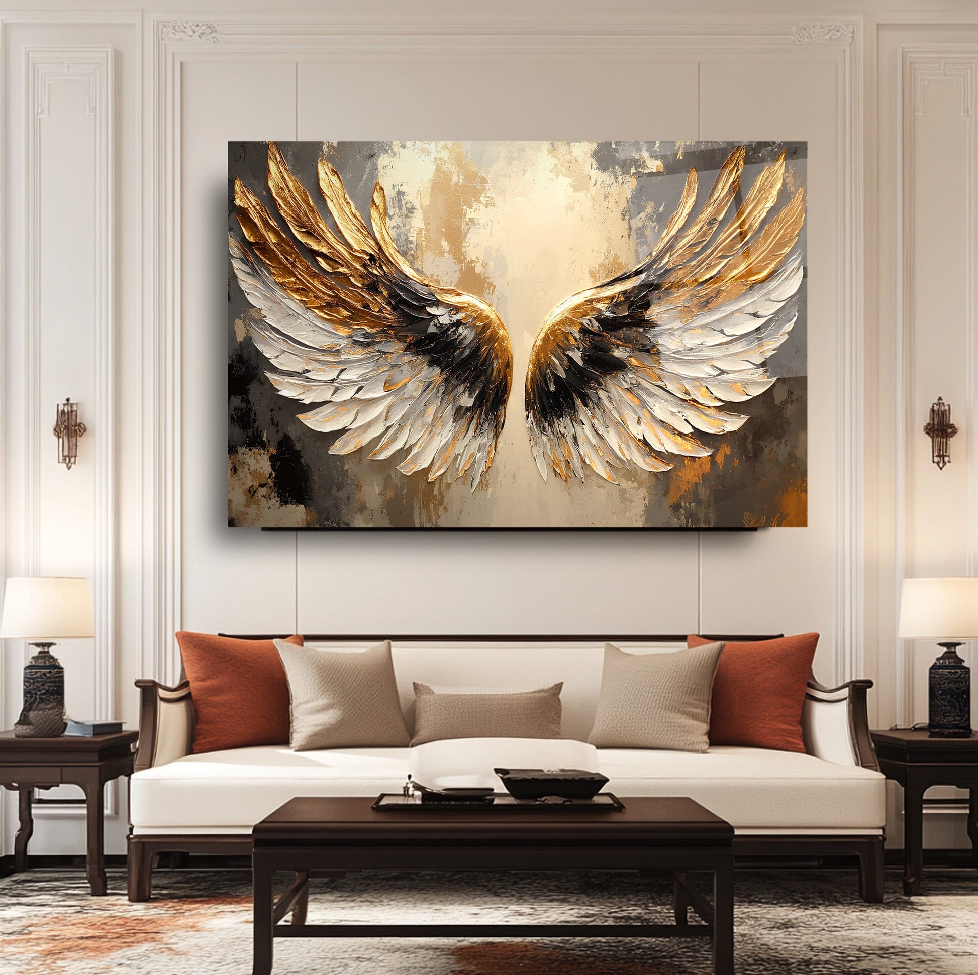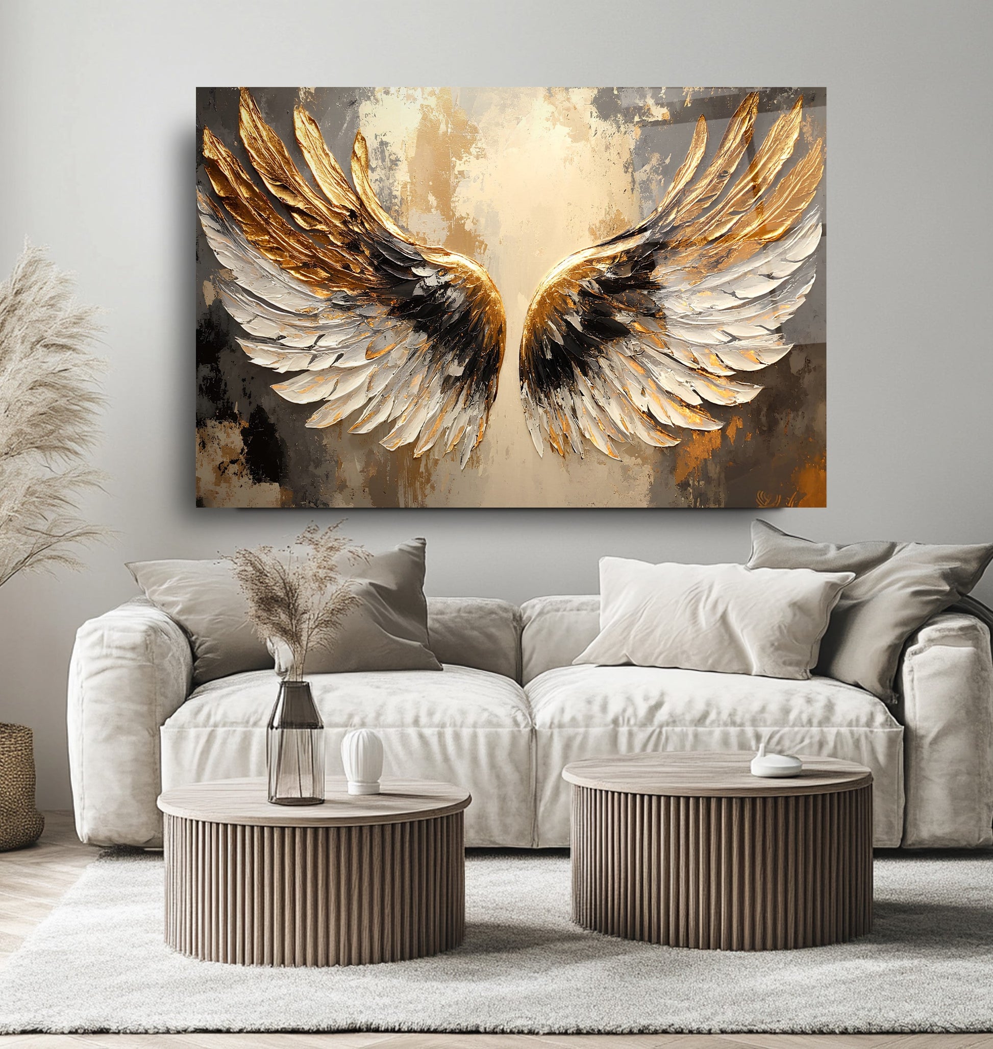 Altın yaldızlı melek kanatları, bej arka plan üzerinde kabartmalı 3D dokularla adeta kanatlanmış gibi yükseliyor. Zarif altın detaylar, sıcak tonlarla birleşerek mekâna sofistike ve huzurlu bir atmosfer kazandırıyor. Çerçevesiz tasarım, modern minimalist dekorlarla kusursuz uyum sağlarken, temperli cam ve UV baskı sayesinde canlı ve solmayan renkler uzun süre korunur. Kabartmalı yüzeyiyle derinlik sunan bu tablo, salon, yatak odası veya makâm odaları için lüks ve etkileyici bir duvar dekoru arayanlar için ideal bir seçimdir.