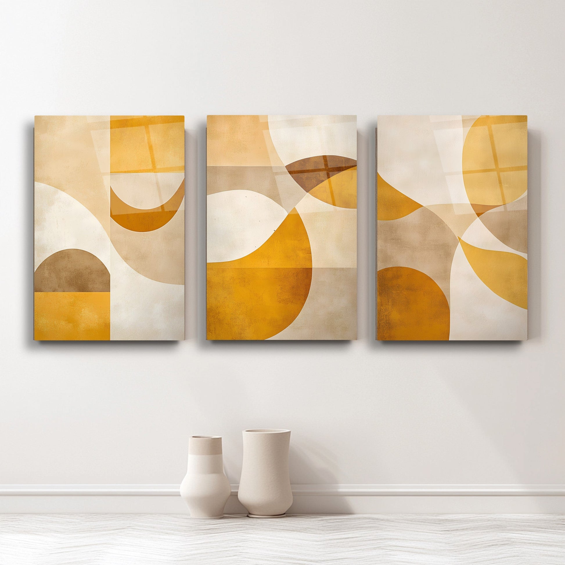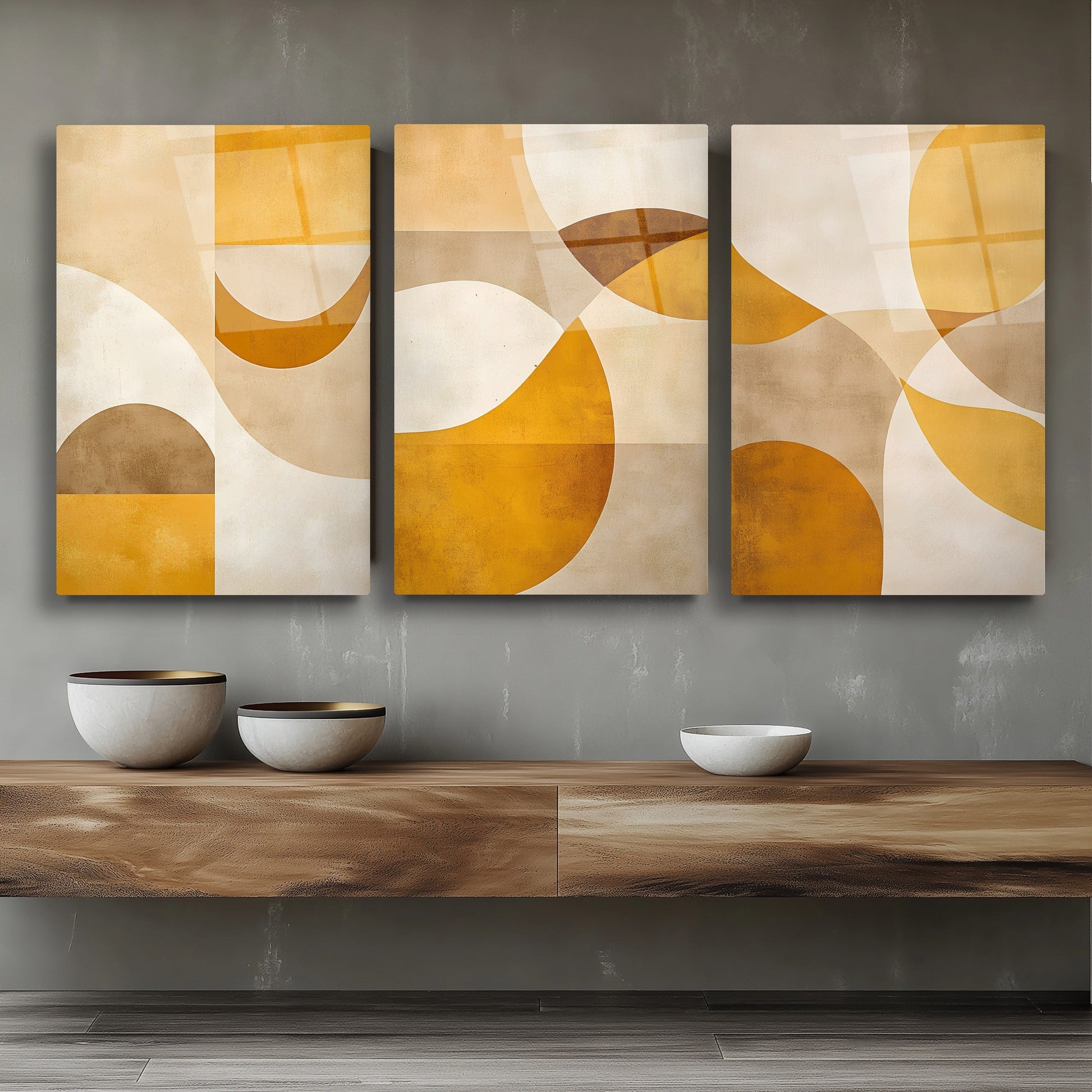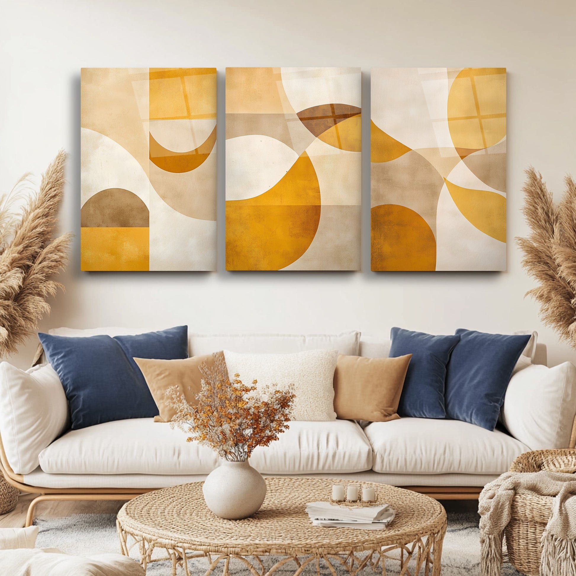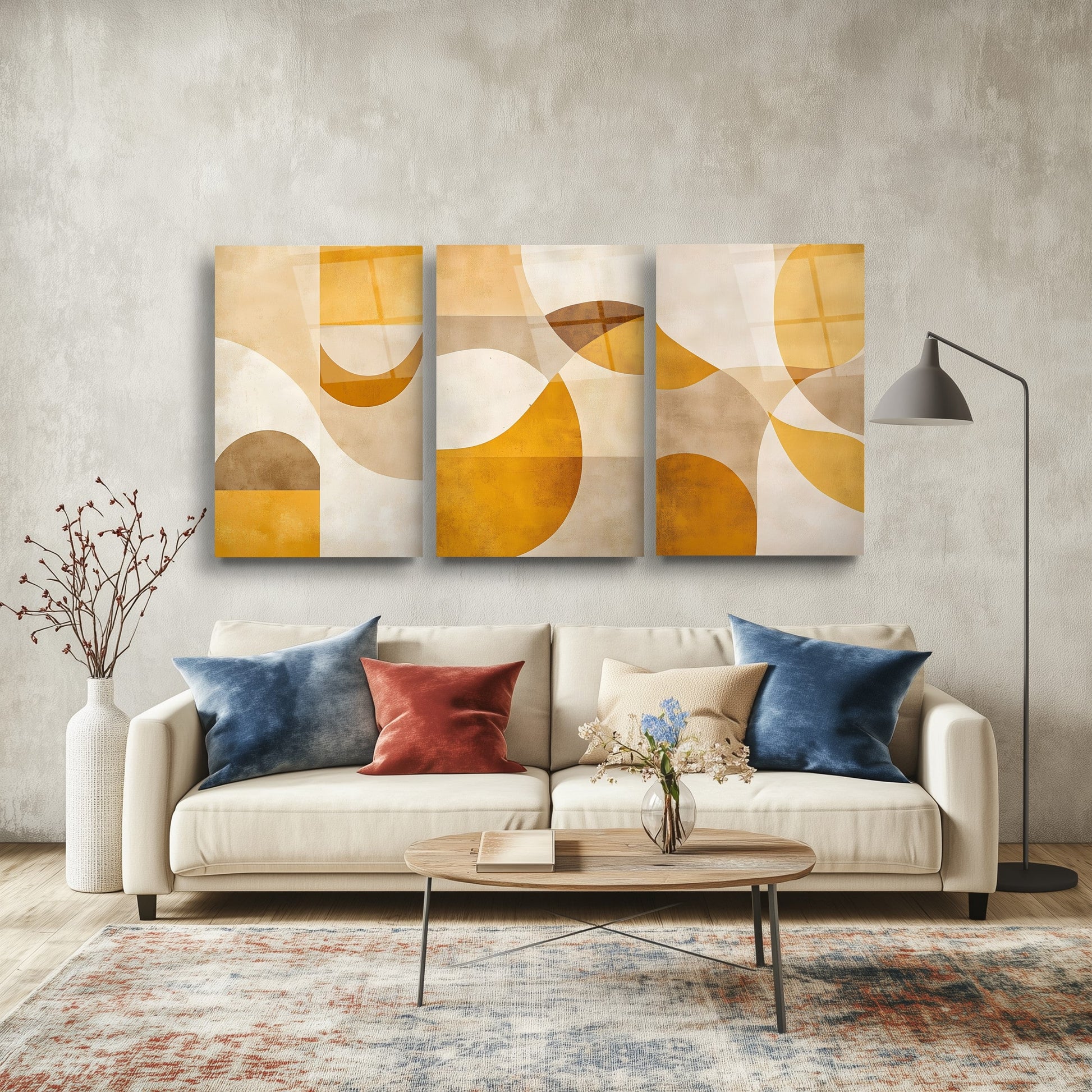 Bej zemin üzerinde sarı, turuncu ve kahve tonlarında geometrik şekillerle tasarlanan bu kırılmaz cam tablo üçlü set, boho ve minimal tarzı modern dokunuşlarla birleştirir. Sade ama çarpıcı görünümüyle yaşam alanlarına sıcaklık ve estetik katar. Temperli cam yüzeyi sayesinde dayanıklı ve uzun ömürlüdür. Modern dekorasyonu sevenler için ideal bir tercih sunar.
