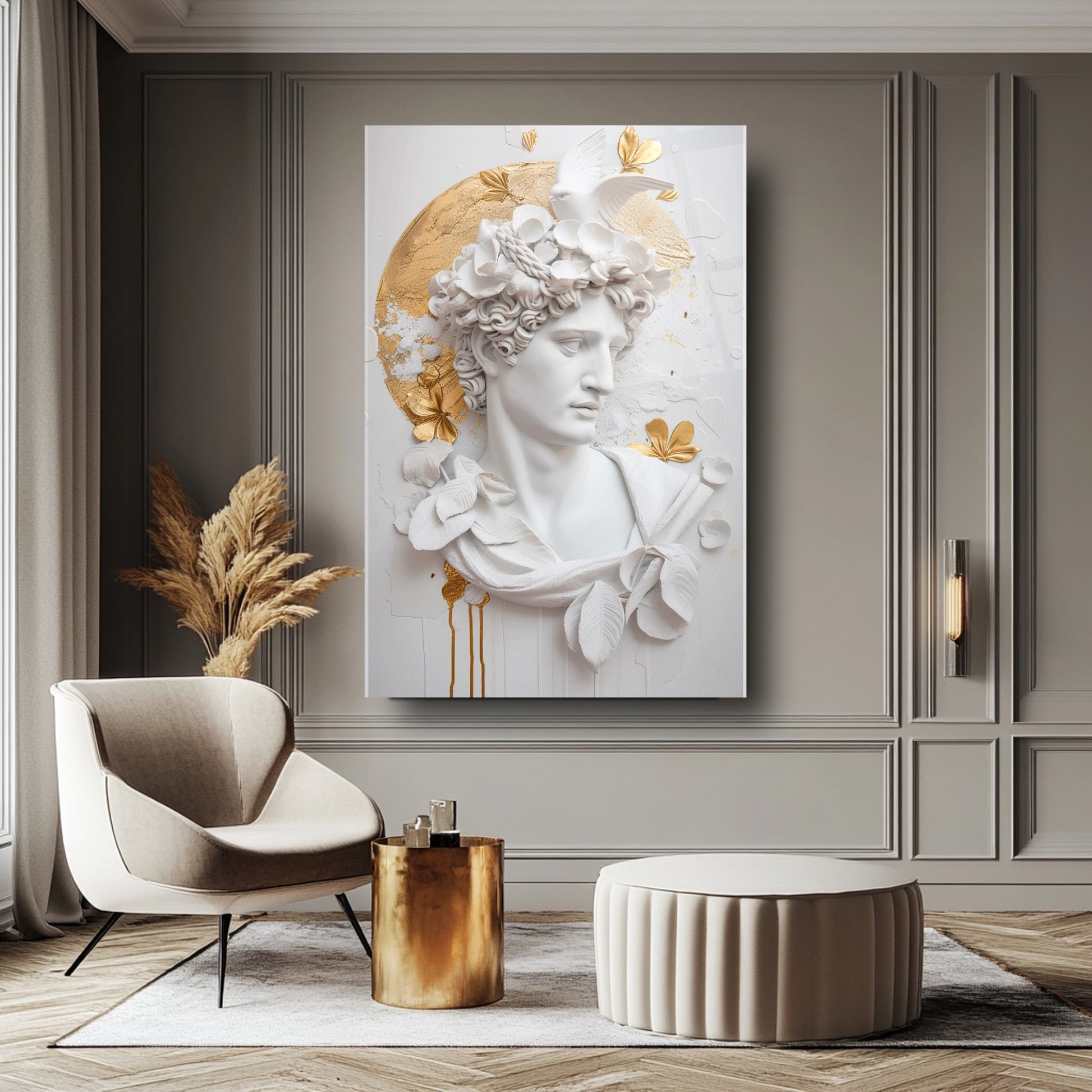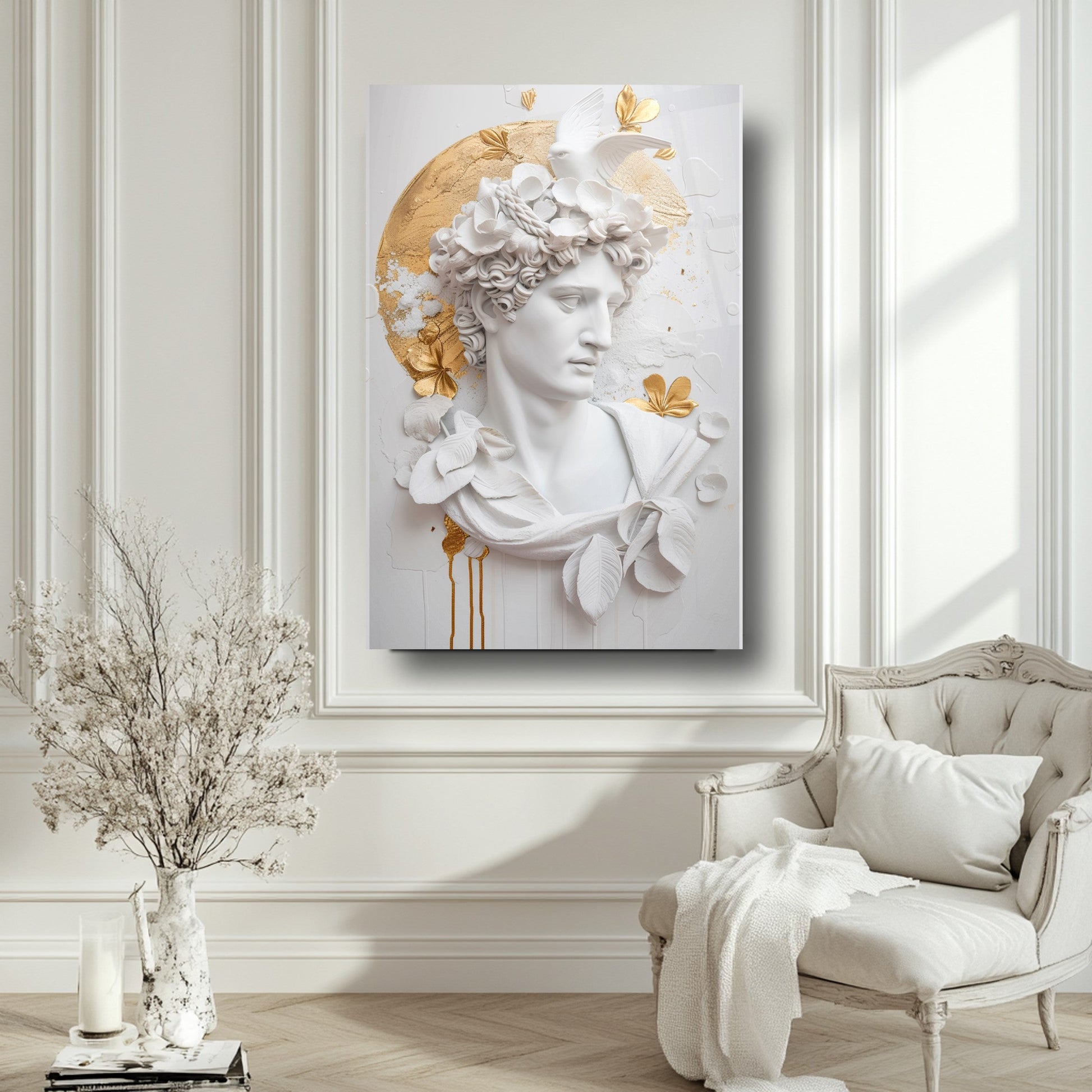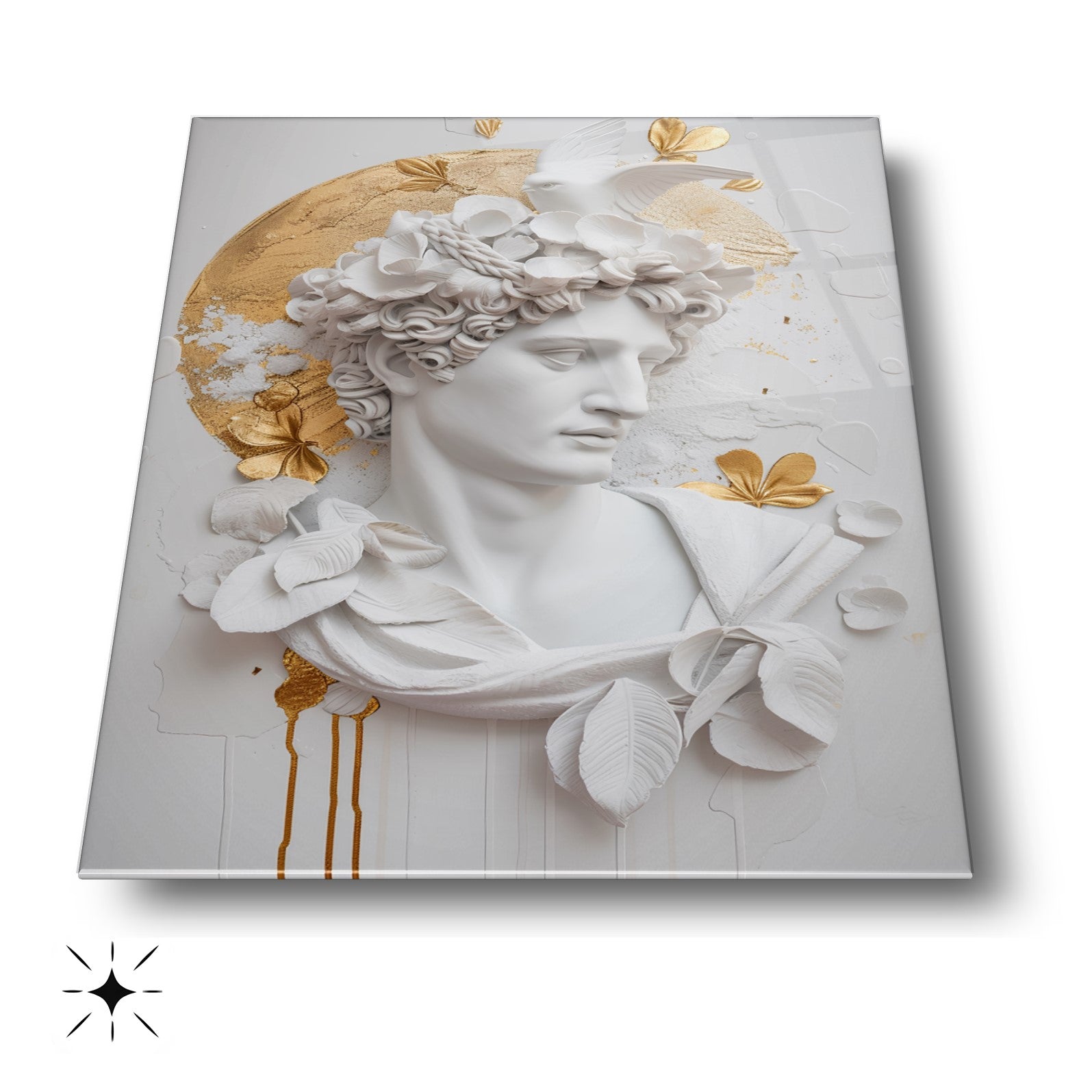 Bu etkileyici tablo, beyaz arka plan üzerinde 3 boyutlu gold detaylı heykel figürüyle dikkat çekiyor. Sanatla modernliği birleştiren tasarımı, mekânınıza zarif bir dokunuş katıyor. 4 mm kalınlığındaki ultra-clear temperli cam, standart camlara göre 10 kat daha dayanıklıdır ve rodajlanmış kenarlarıyla güvenli kullanım sağlar. UV dijital baskı teknolojisiyle uygulanan yüksek çözünürlüklü baskı, renklerin solmasını engeller ve uzun ömürlü kullanım sunar. Kolay montajı sayesinde hemen duvarınıza asılabilir. Salon, oturma odası veya ofis gibi farklı alanlarda şıklığıyla öne çıkar. Evinize veya iş yerinize modern bir atmosfer kazandırmak için bu tablo mükemmel bir tercih olacaktır.