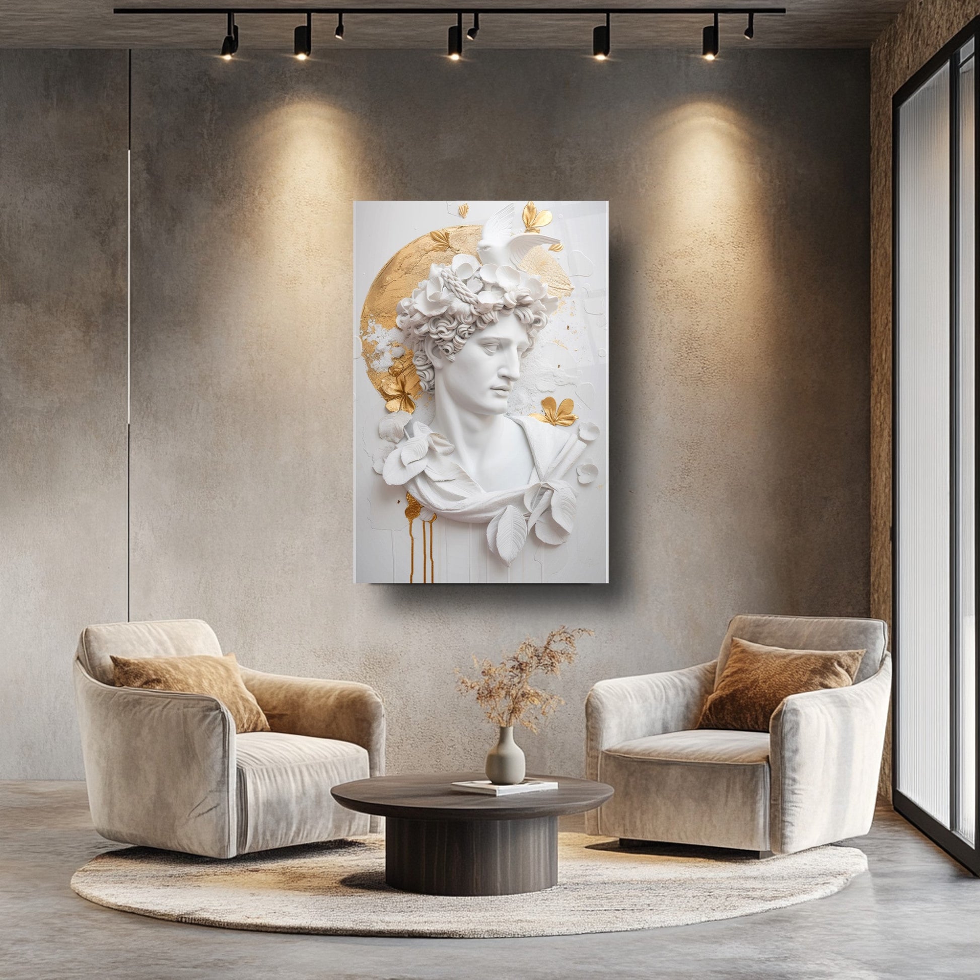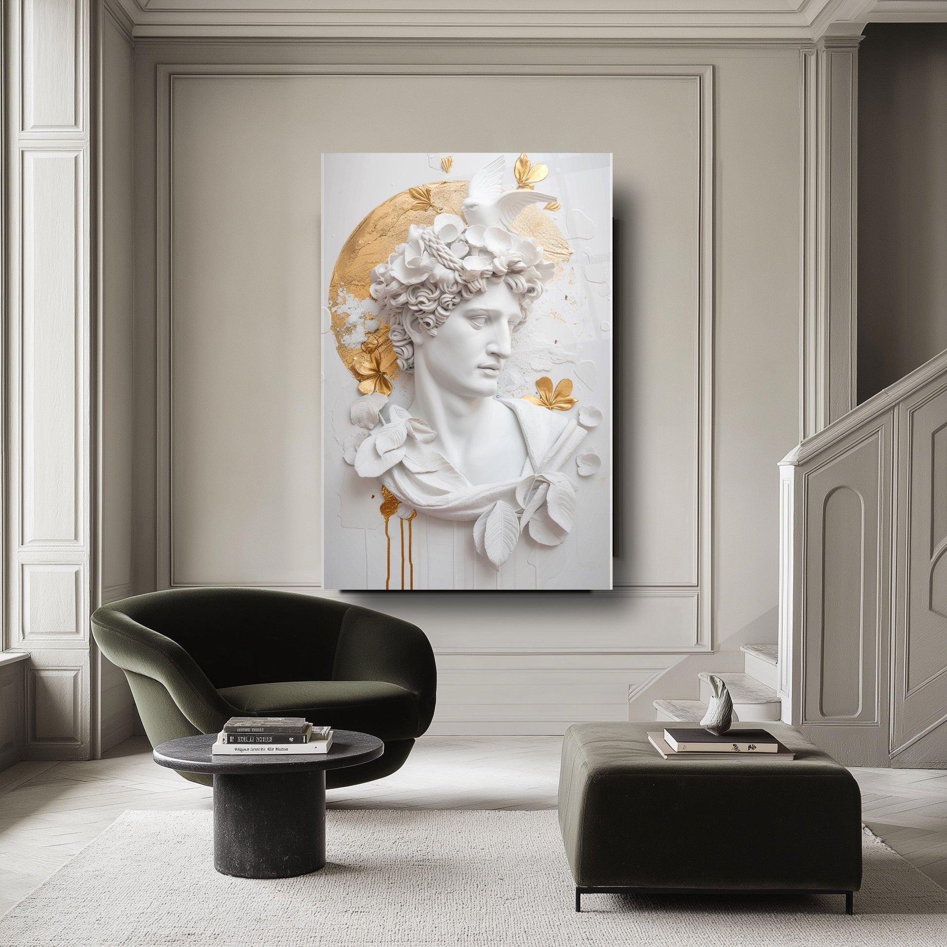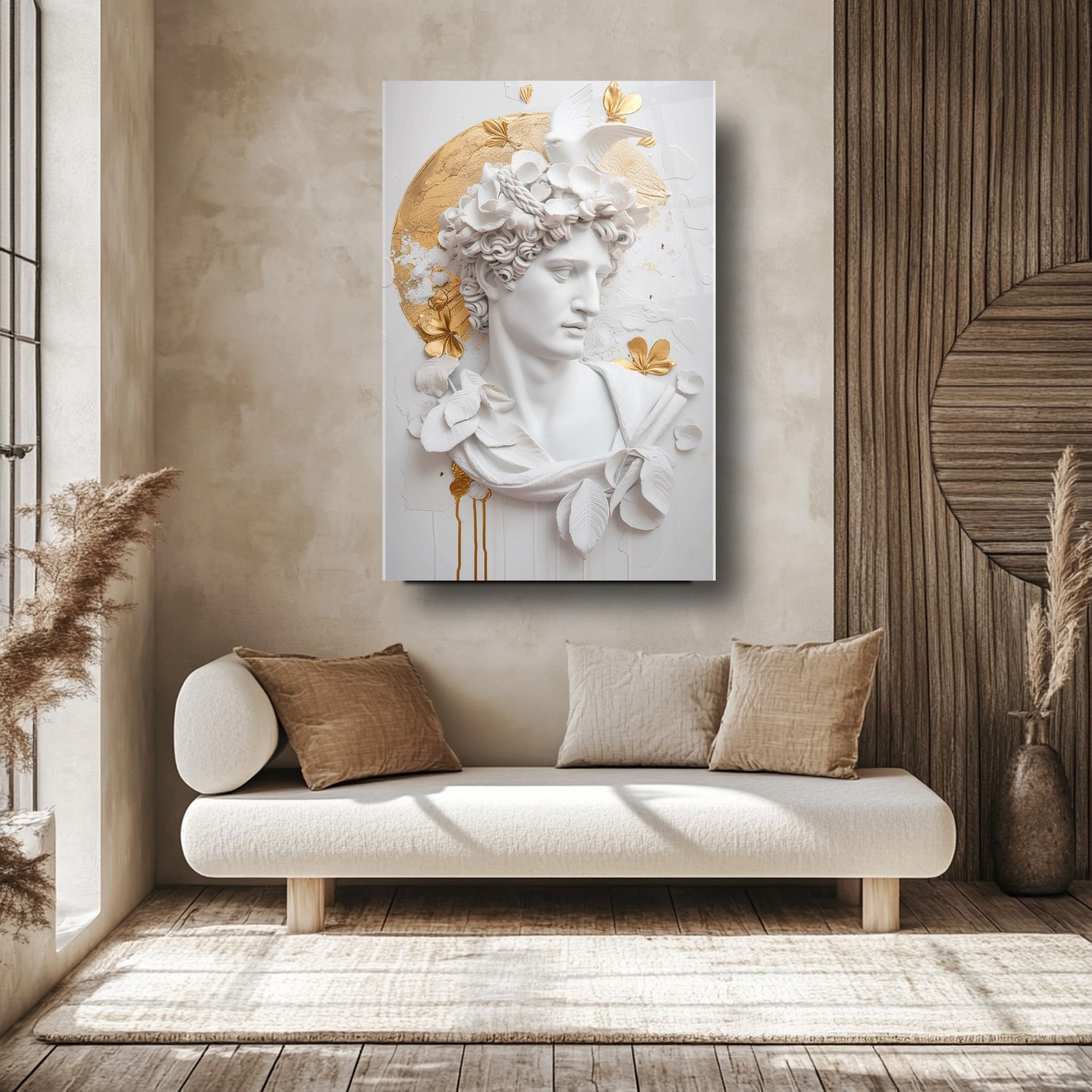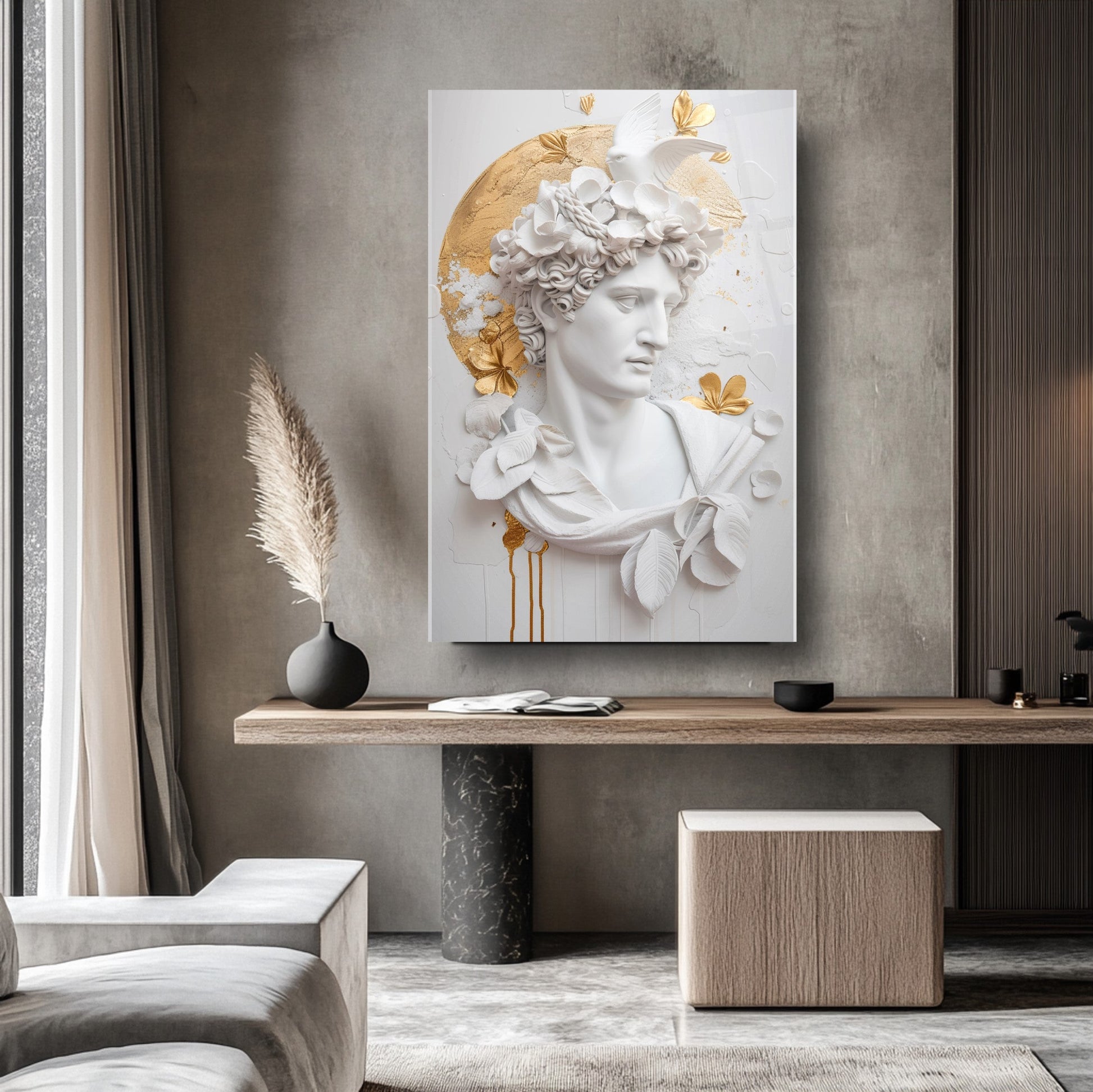 Bu etkileyici tablo, beyaz arka plan üzerinde 3 boyutlu gold detaylı heykel figürüyle dikkat çekiyor. Sanatla modernliği birleştiren tasarımı, mekânınıza zarif bir dokunuş katıyor. 4 mm kalınlığındaki ultra-clear temperli cam, standart camlara göre 10 kat daha dayanıklıdır ve rodajlanmış kenarlarıyla güvenli kullanım sağlar. UV dijital baskı teknolojisiyle uygulanan yüksek çözünürlüklü baskı, renklerin solmasını engeller ve uzun ömürlü kullanım sunar. Kolay montajı sayesinde hemen duvarınıza asılabilir. Salon, oturma odası veya ofis gibi farklı alanlarda şıklığıyla öne çıkar. Evinize veya iş yerinize modern bir atmosfer kazandırmak için bu tablo mükemmel bir tercih olacaktır.