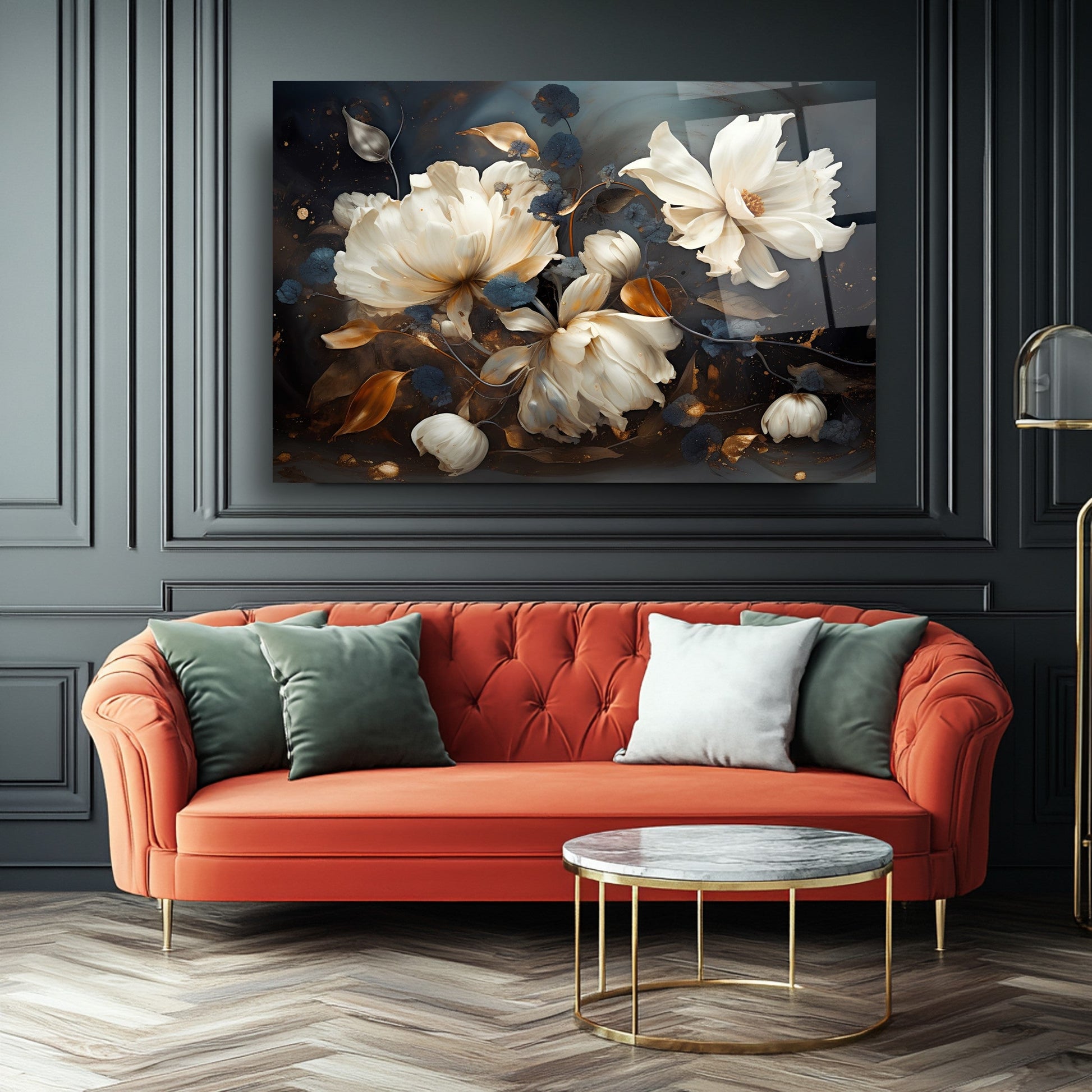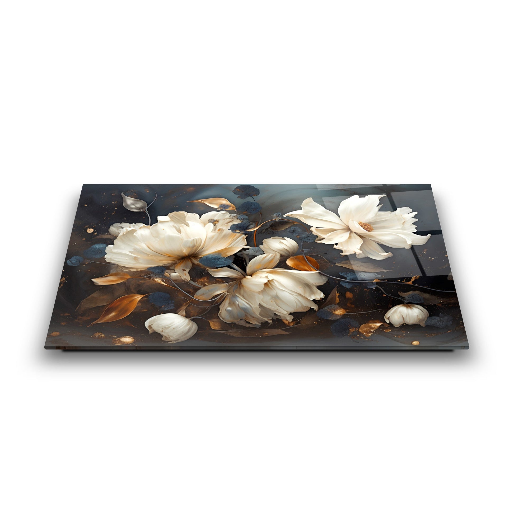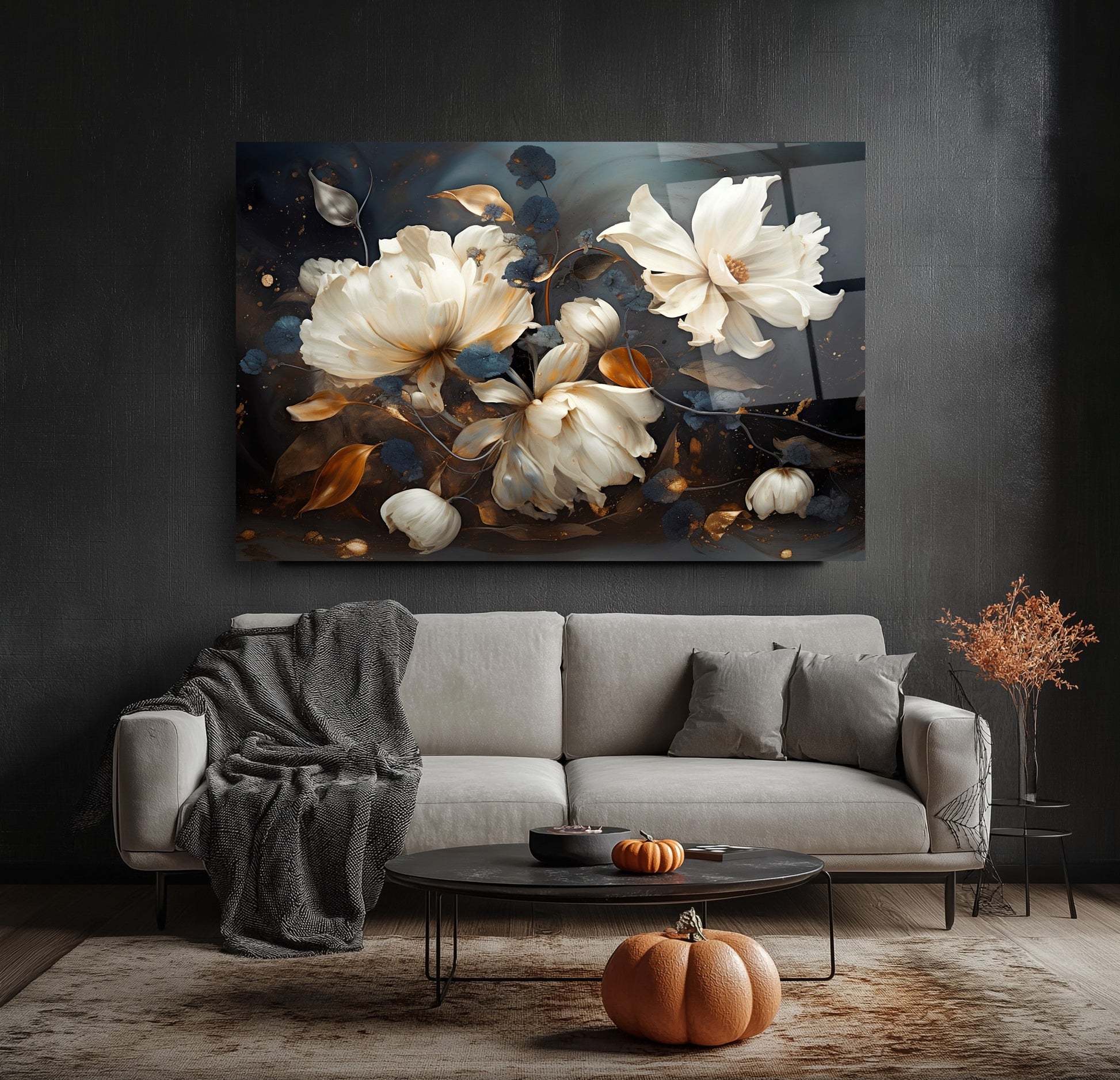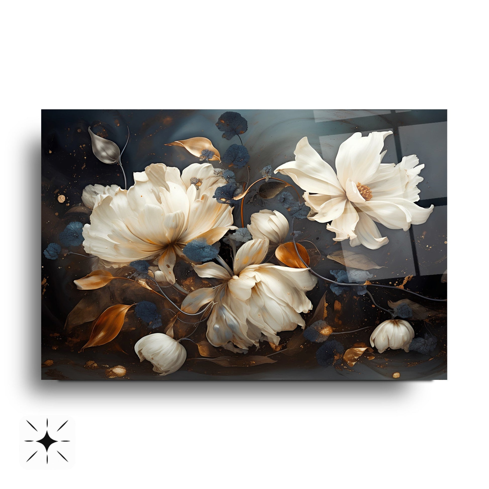 Turuncu yaprakların çevrelediği zarif beyaz çiçekler, siyah fon üzerinde etkileyici bir kontrastla göz kamaştırıyor. Bu tablo, yüksek çözünürlüklü UV baskı sayesinde uzun süre canlılığını korurken, temperli cam yapısı da dayanıklılık ve netlik sunuyor. Çerçevesiz, minimal tasarımıyla salon, yatak odası veya ofiste estetik bir odak noktası yaratır. Doğa temalı ve modern duvar dekoru arayanlar için ideal bir seçimdir.