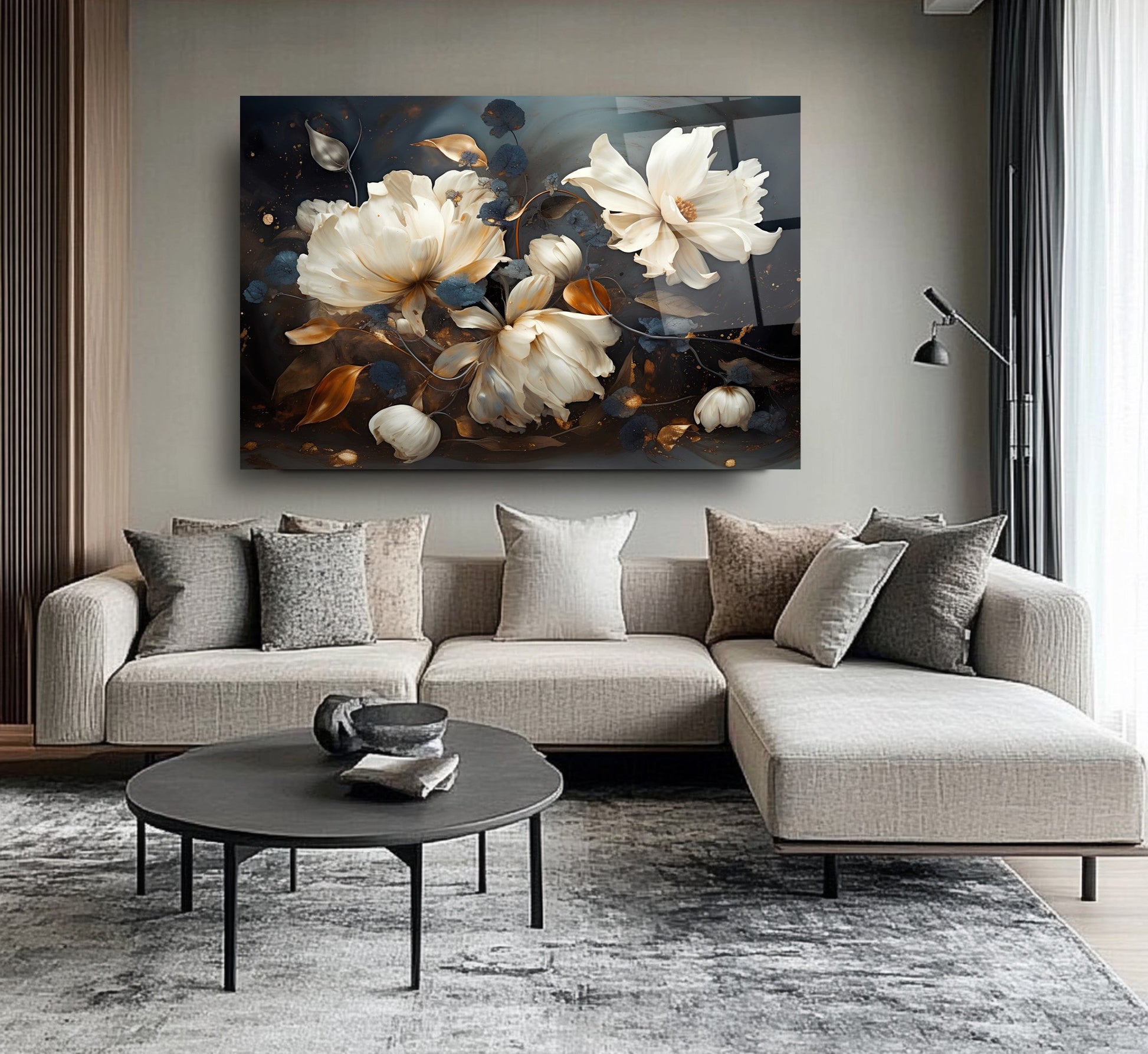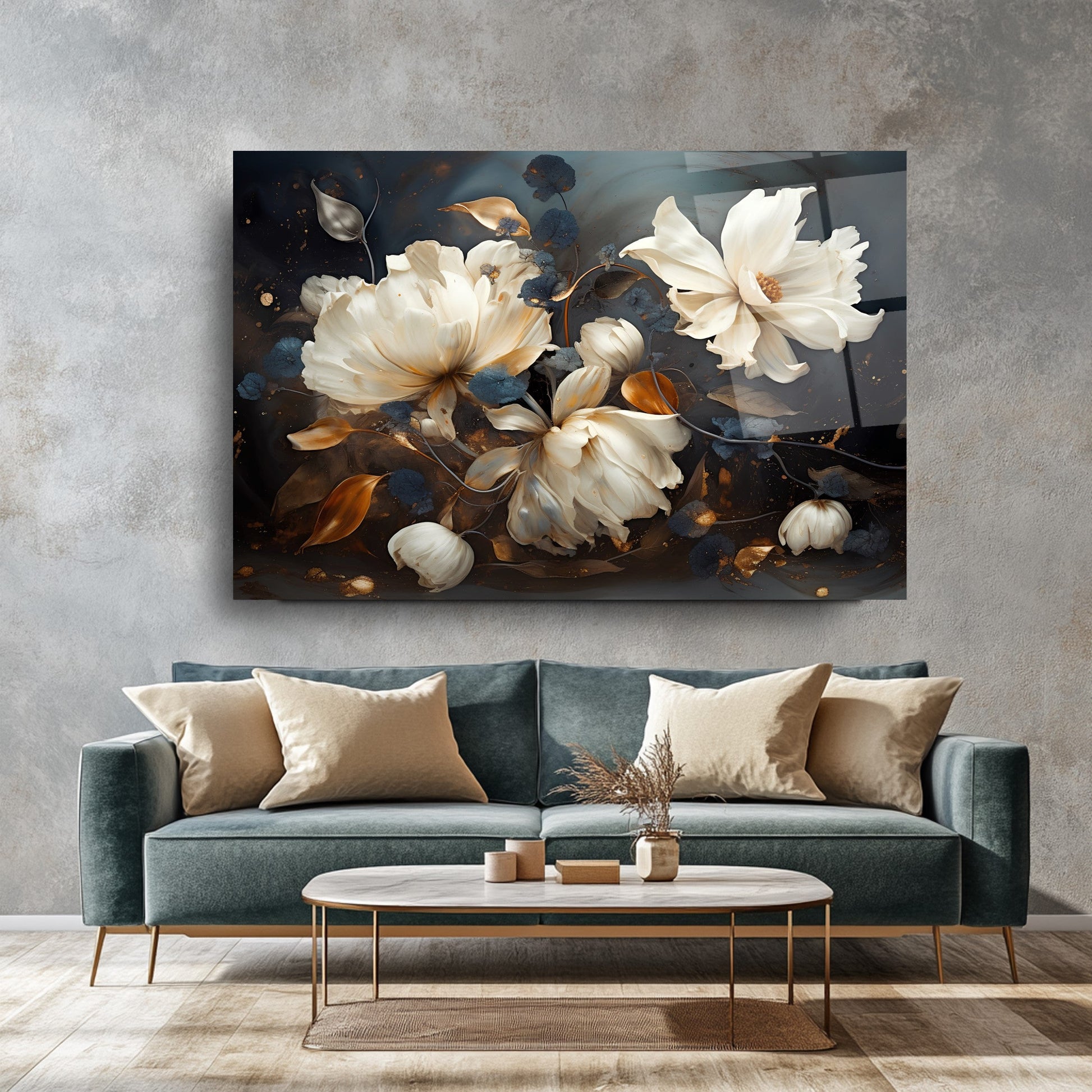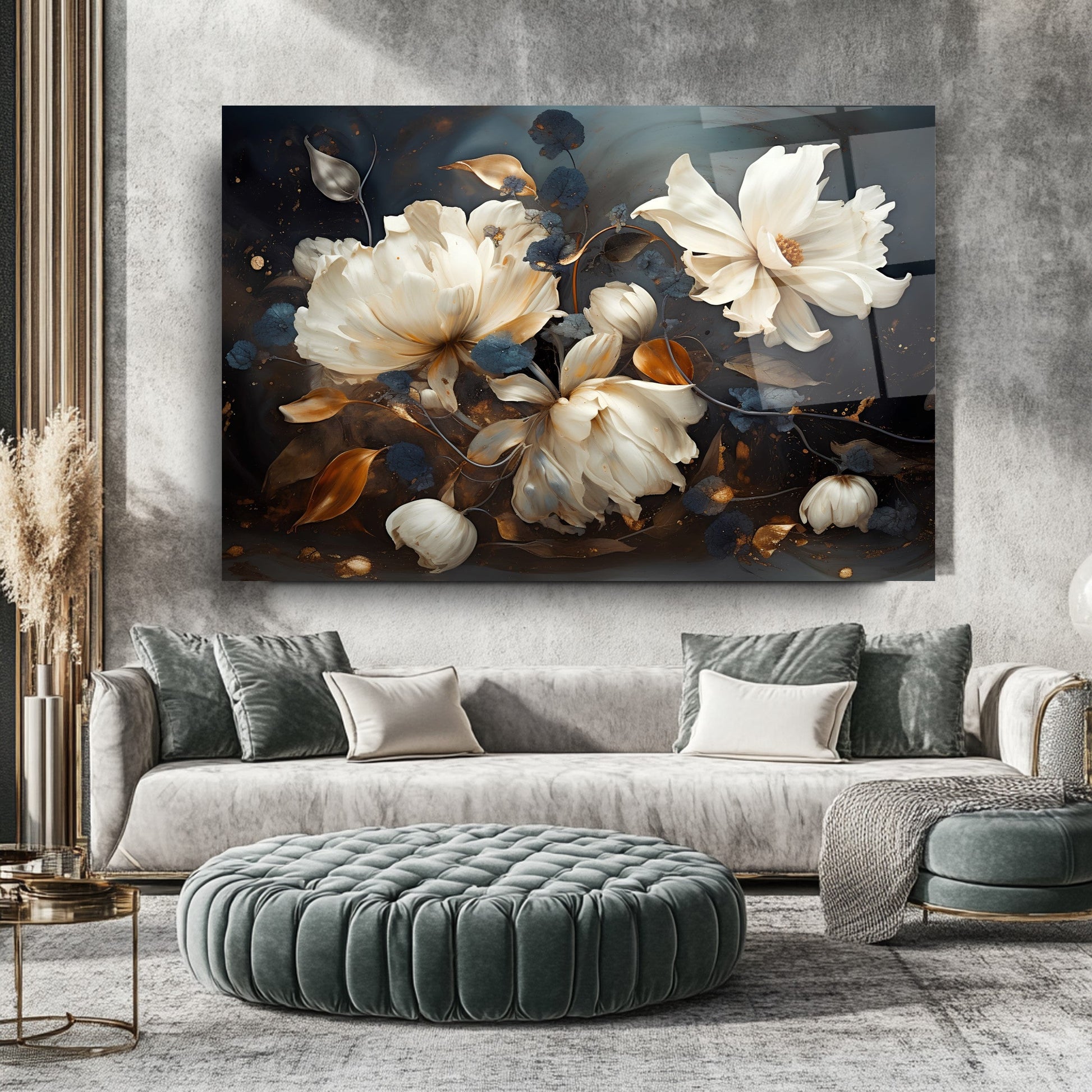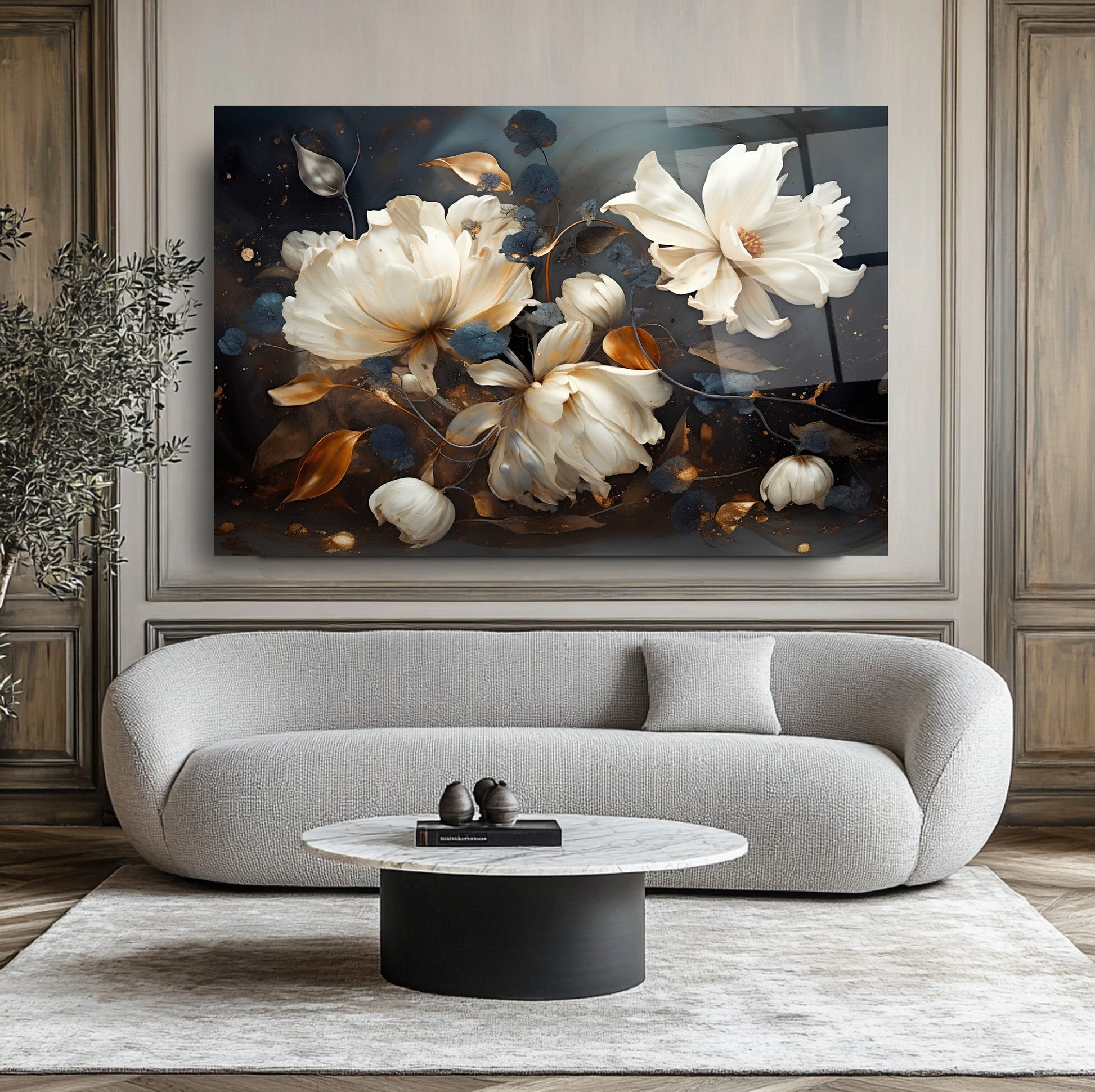 Turuncu yaprakların çevrelediği zarif beyaz çiçekler, siyah fon üzerinde etkileyici bir kontrastla göz kamaştırıyor. Bu tablo, yüksek çözünürlüklü UV baskı sayesinde uzun süre canlılığını korurken, temperli cam yapısı da dayanıklılık ve netlik sunuyor. Çerçevesiz, minimal tasarımıyla salon, yatak odası veya ofiste estetik bir odak noktası yaratır. Doğa temalı ve modern duvar dekoru arayanlar için ideal bir seçimdir.