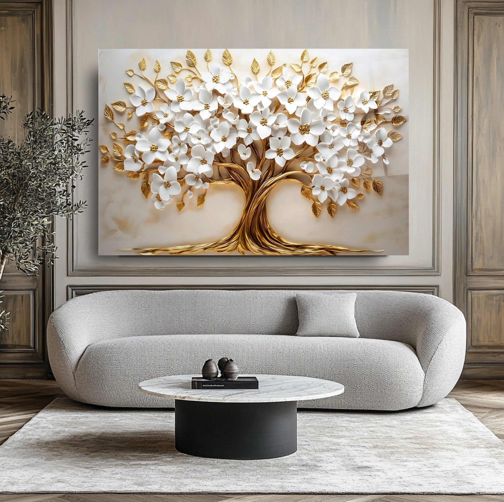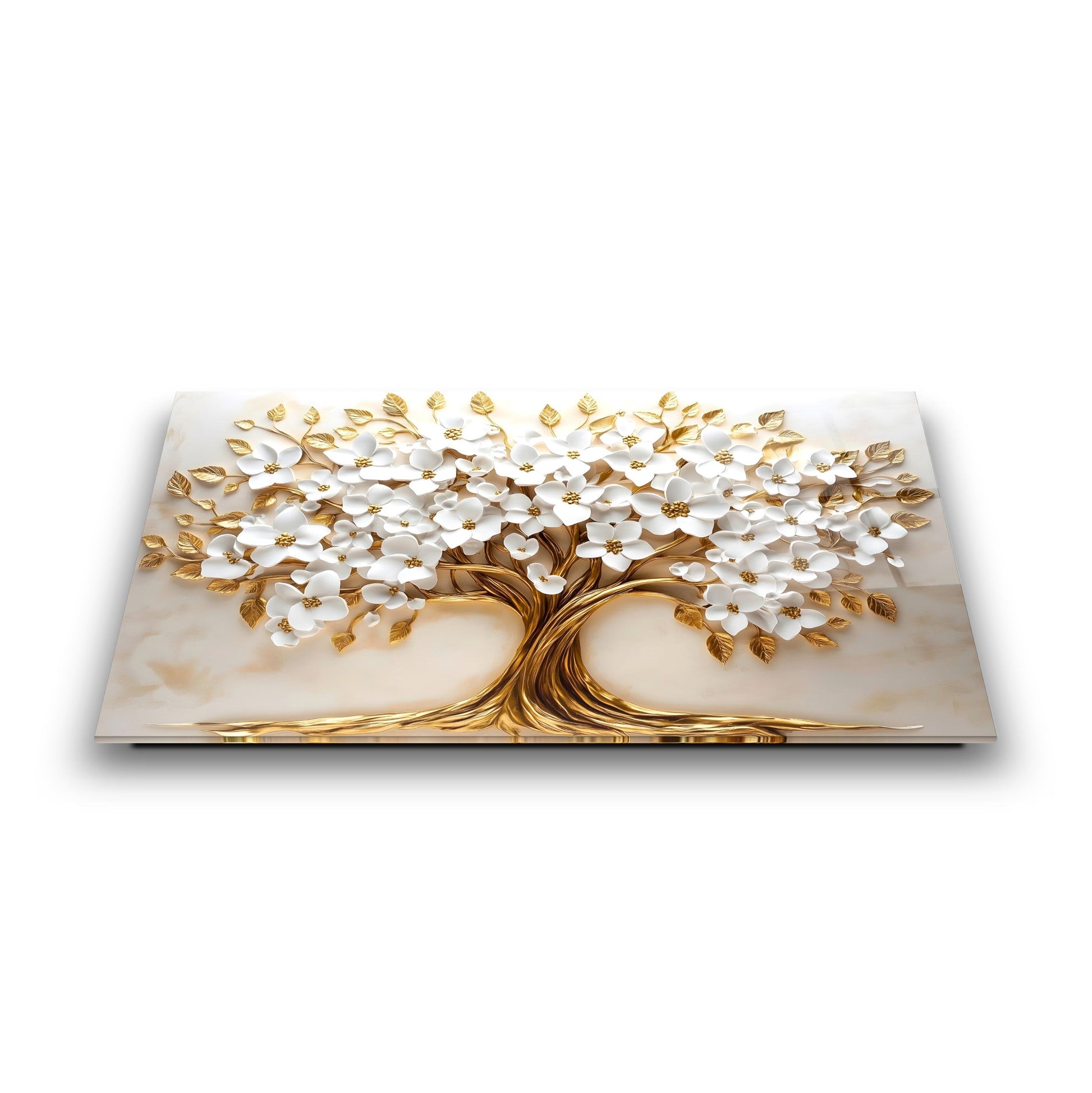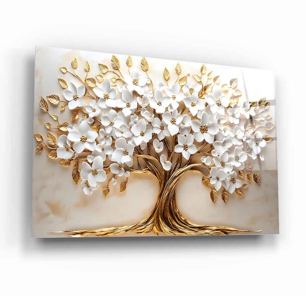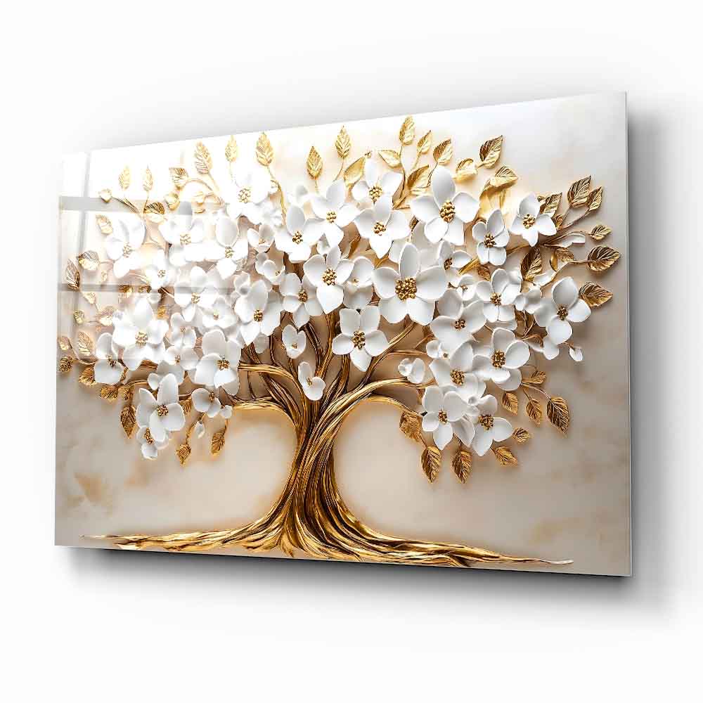 Mekanlarınıza Beyaz Saflık ve Altın Işıltılı Bir Yaşam: Beyaz Gold Çiçek Hayat Ağacı Cam Tablo