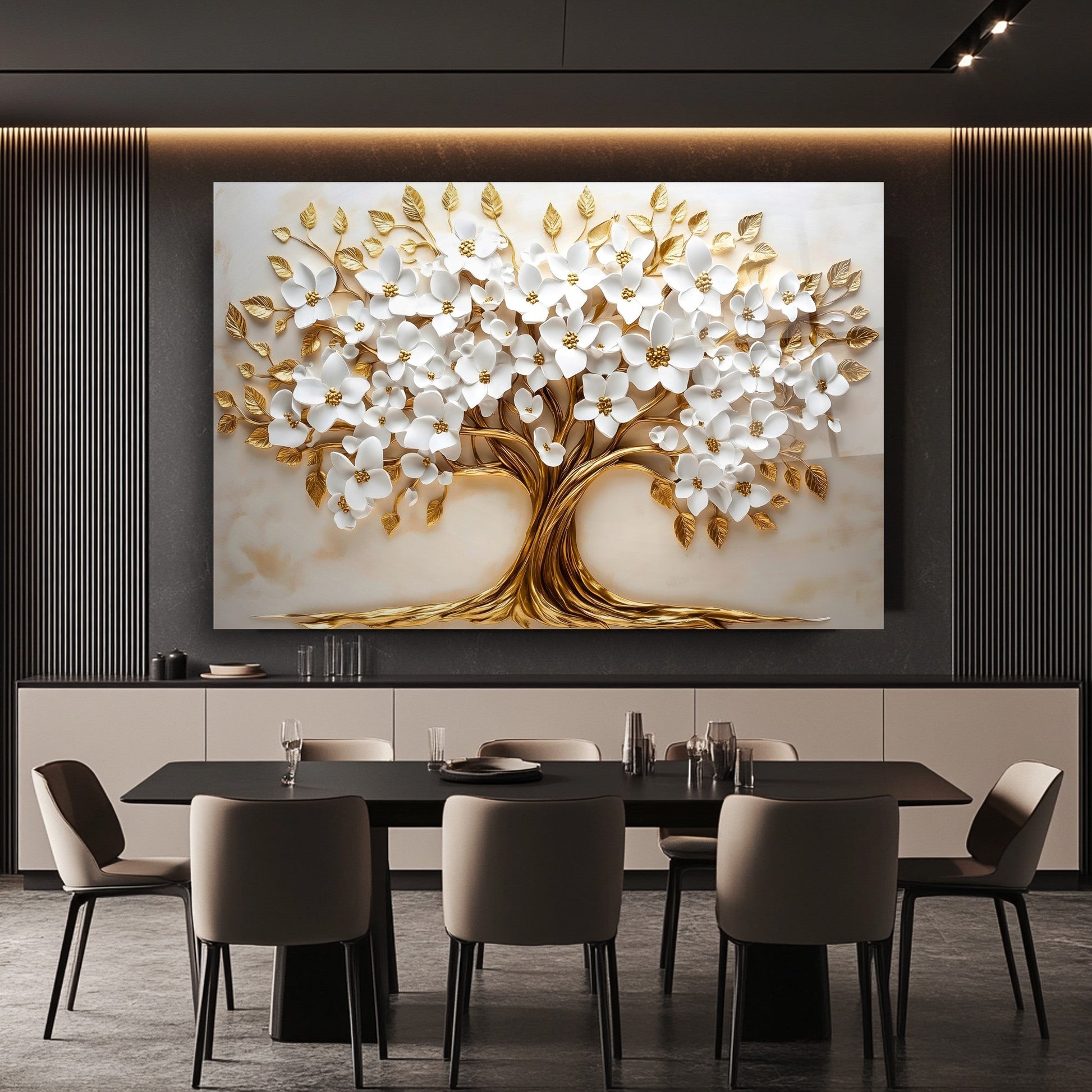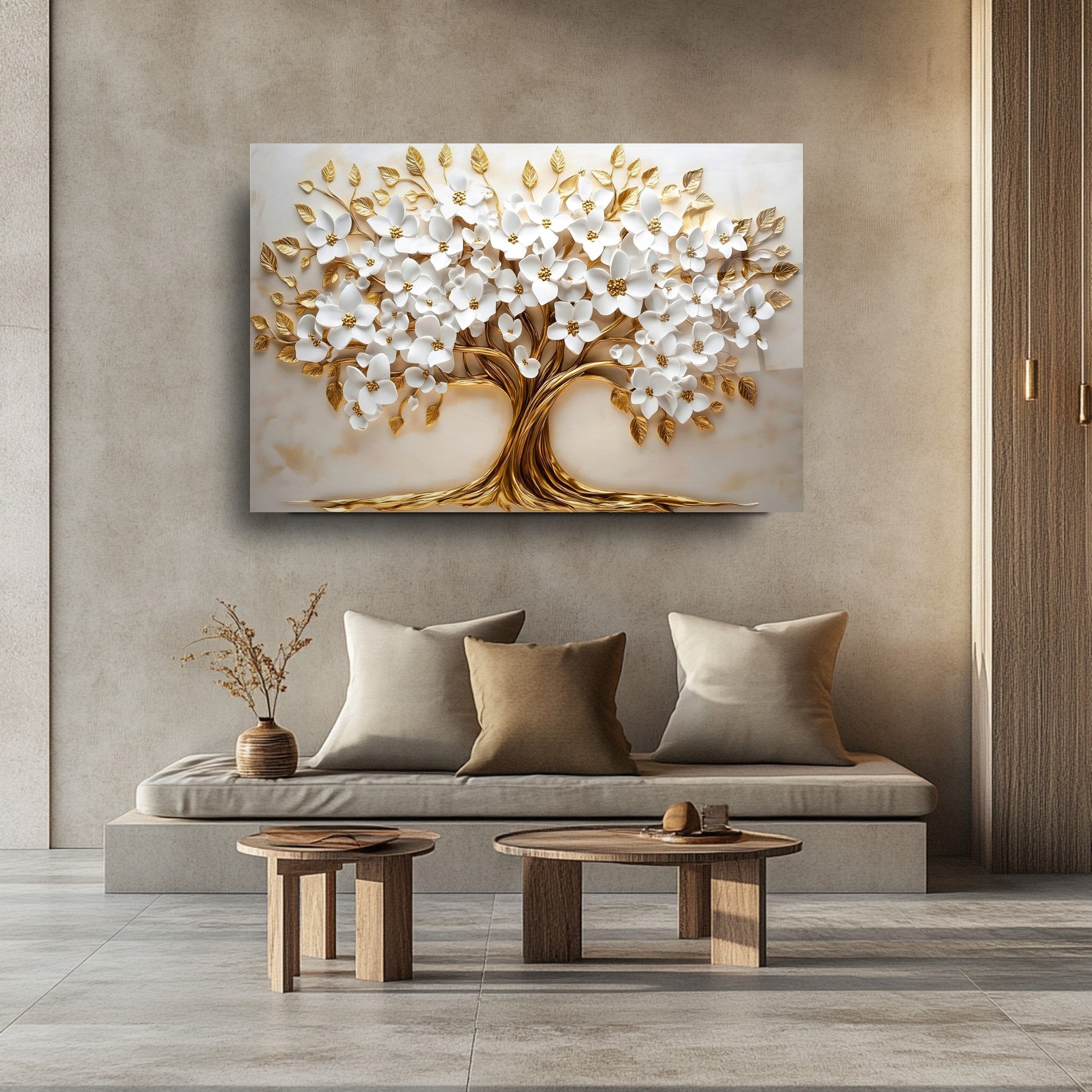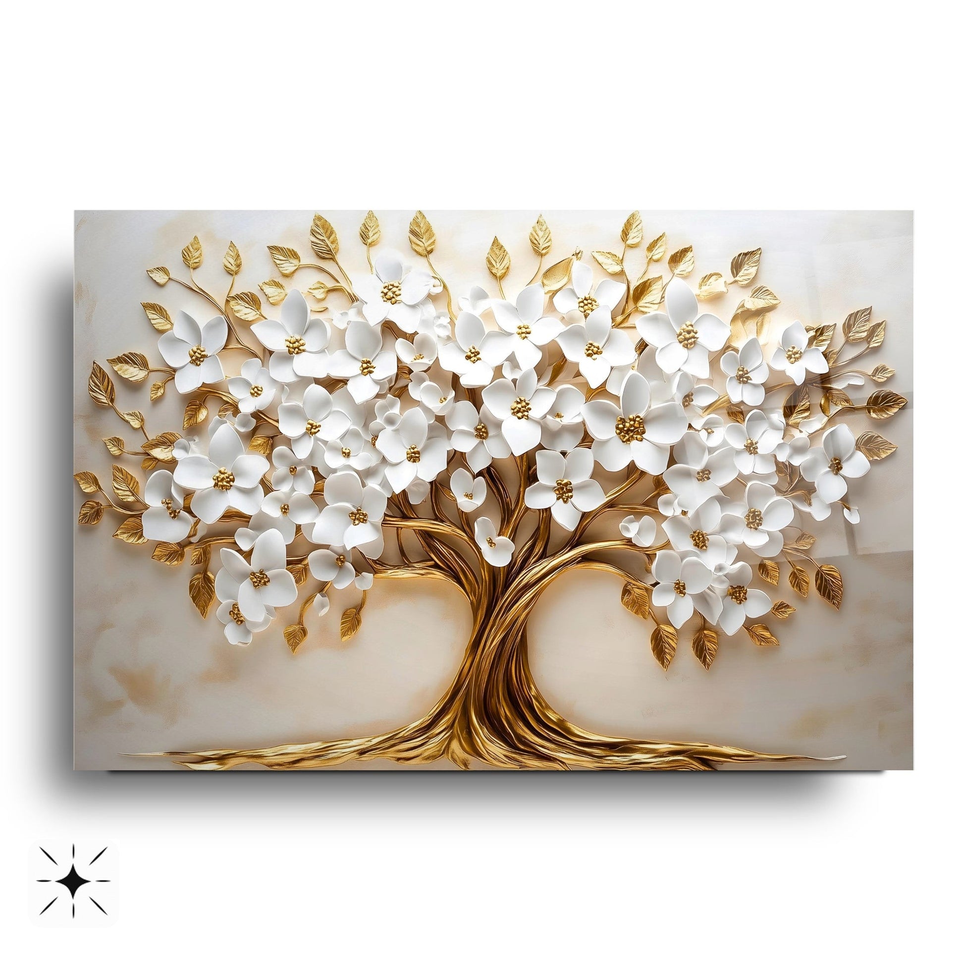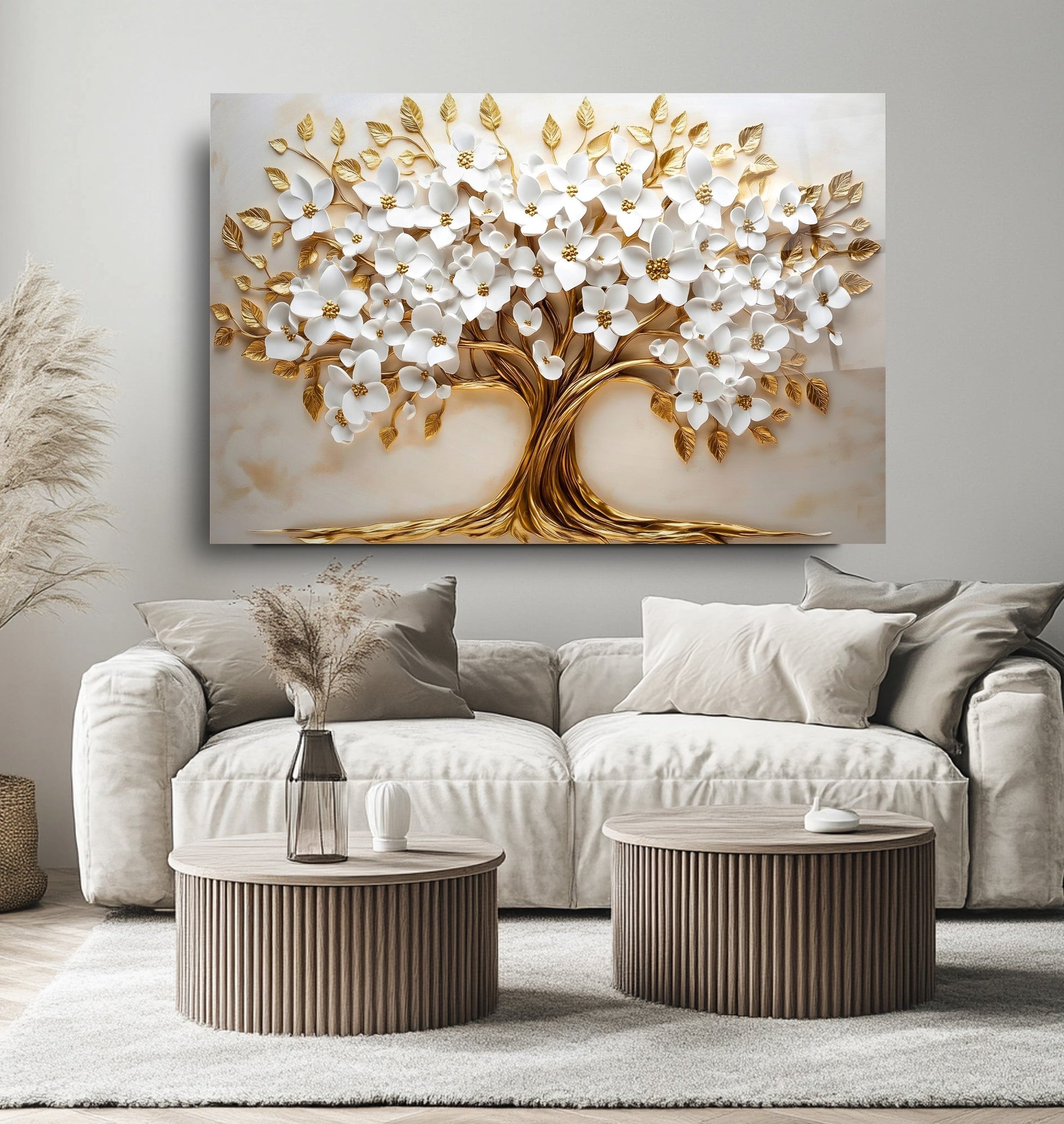 Mekanlarınıza Beyaz Saflık ve Altın Işıltılı Bir Yaşam: Beyaz Gold Çiçek Hayat Ağacı Cam Tablo