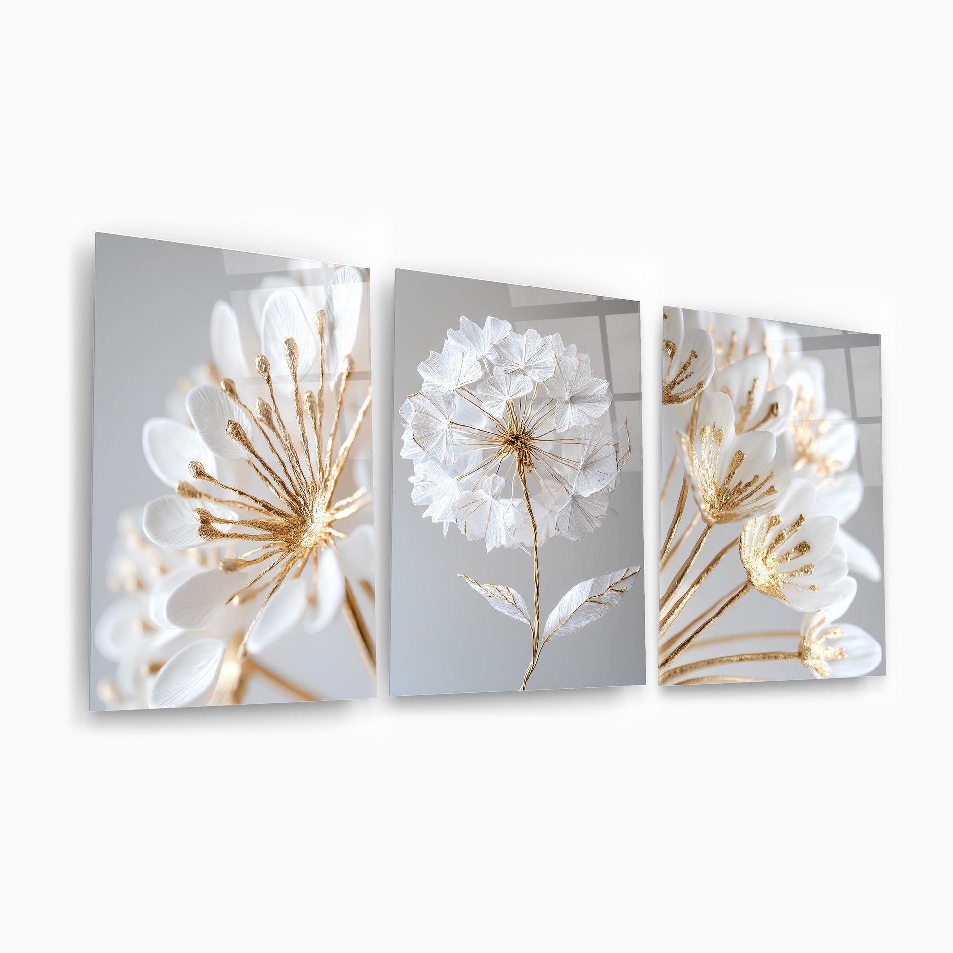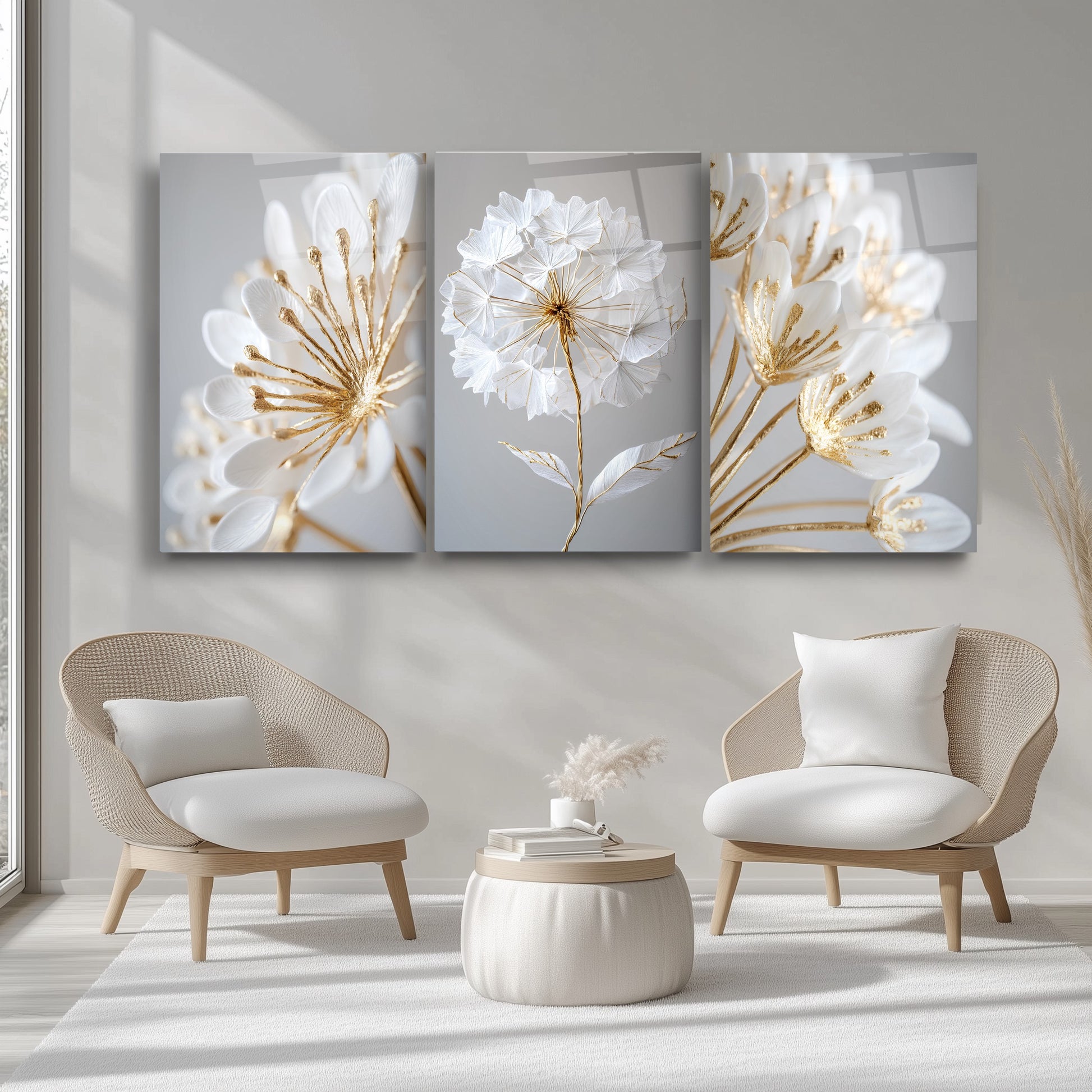 Beyaz ve gold detaylı soft minimal çiçekler üçlü cam tablo seti, zarif ve modern bir dekorasyon seçeneği sunar. Karahindiba motifleriyle tasarlanan bu tablolar, sakin ve şık bir atmosfer yaratır. Kırılmaz temperli cam üzerine UV baskı ile üretilen bu set, uzun ömürlü ve dayanıklıdır. Oturma odası, yatak odası veya ofis gibi alanlarda estetik bir dokunuş sağlar. Cam baskı teknolojisi sayesinde renkler canlı kalır, mekanlarınıza sofistike bir hava katar. Modern yaşam alanları için ideal, şıklığı ve fonksiyonelliği bir arada sunar.