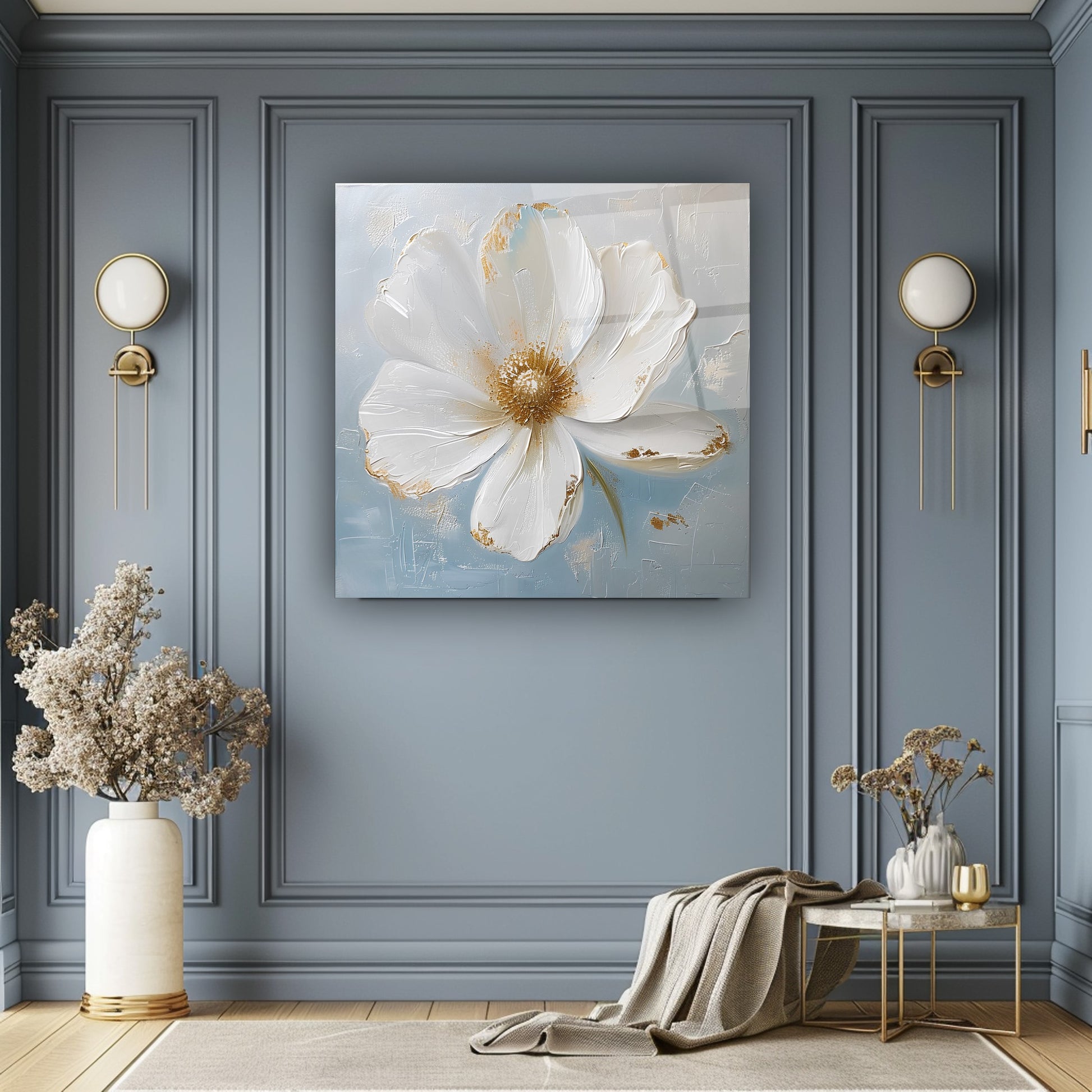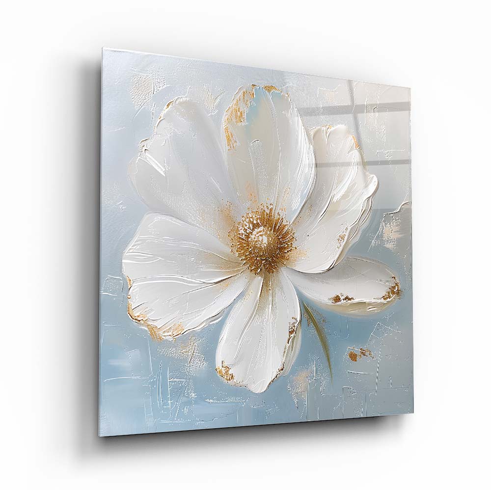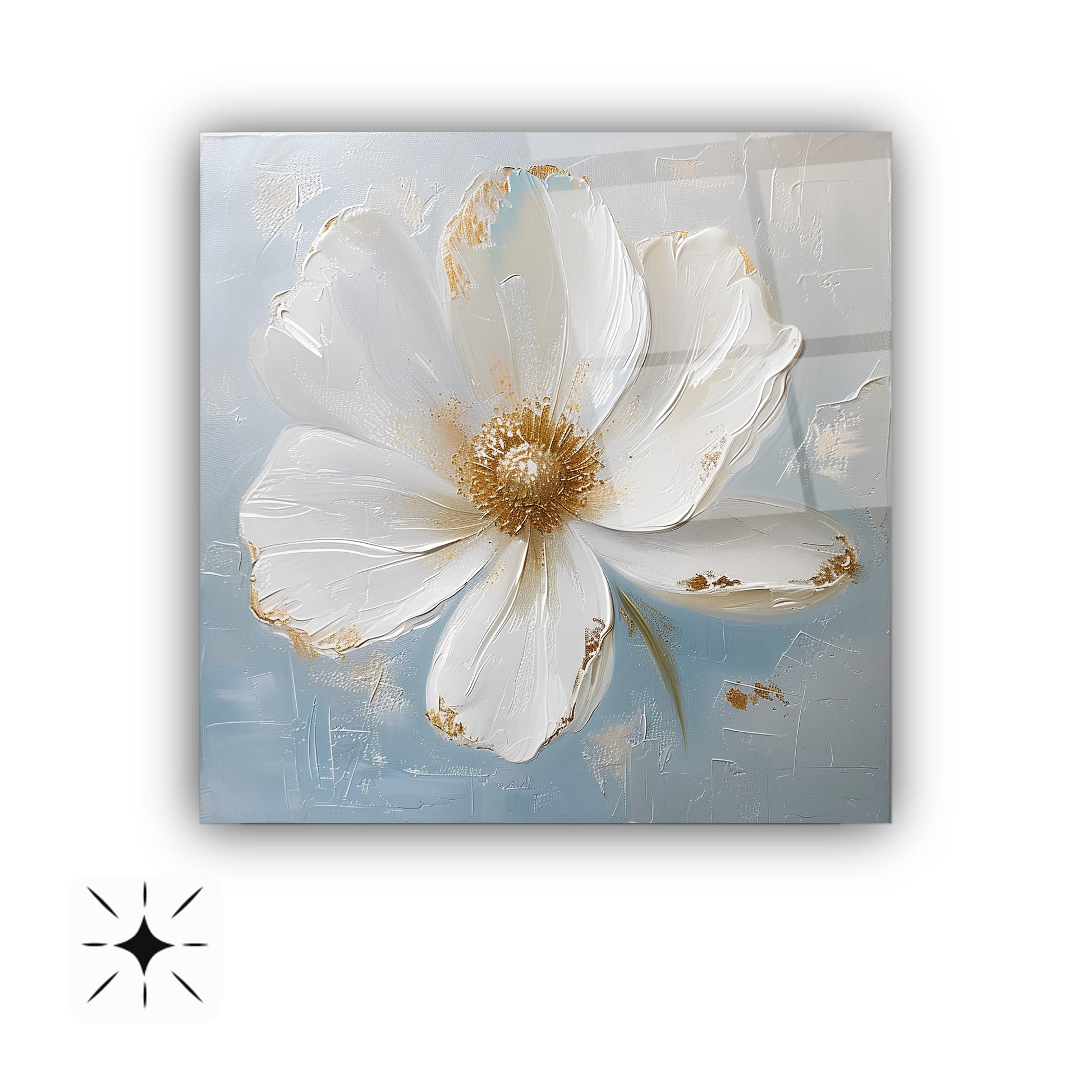 Beyaz zemin üzerinde gold detaylarla süslenen mavi ve beyaz çiçekler, minimal yağlı boya efektiyle zarif bir estetik sunar. Bu gerçek cam tablo, modern ve sade yaşam alanlarına şıklık katar. Kırılmaz cam tablo yapısıyla dayanıklı ve uzun ömürlü bir dekorasyon seçeneğidir.