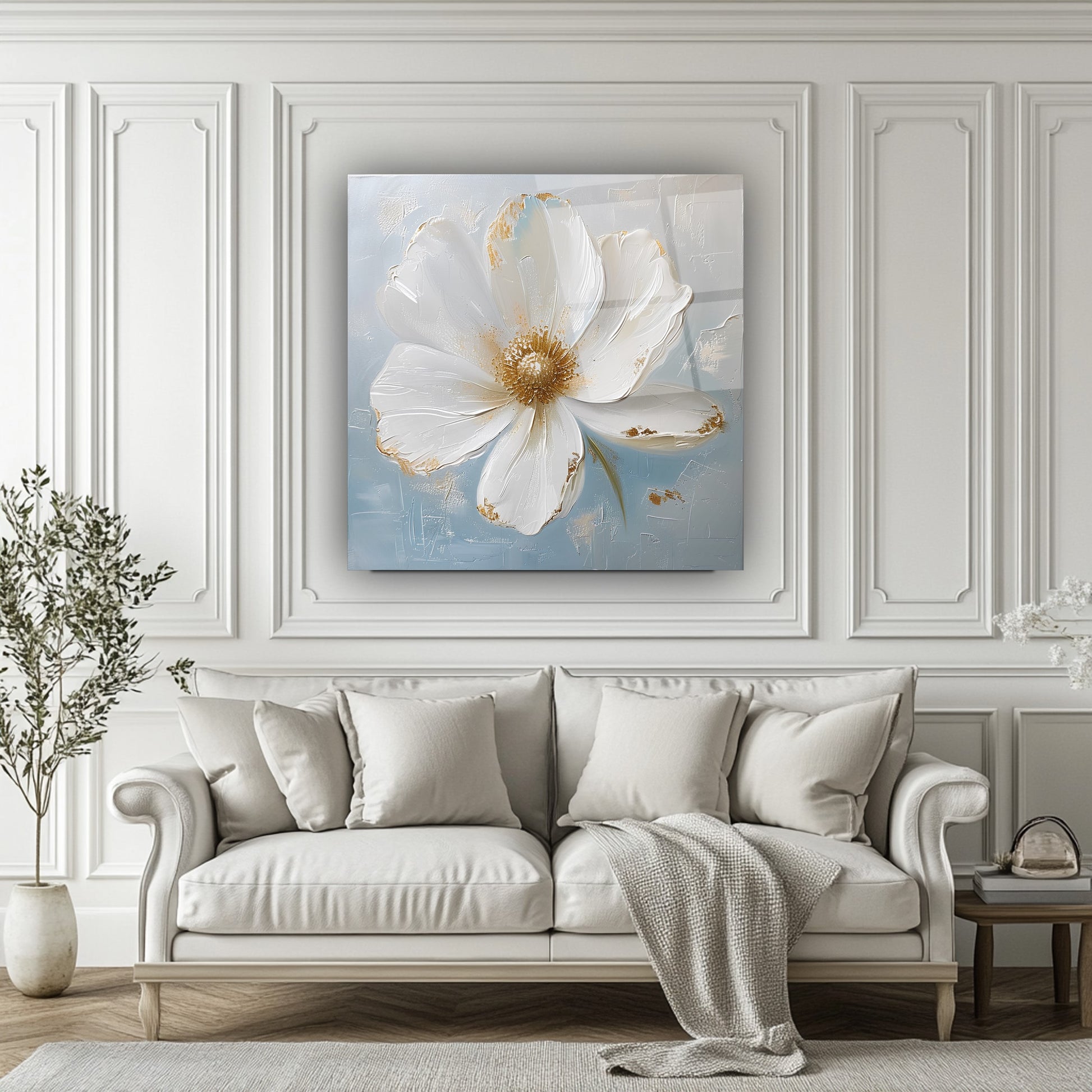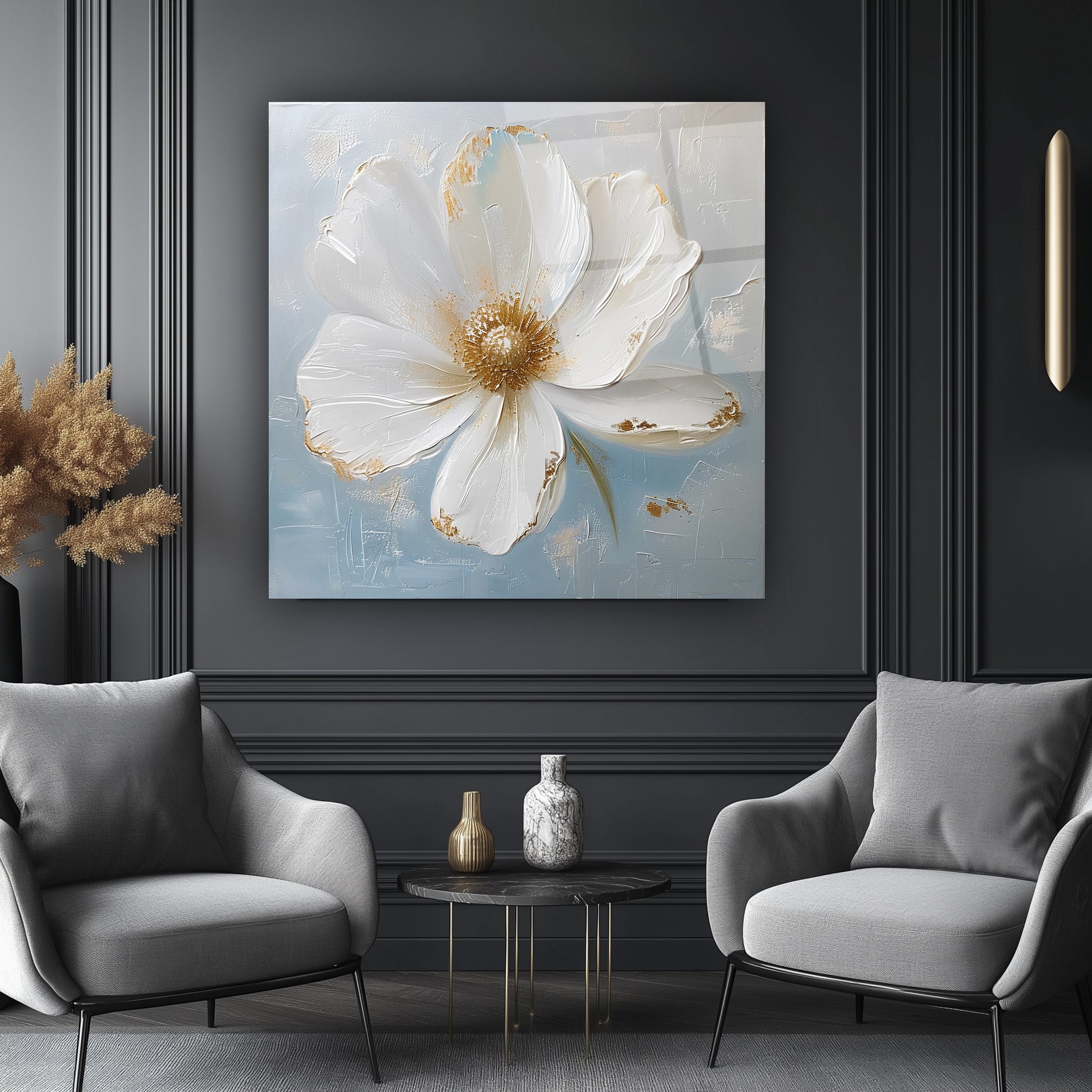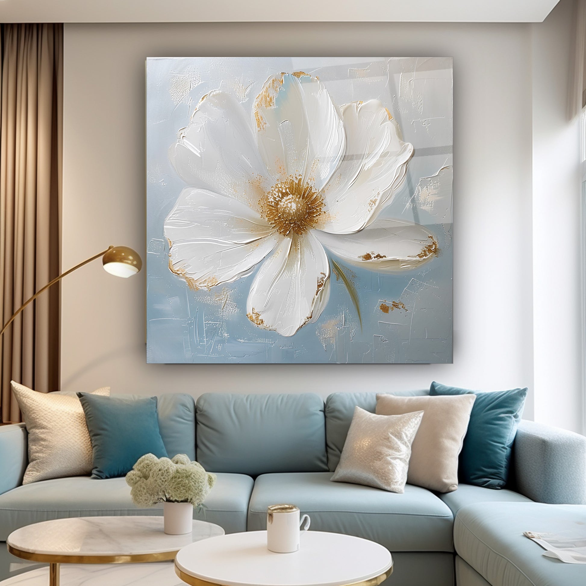 Beyaz zemin üzerinde gold detaylarla süslenen mavi ve beyaz çiçekler, minimal yağlı boya efektiyle zarif bir estetik sunar. Bu gerçek cam tablo, modern ve sade yaşam alanlarına şıklık katar. Kırılmaz cam tablo yapısıyla dayanıklı ve uzun ömürlü bir dekorasyon seçeneğidir.