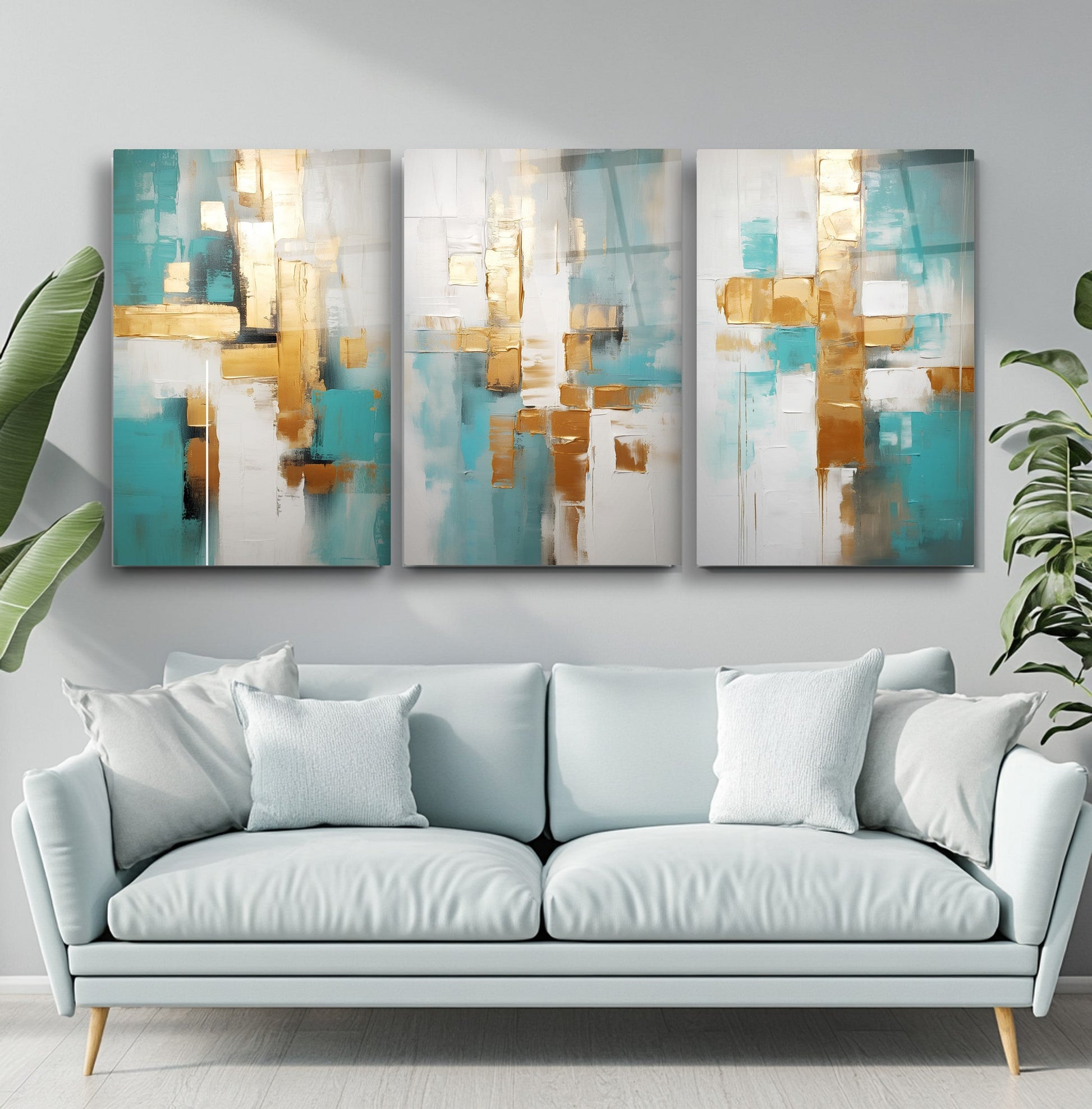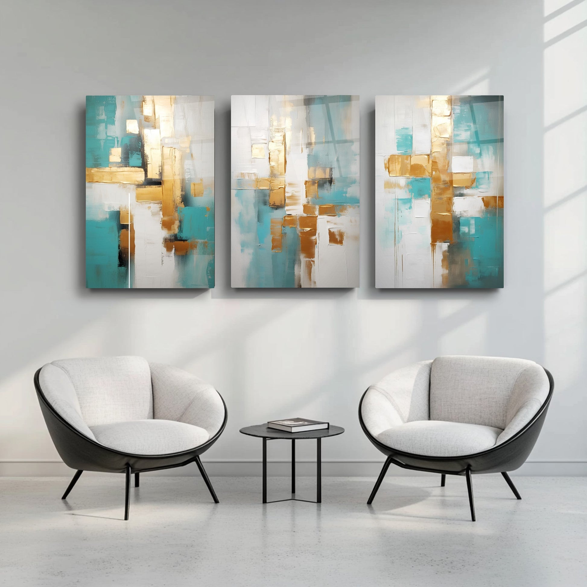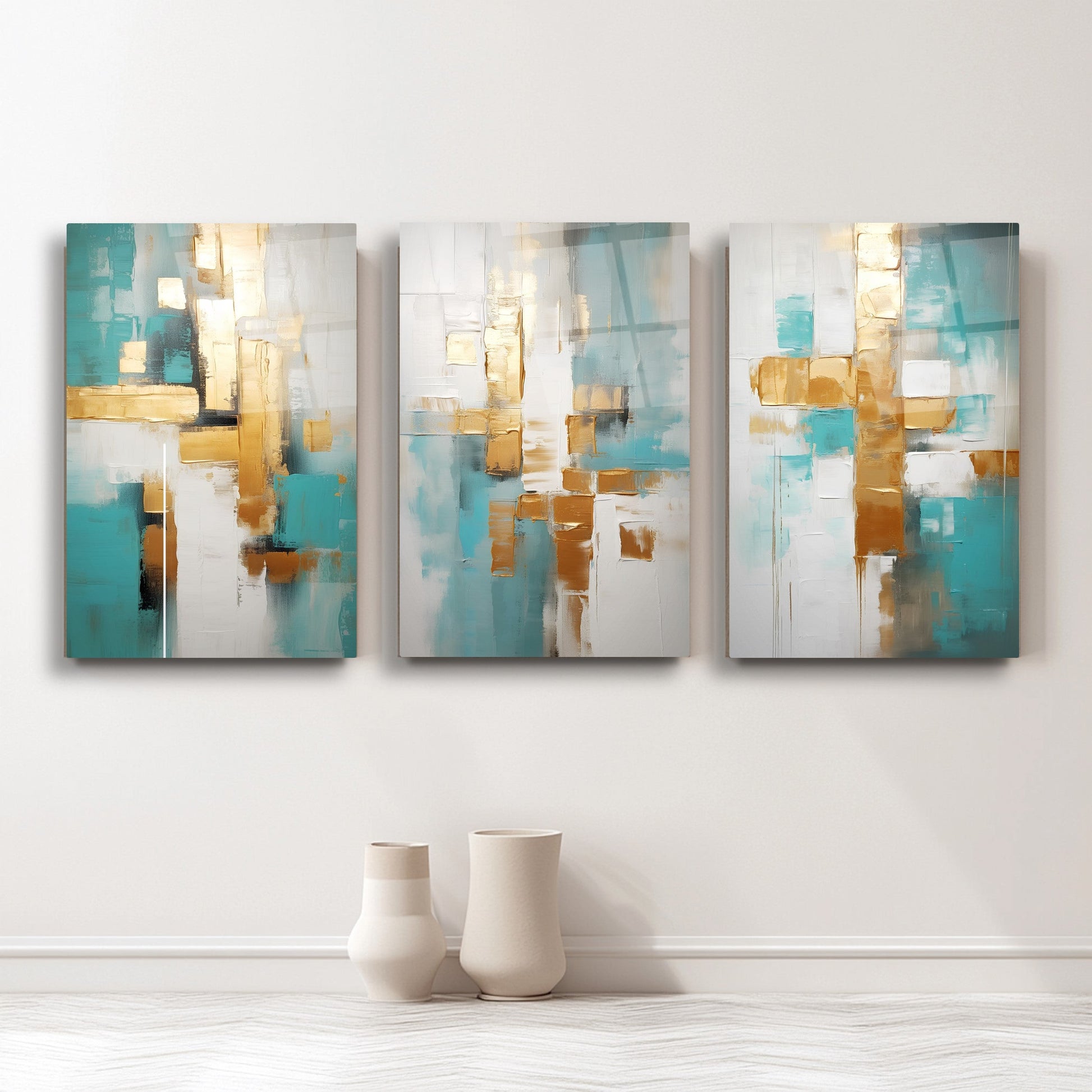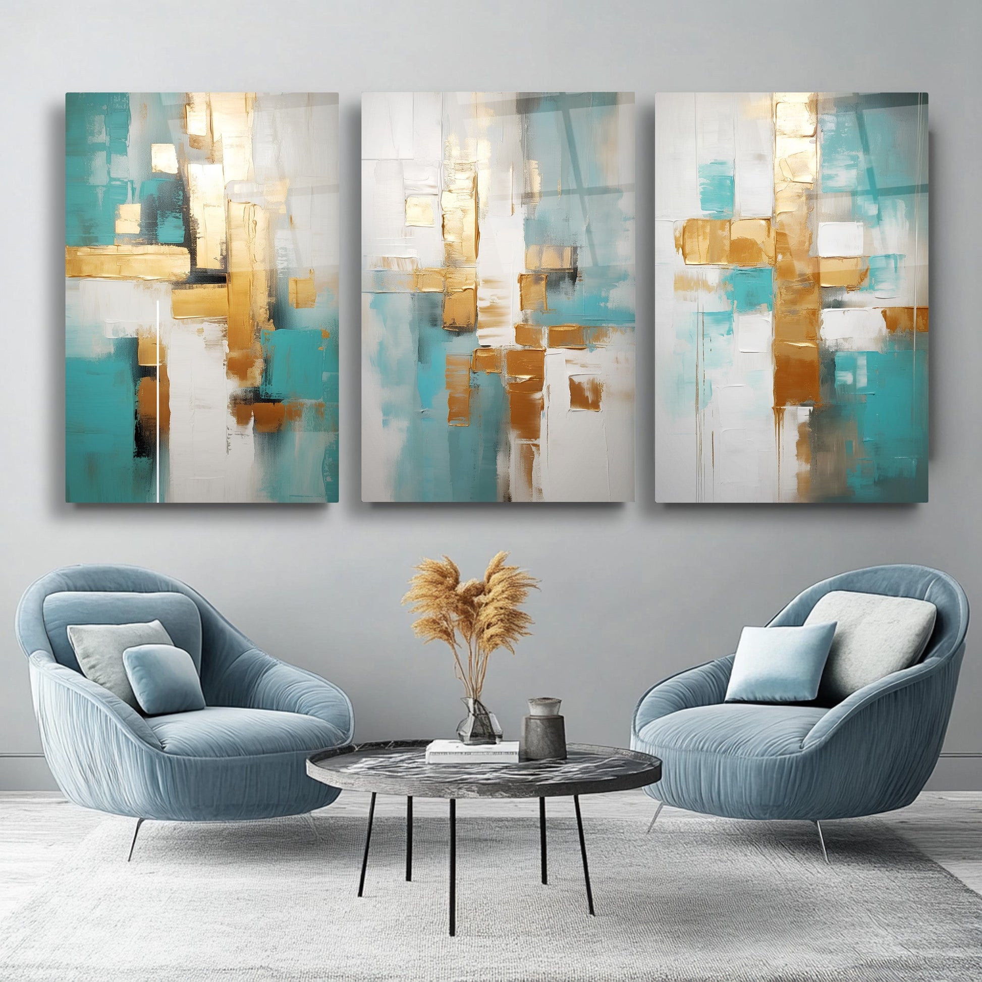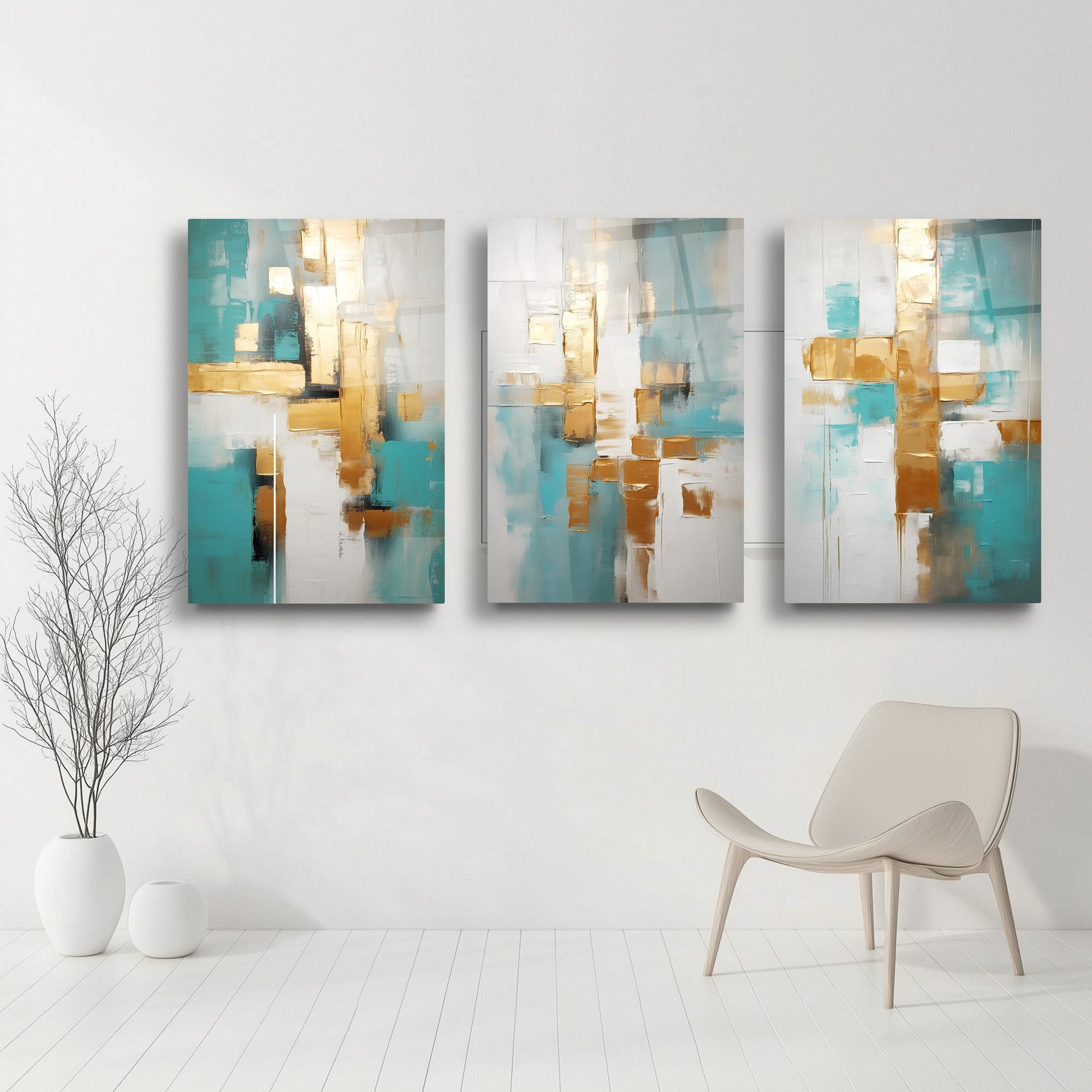 Beyaz zemin üzerinde gold, turkuaz ve mavi tonlarıyla oluşturulan soyut desenler, bu kırılmaz cam tablo üçlü setine modern ve ferah bir hava kazandırır. Boho ve minimal tarzı yansıtan tasarımı, salonlara zarif bir estetik katar. Temperli cam yapısı dayanıklıdır. Dingin renk geçişleriyle dekorasyona canlılık katmak isteyenler için şık ve çağdaş bir seçimdir.
