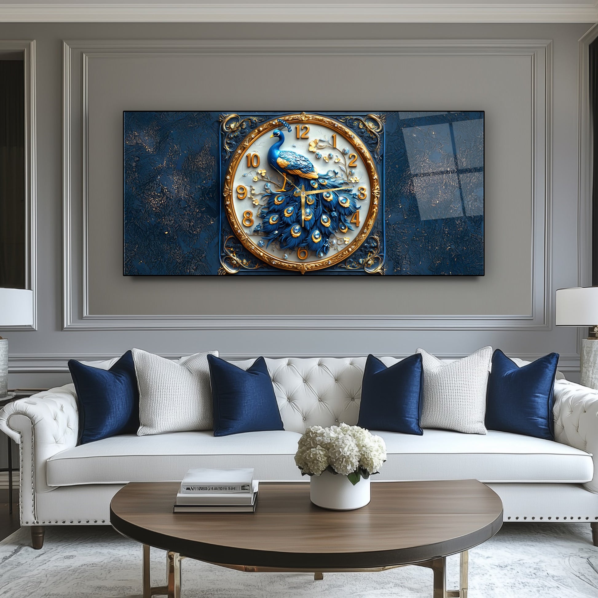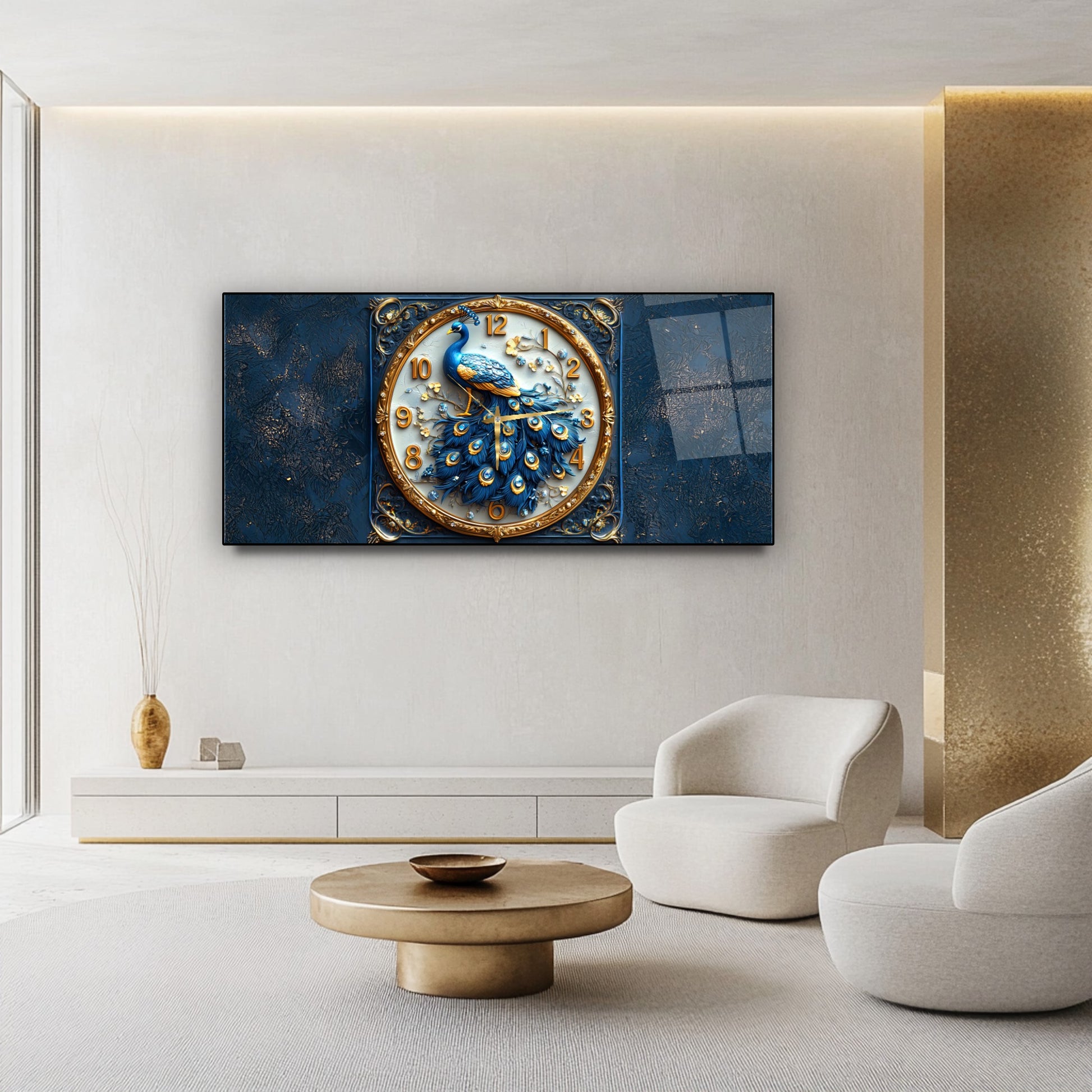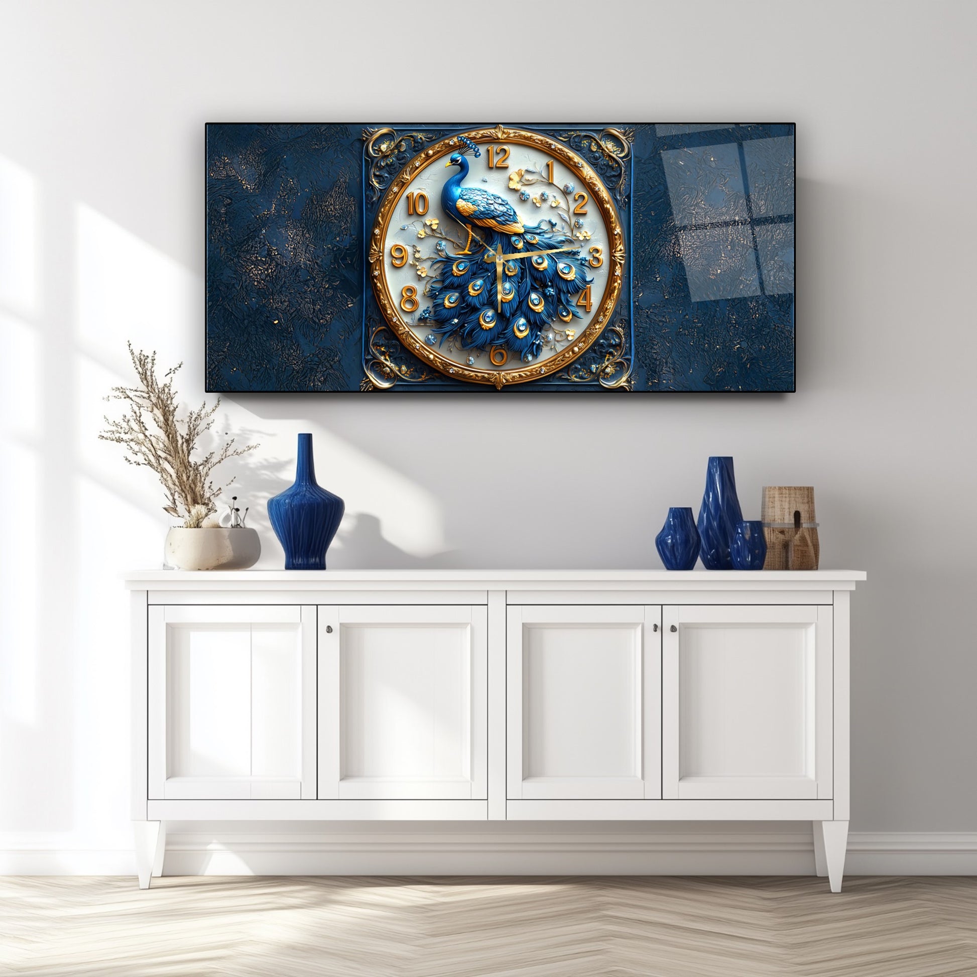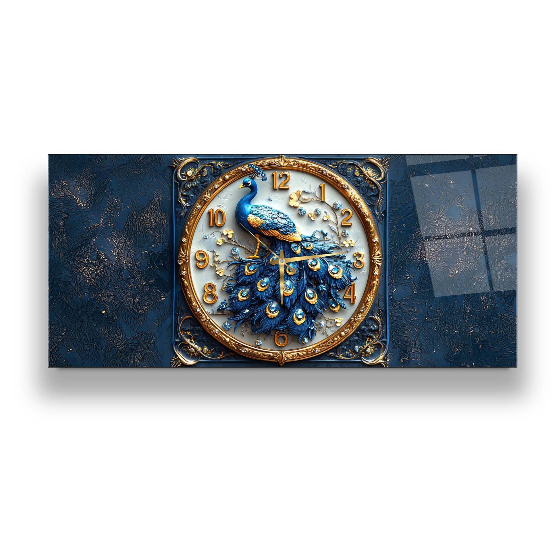 Mavi Tavus Kuşu Cam Duvar Saati