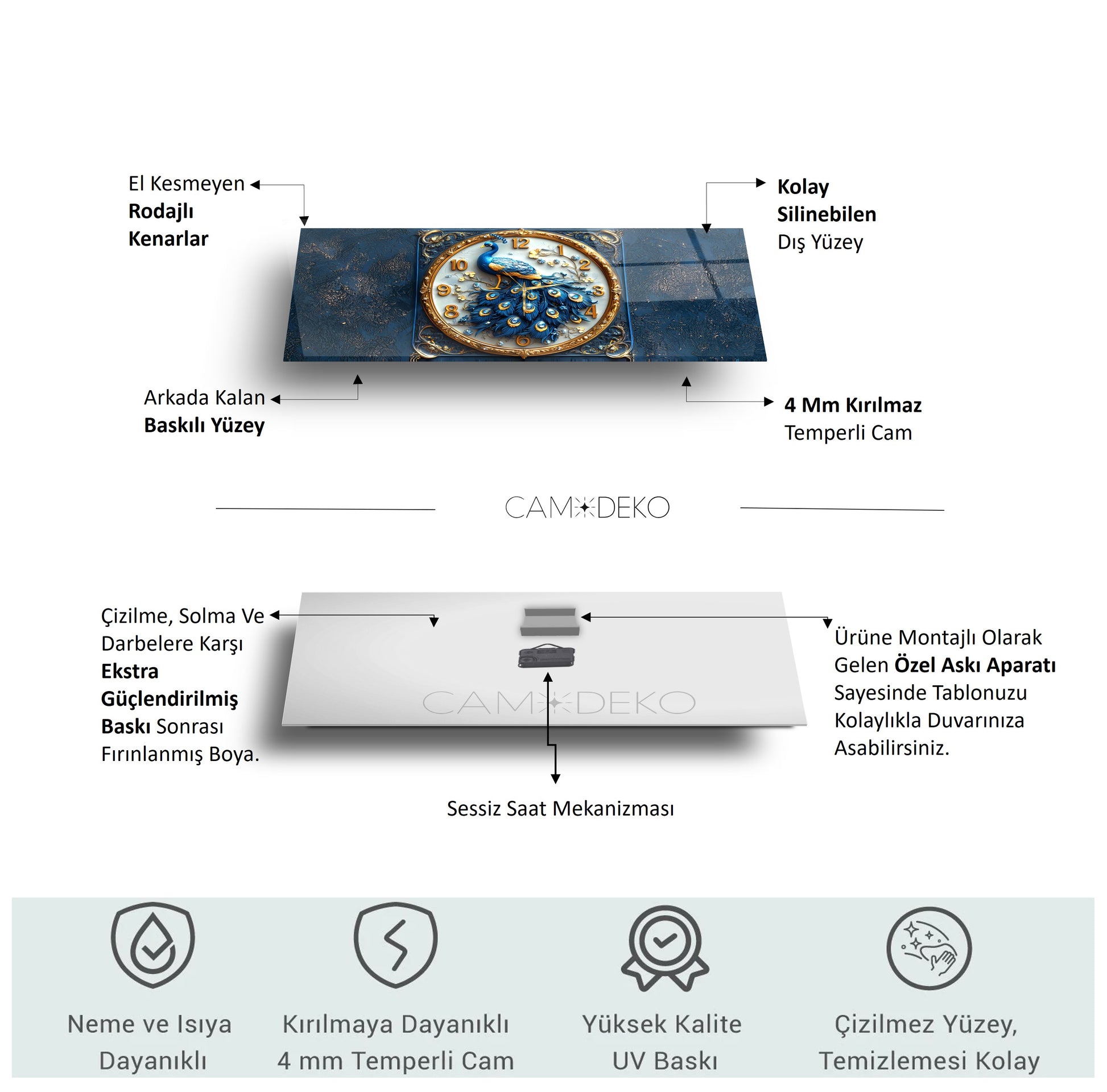 Cam saatlerimiz, son teknoloji UV baskı makineleriyle doğrudan cama uygulanır. Kağıt veya folyo yapıştırma kullanılmaz; baskılar camın arka yüzeyine işlenerek uzun ömürlü ve dayanıklı hale getirilir. Ek olarak, fırınlama boya işlemi ile güçlendirilerek solmaya ve deformasyona karşı ekstra koruma sağlanır.