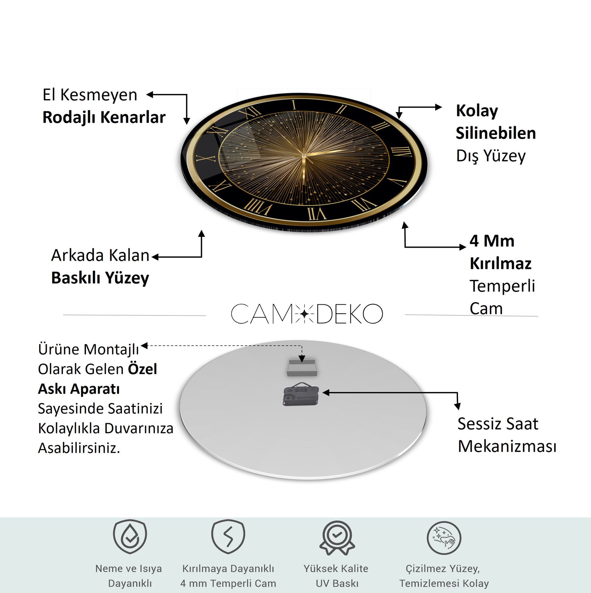 Saatlerimizde 4 mm kalınlığında ultra clear temperli cam kullanılır. Rodajlanmış (el kesmeyen) kenarları, hem güvenli hem de estetik bir görünüm sunar. Zamansız tasarımıyla ev ve ofis dekorasyonuna şıklık katar.