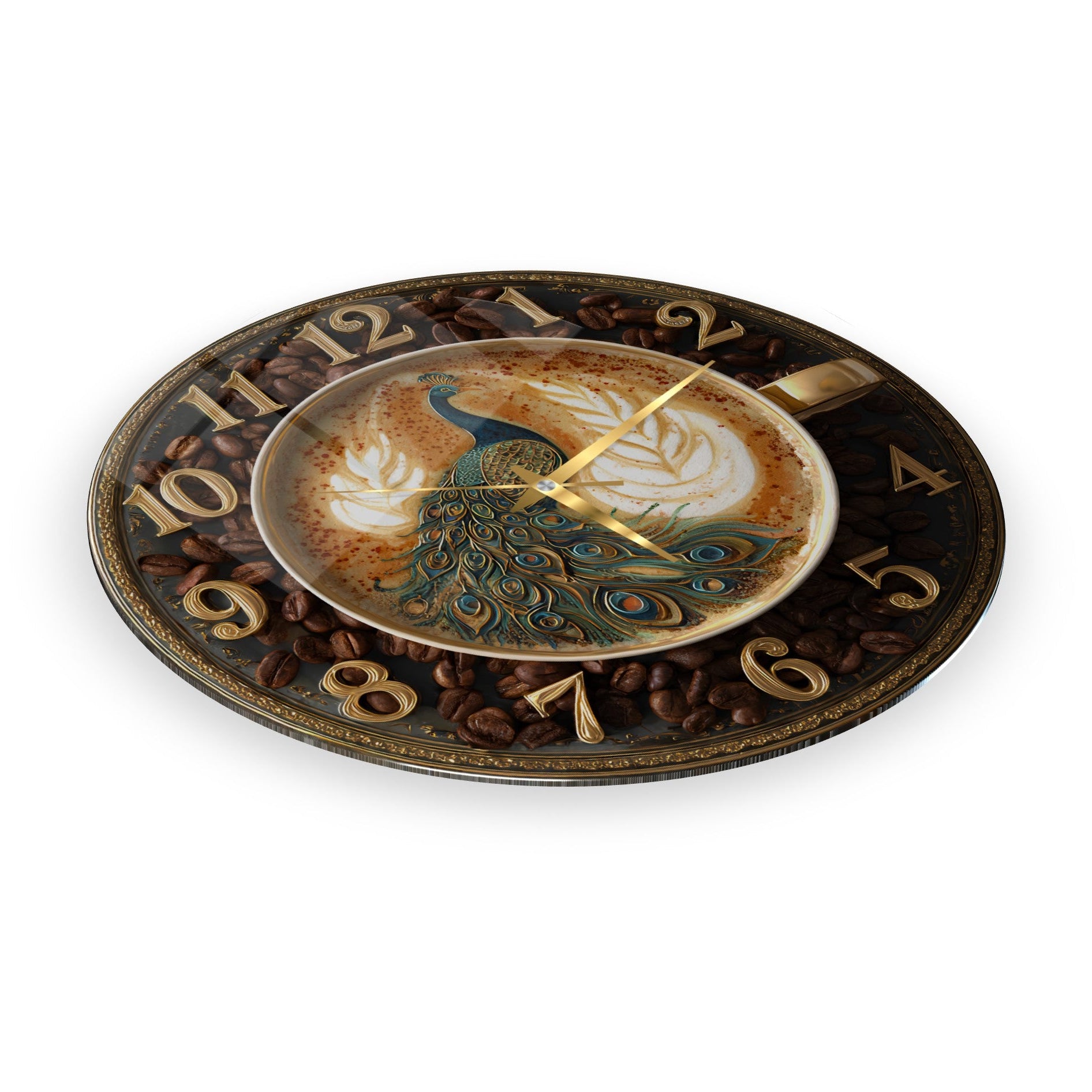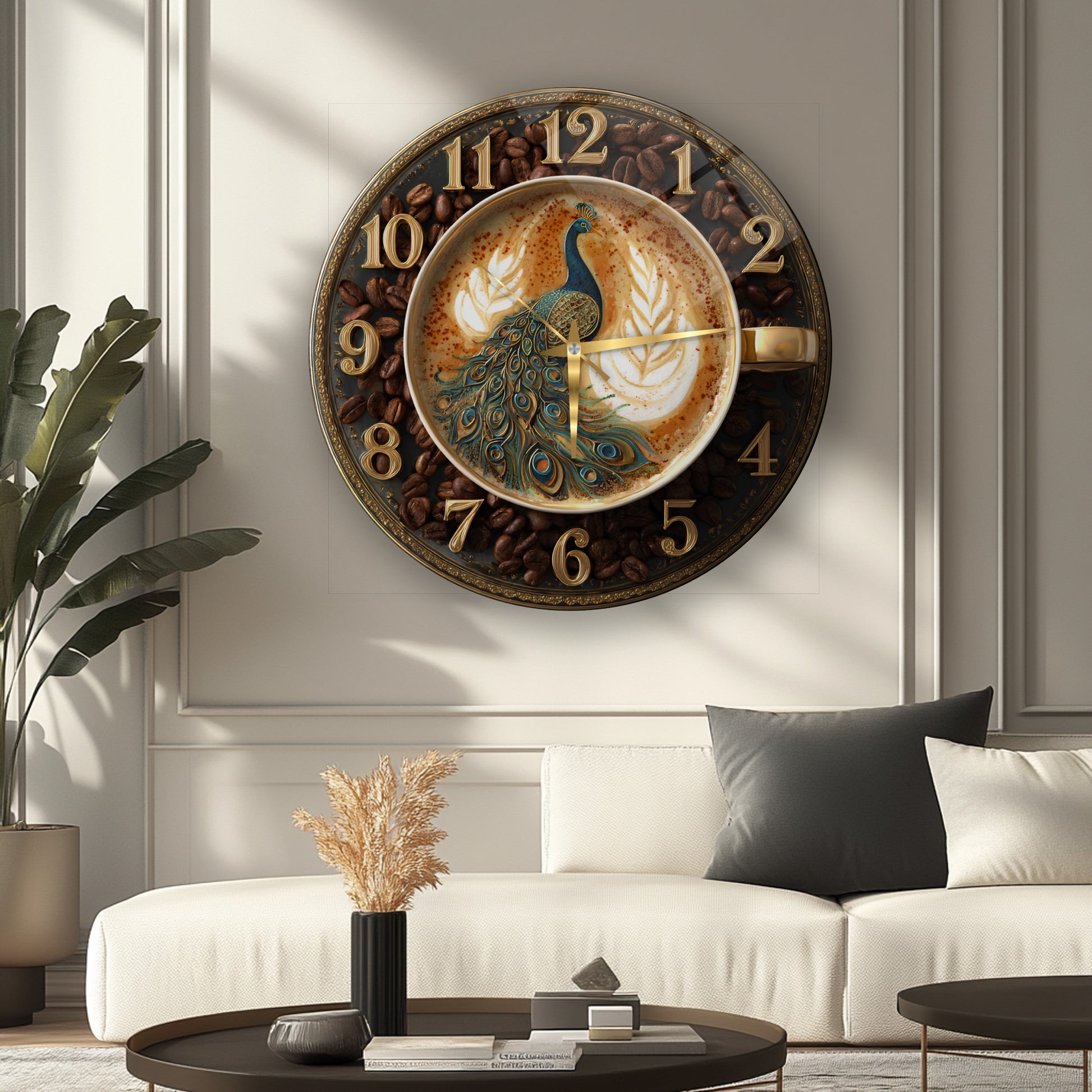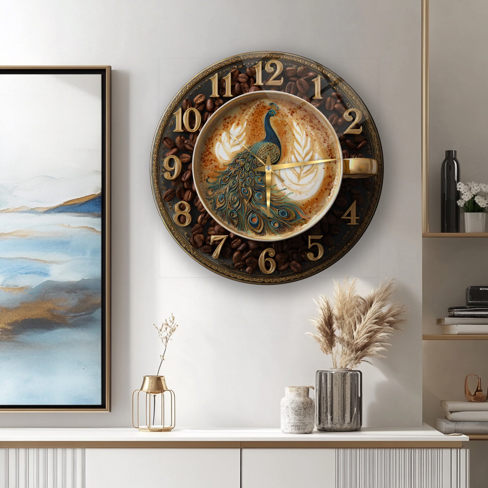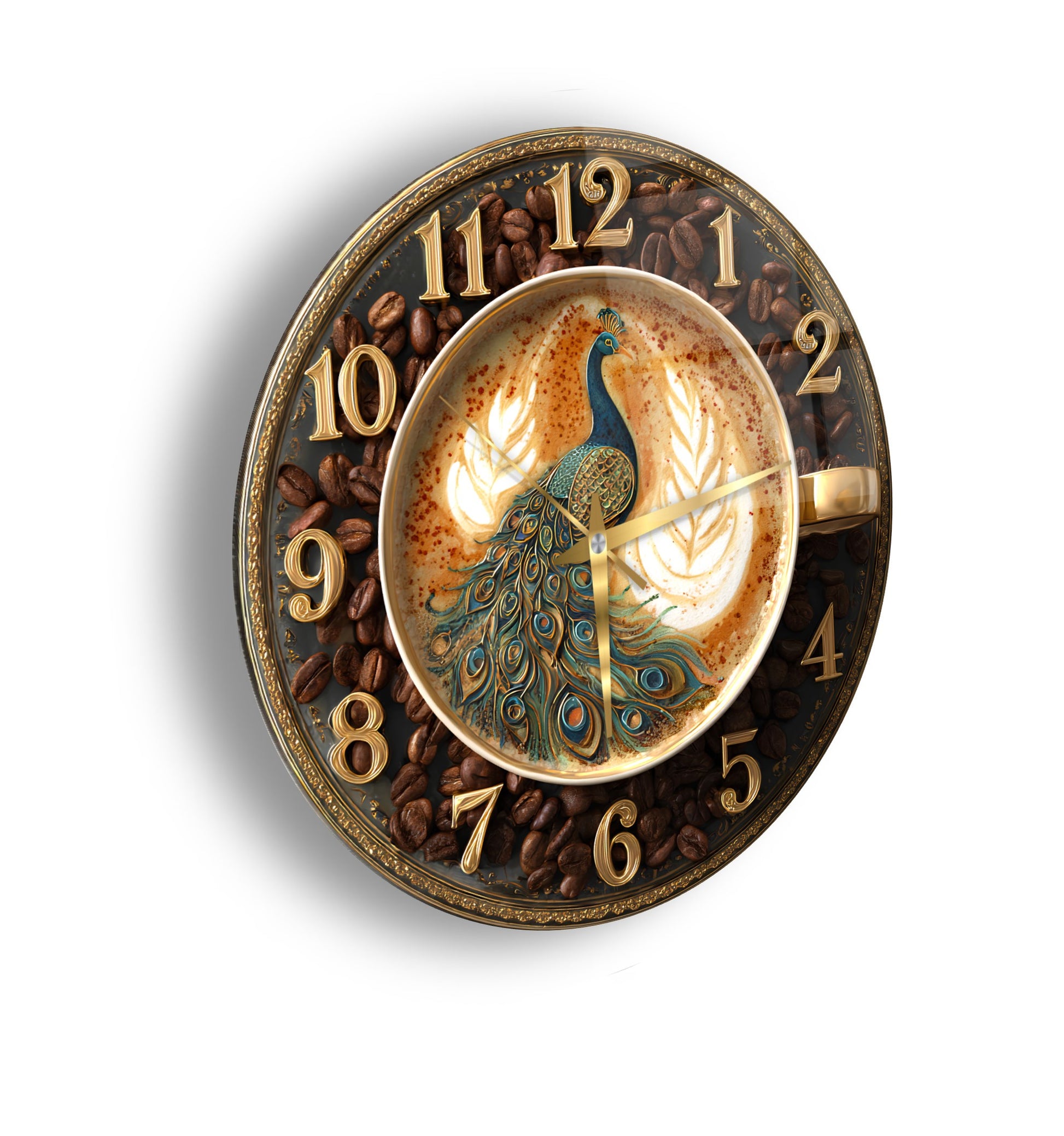 Kahve Çekirdekli Tavus Kuşu Cam Duvar Saati