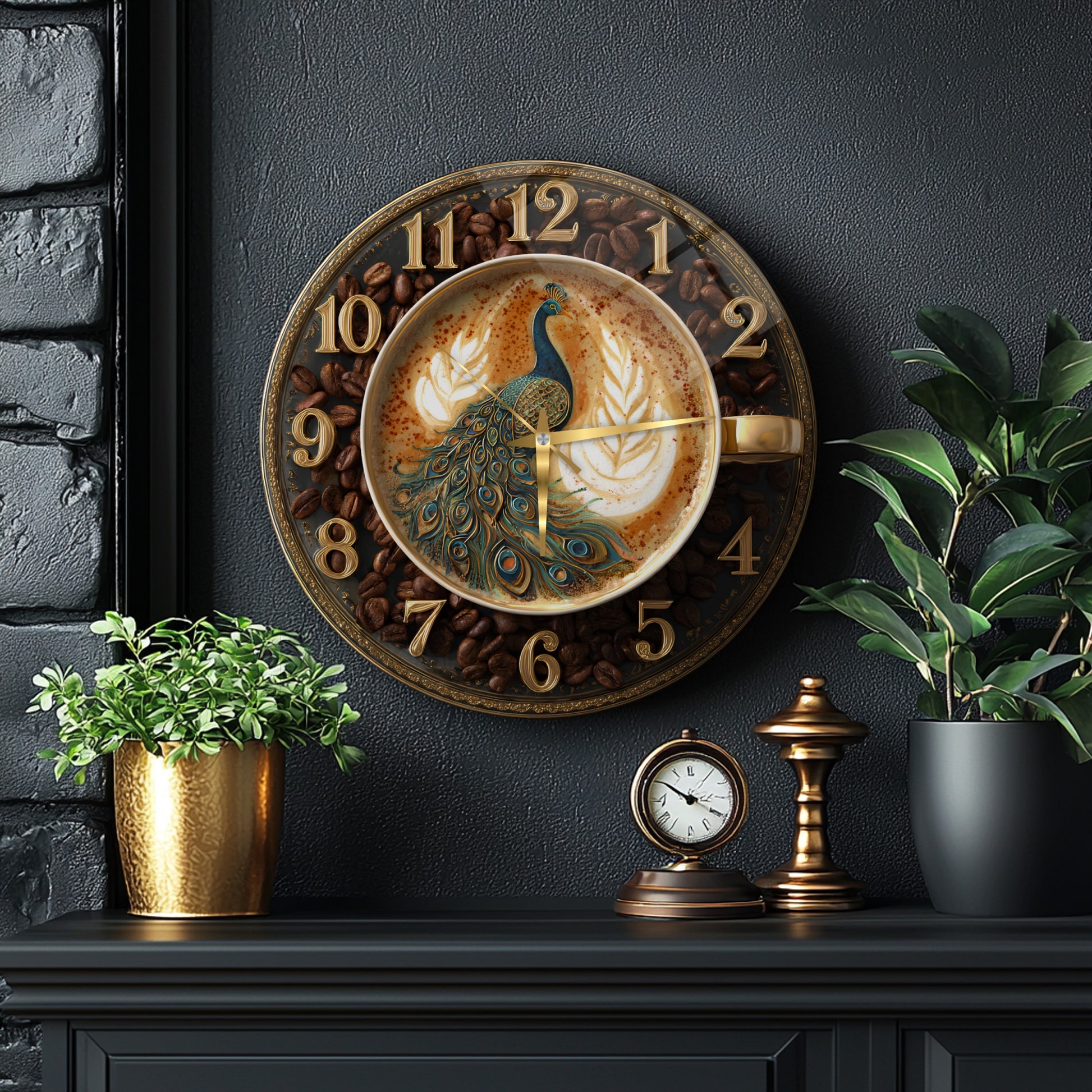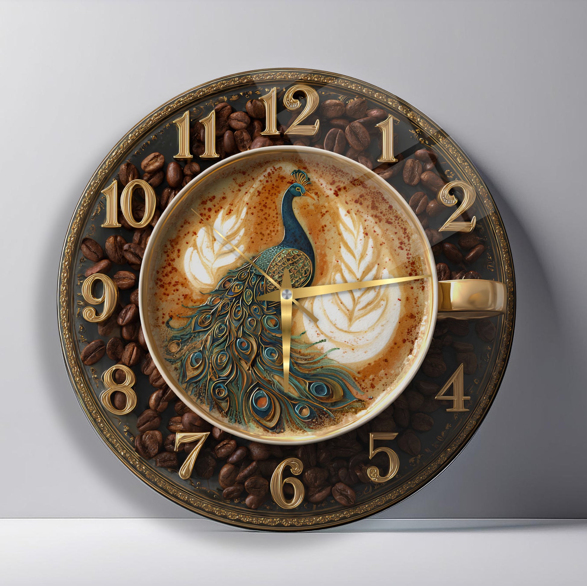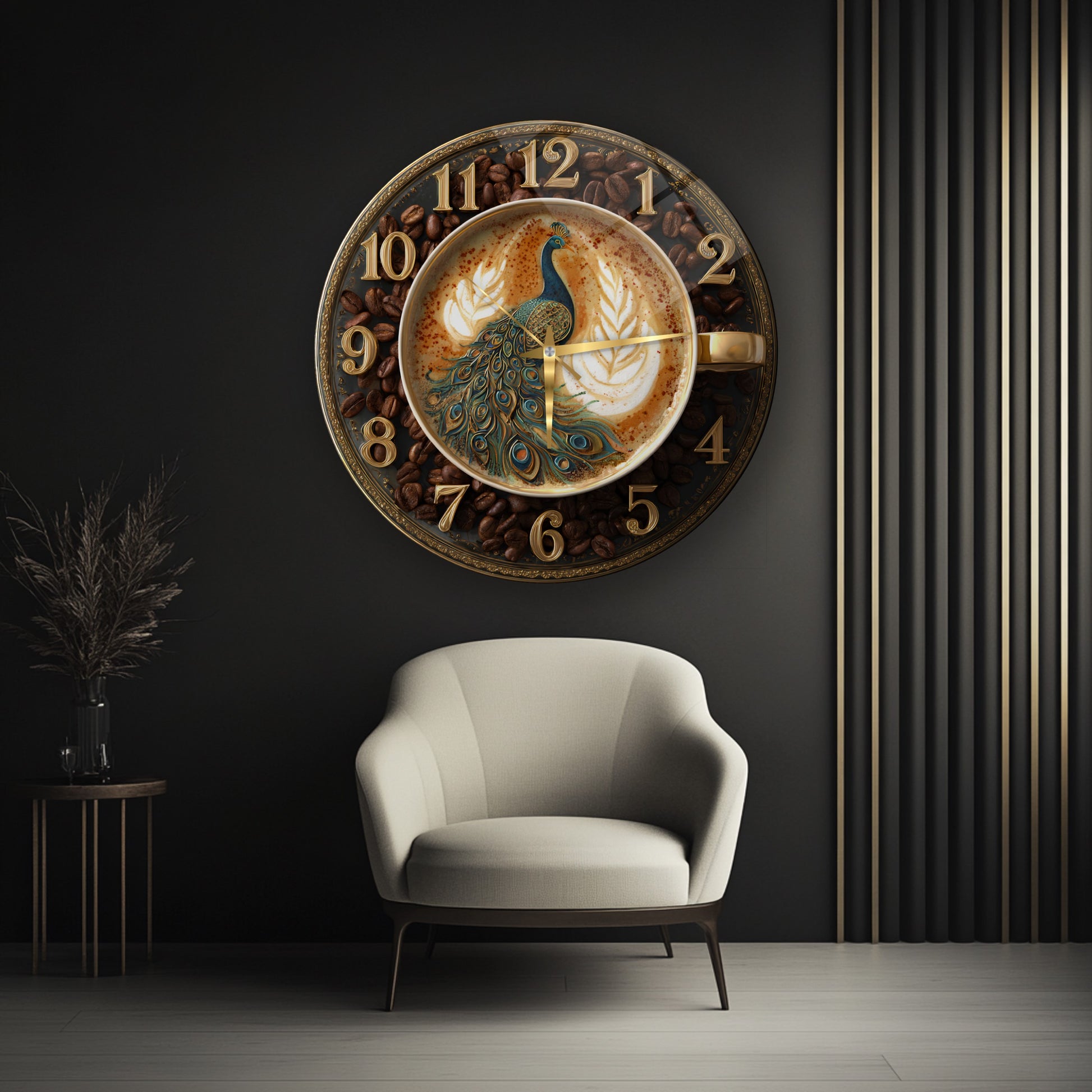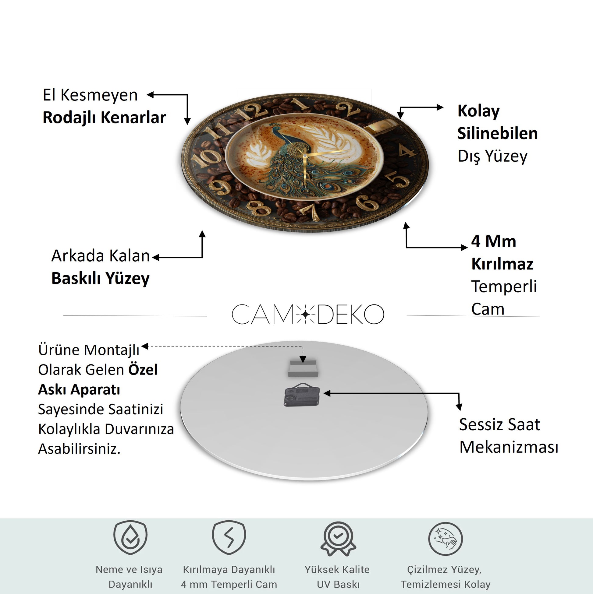 Kahve Çekirdekli Tavus Kuşu Cam Duvar Saati