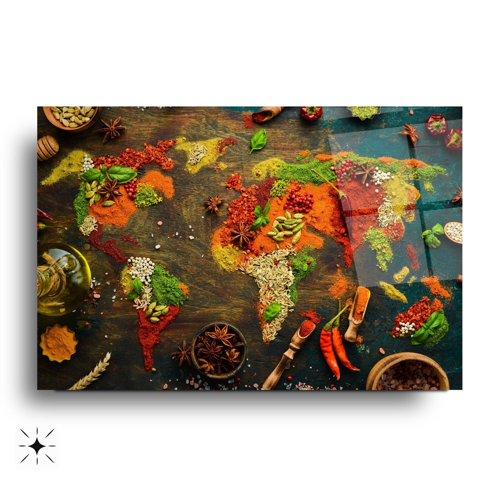 Bu modern gerçek cam tablo, en yeni nesil UV baskı teknolojileriyle hazırlanarak baharatların tüm canlılığını ve haritanın detaylarını eşsiz bir biçimde sunar. Yüksek dayanıklılık ve estetik görünümü bir arada sunan kırılmaz yapısıyla, olası darbelere karşı üstün koruma sağlar ve parlaklığını yıllarca korur. Özellikle cafe, restoran, aktar dükkanları, mutfak veya yeme-içme mekanları için ideal bir duvar dekorasyonu çözümüdür. Kolay temizlenebilir yüzeyiyle de pratik kullanım sunar. Şimdi CamDeko güvencesiyle mekanlarınıza lezzetli bir estetik ve modern bir dokunuş taşıyın!
